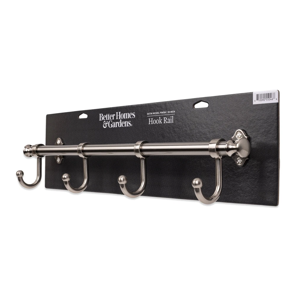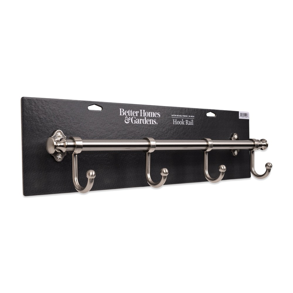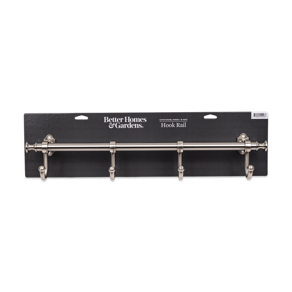 The Better Homes & Gardens hook rack is a stylish way to organize your living space. An elegant storage solution for your entryway, kichen, bedroom or anywhere additional hanging space is needed. Use this versatile hook rack to hang coats, hats, scarfs or other accessories. The satin nickel finish brings a touch of elegance with a warm silver undertone and smooth matte surface. This stunning, timeless style hook rail is also available in a matte black finish. Ideal for organizing coats, hats, scarves and other accessories Provides extra storage in an entryway, kitchen, bedroom, laundry room and more Timeless satin nickel finish with smooth matte surface Overall length 18 in Includes mounting hardware for quick, easy installation Product dimensions: 18 in. L x 3.25 in. W x 3.5 in. H