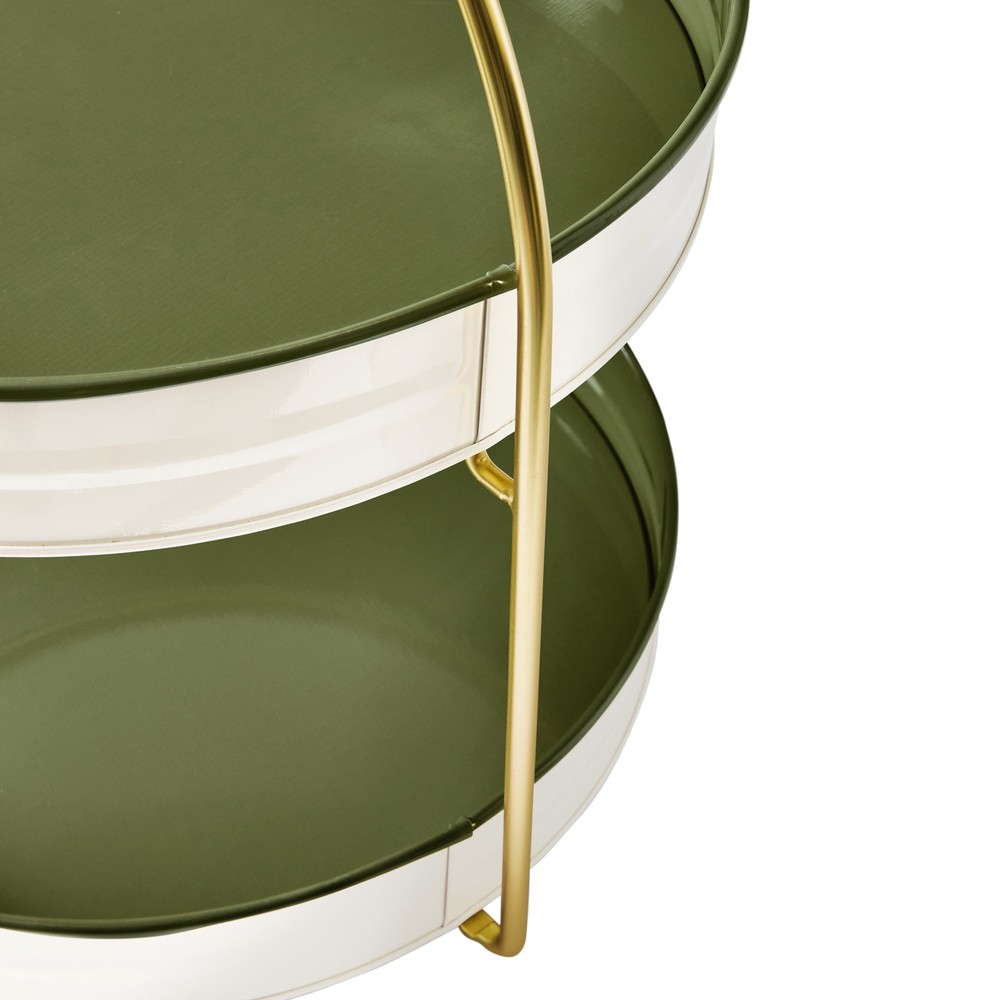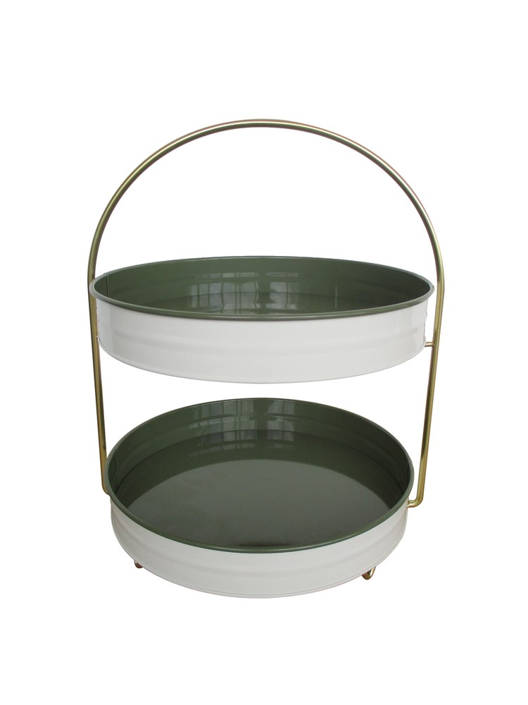 Upgrade your decor with the Better Homes & Gardens 2-Tier Serving Tray Stand. Whether you use this to display your beloved decor accents, as a stylish storage solution, or as a serving tray station for parties, function meets fashion with endless possibilities. This 2-tier serving tray stand matches and complements most decor styles with ease. The durable carbon steel frame offers a wonderfully rustic appeal that is sure to last for years to come — what a style score. 2-Tier serving tray stand is ideal for parties. Both trays are removable for versatile serving. Trays are made of galvanized steel with vanilla dream & dark cilantro coating and serving rack frame is made of durable carbon steel. Size: 13.14 IN W x 12.15 IN D x 15 IN H For indoor or outdoor use. No assembly required. For best care, hand wash only with non-abrasive material.
