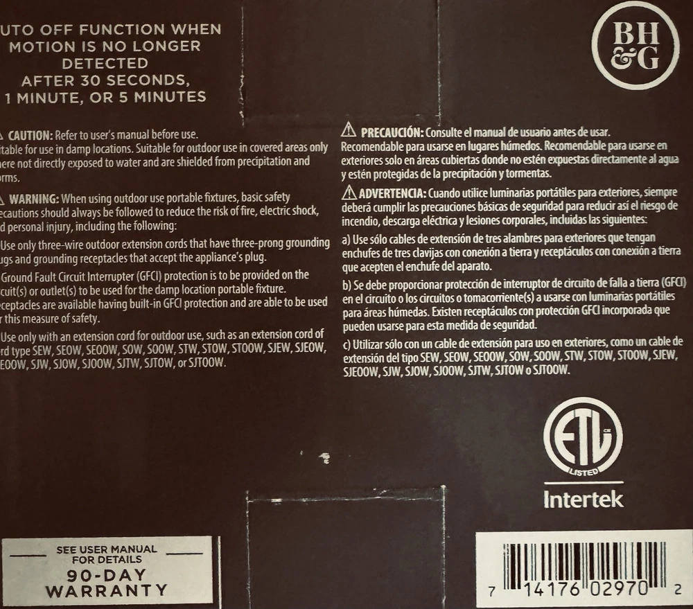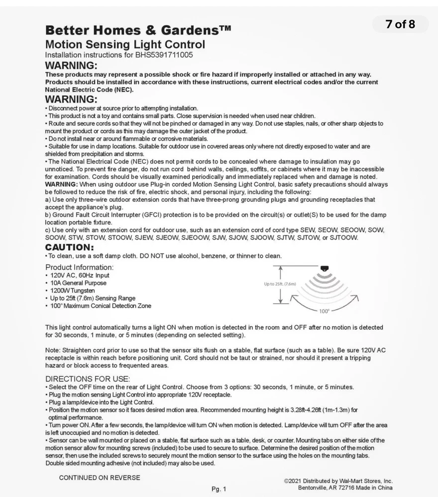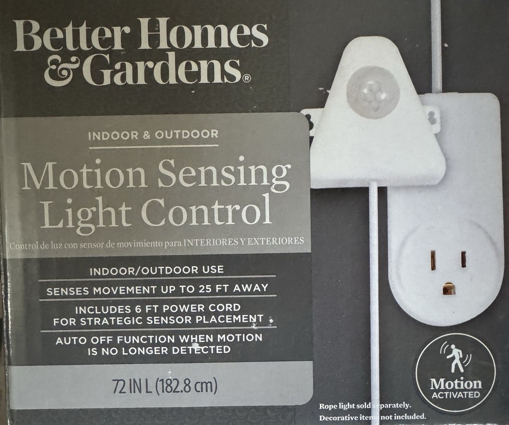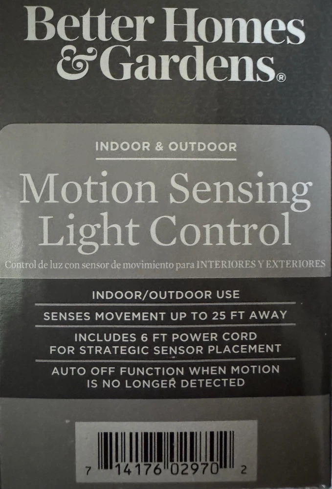 (for office use can be found in Box# 6) Enhance your home's security and convenience with the Better Homes & Gardens 4-inch Motion Sensing Light Control. This sleek white area light is designed for both indoor and outdoor installation, offering versatility in placement to suit your lighting needs. With a motion sensor activated by human presence, this light provides a hands-free experience, perfect for late-night entries or ambient illumination in your living space. The light is powered through a corded source, ensuring consistent and reliable performance. It features a single light source that is both energy-efficient and bright, illuminating your surroundings with ease. Whether for security purposes or simply for added comfort, this motion-sensing light control is an intelligent addition to your home or garden.