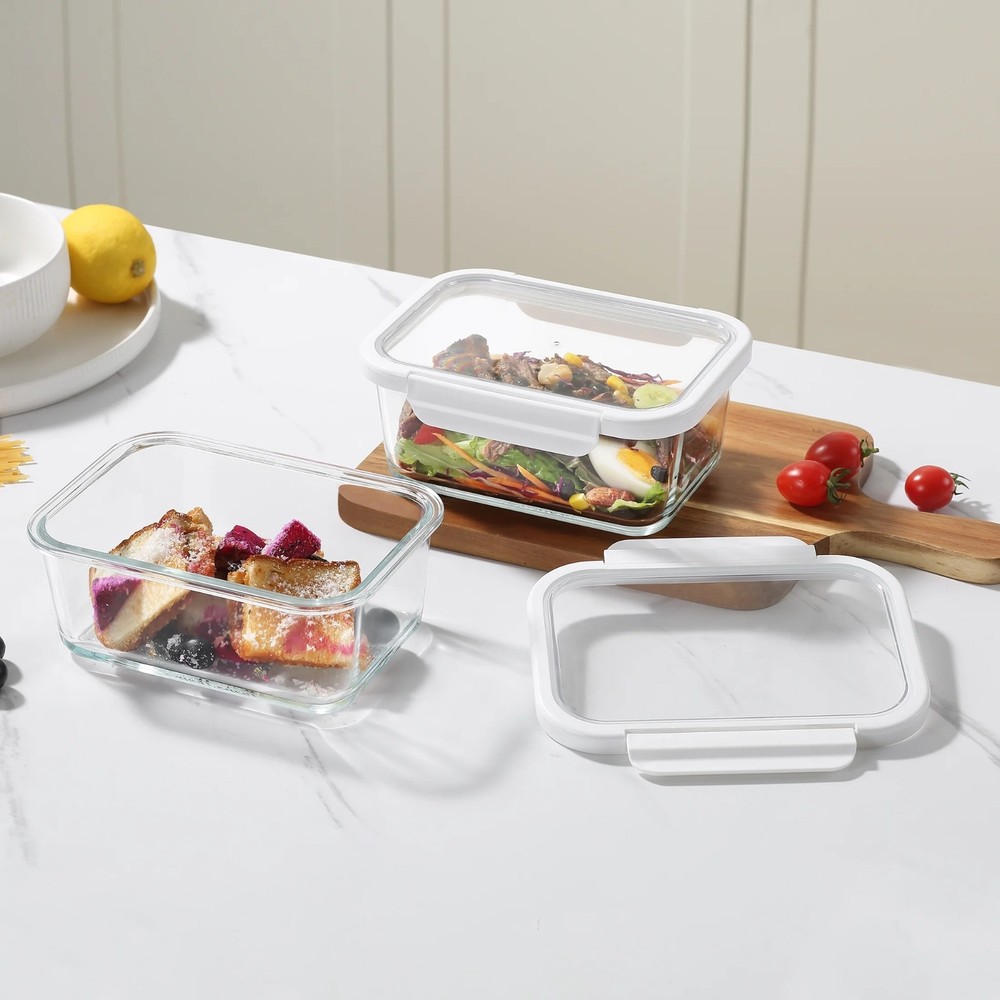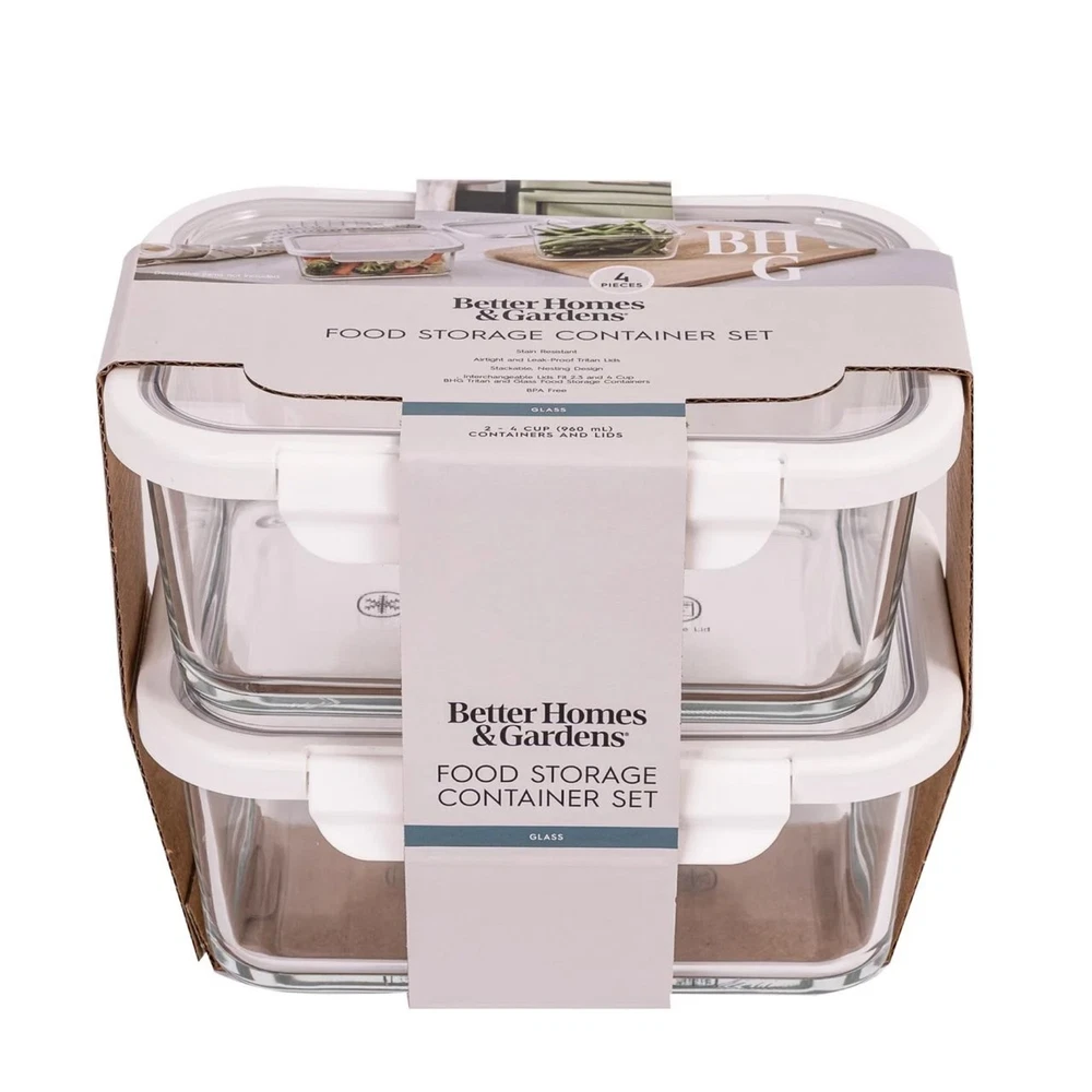 Better Homes & Gardens 4pc (set of 2) 4 Cup Rectangle Glass kitchen food storage containers with Tritan lids are the perfect solution to your food storing needs. Tritan lids help to keep leftover foods fresh until you are ready to eat. Glass can be heated up to 450℉. These food storage containers are microwave, freezer and top-dishwasher safe. BHG 4pc (set of 2) 4 Cup Rectangle Glass Containers with Tritan Lids BPA-free glass container is oven, microwave, top-rack dishwasher, and freezer safe. Do not put lid in the microwave or oven Product size: 7.3x5.48x3.06in each Interchangeable lids fit 2.3 cup and 4 cup BHG Tritan and Glass rectangle food storage containers Stackable, nesting design Stain Resistant