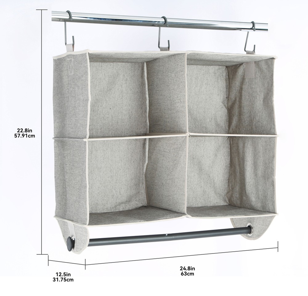 The Better Homes & Gardens 4-Shelf Hanging Closet Organizer for adult with Hanging Rack can help you use your closet space more efficiently. Crafted of durable gray fabric, this hanging organizer features four storage compartments that are perfect for folded clothing, sweaters, hats, socks, undergarments, and more and a hanging rack underneath for clothing stored on hangers, belts, ties, and other items. This handy closet storage system comes fully assembled and ready to hang off of existing closet rods with sturdy metal hooks. The Better Homes & Gardens 4-Shelf Hanging Closet Organizer with Hanging Rack is a great way to keep stored items neat, easily accessible, and off the floor. On May 18, 2025 at 19:29:48 PDT, seller added the following information: On Jun 5, 2025 at 02:48:53 PDT, seller added the following information: