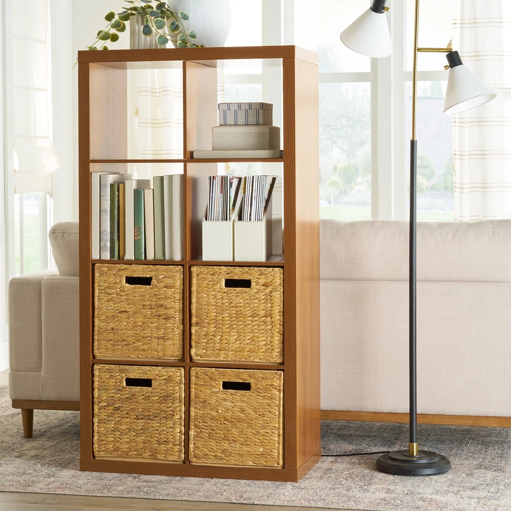 Add function and style to your home with the Better Homes & Gardens 8-Cube Storage Organizer. Available in multiple finishes, including both solid and wood grain options, this cube organizer features eight 13" x 15" x 13" compartments, the perfect size to display books, collectibles, photos, artwork, storage bins and baskets. An open back design makes it easy to manage cords and cables. This sturdy bookcase can stand vertically or horizontally to best suit your needs and space. The top panel supports up to 100 lbs when vertical and 150 lbs when horizontal. Combine it with other Better Homes & Gardens Cube Organizers and Cube Storage Bins (sold separately) to create a complete, customized storage and display system. Easy to assemble with included wall attachment safety system, the Better Homes & Gardens 8-Cube Storage Organizer is perfect for your office, living room, den, playroom and more. Features eight 13" x 15" x 13" compartments Modern, open back design for easy cord management Compatible with Better Homes & Gardens Cube Storage Bins (sold separately) Versatile design allows for vertical or horizontal placement Top panel can support up to 100 lbs when vertical or 150 lbs when horizontal; each cube supports up to 30 lbs Can be combined with other Better Homes & Gardens Cube Storage Organizers (sold separately) Materials: MDF, particle board Attaches to the wall with included safety strap Easy to assemble with included instructions and video assembly guide (hammer, Phillips head screwdriver & flat head screwdriver required) Finishes available: Textured White (BH61100005913WH), Tobacco Oak (BH61100005913TO), Light Honey (BH5336278612079), Rustic Gray (BHD036118664025), Charcoal (BH5336278612078) and Acorn (BH5336278612080) Site to Store Pickup Note: This item is packaged in one large box that may not fit in a standard-sized vehicle. Please make sure you have a large car or truck for store pickup. Package size: 58.27" x 8.78" x 18.5" (65.08 lbs) Assembled weight: 55.57 lbs Assembled dimensions: 30.16" W x 15.35" D x 56.77" H