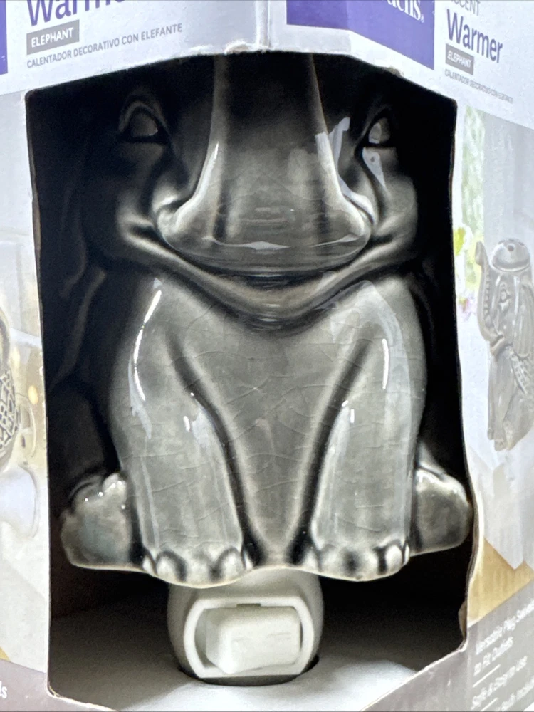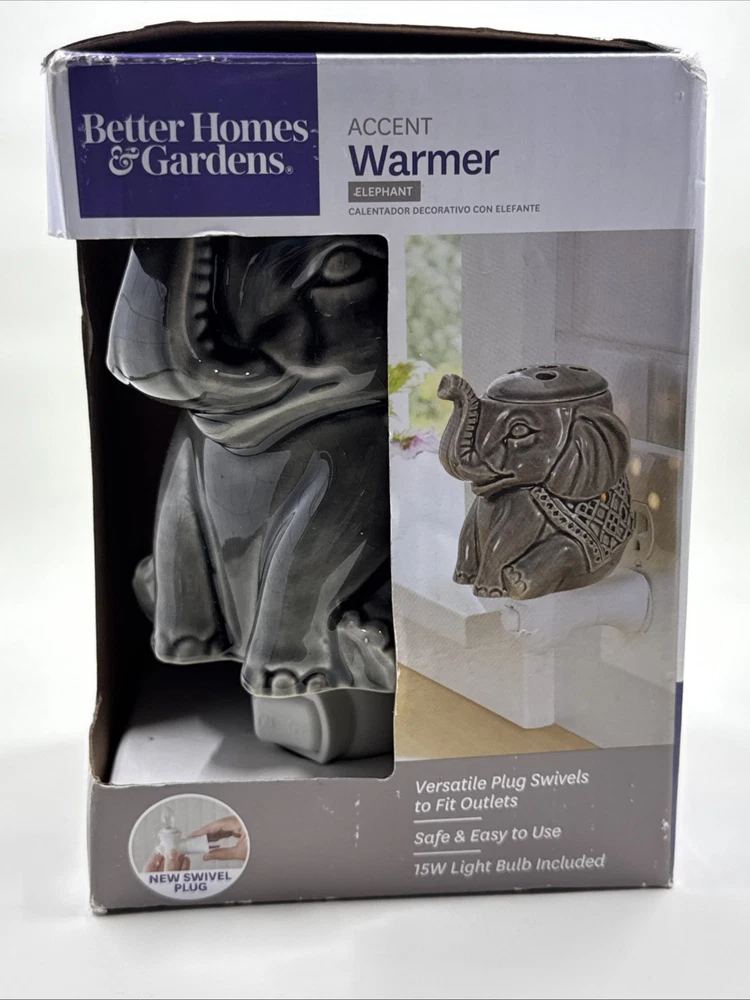 The Better Homes & Gardens Accent Wax Warmer in the shape of a beautiful elephant with its trunk up is a medium-sized wall plug-in wax warmer designed for aromatherapy. Made of ceramic and plastic materials, this African-themed wax warmer features a glossy gray finish and is manufactured by Better Homes and Gardens in 2016. It includes features like deodorizing, slow burning, and odor elimination, making it suitable for any room in the home to enhance the ambiance with a pleasant fragrance.