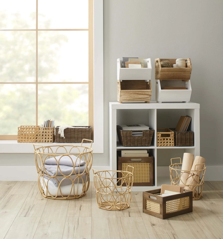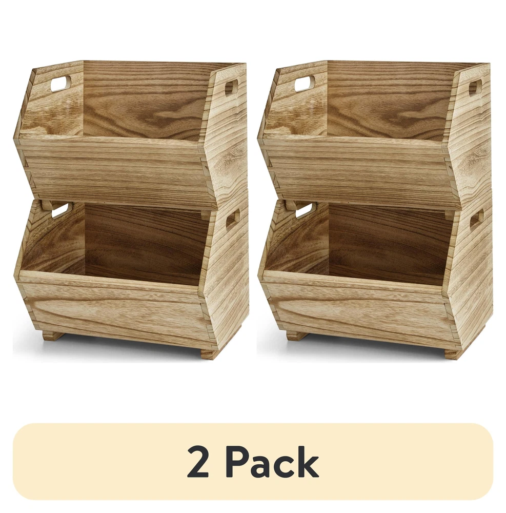 The Better Homes & Gardens Natural Wood Stacking Bin Set, 2-Piece allows you to tidy up your space in an attractive manner. These bins measure 11.02" L x 10" W x 8.27" H, and are sized to ideally be placed on a shelf, tabletop, or even the floor. You can stack them on top of one another to help conserve space or display them individually. Crafted of sturdy wood materials, these baskets are a great option for storing toiletries, cleaning supplies, remotes, small , books, and much more. These lovely baskets are designed with two reliable cut-out handles to easily carry and move your stored items. The Better Homes & Gardens Natural Wood Stacking Bin Set, 2-Piece is perfect for bringing more organization and order to any space. The versatile natural tone beautifully complements a wide variety of home décor styles. This item can also be stained for a DIY project. Includes two stackable baskets Cut-out handles for easy transport Durable wood construction Versatile natural tone Can be stained for DIY projects