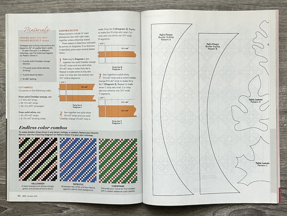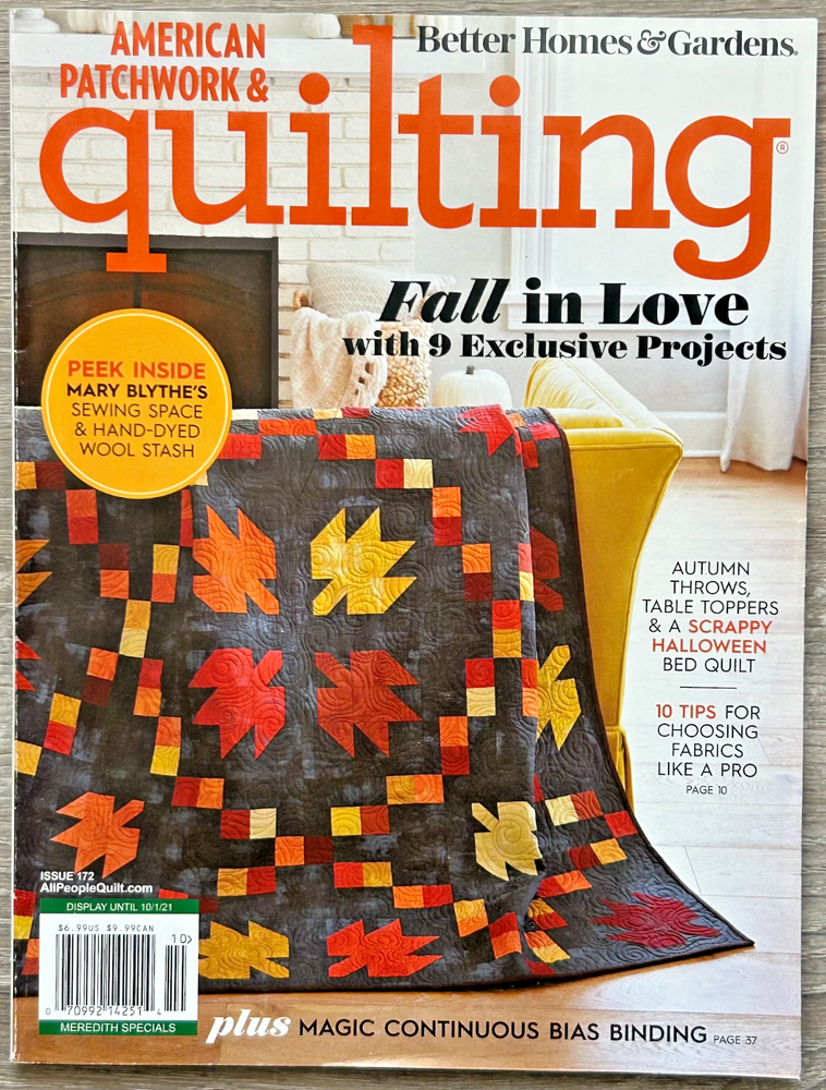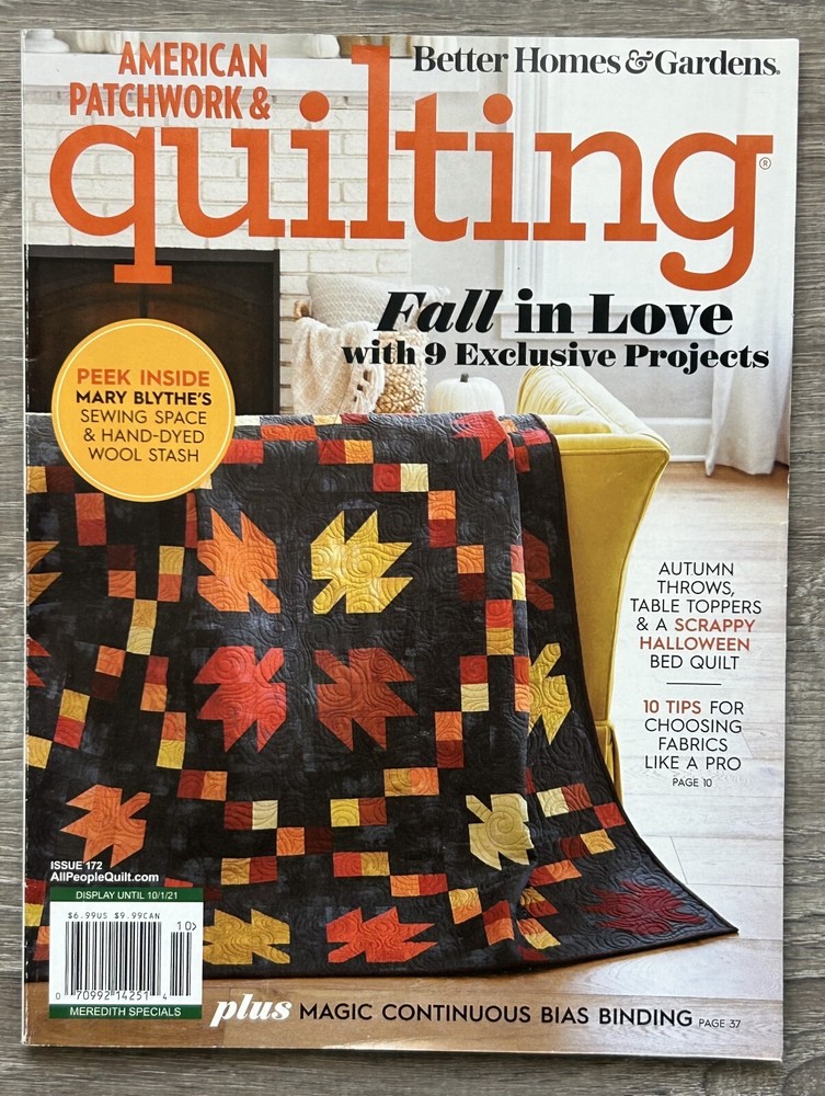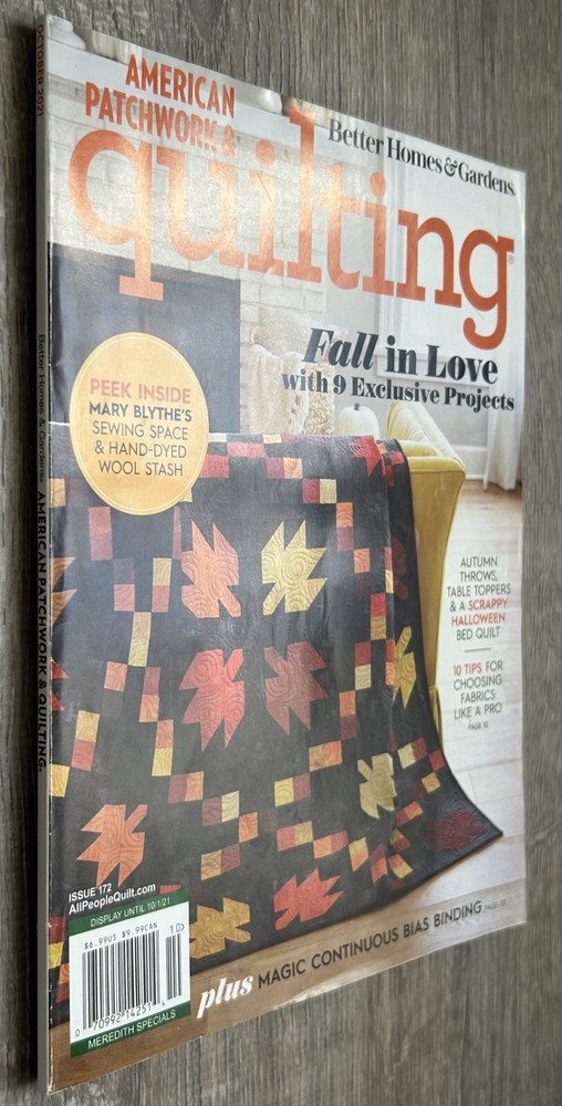 Occasion : Autumn Crafting, Halloween Projects, Cozy Sewing Days, Gift for Quilters, Seasonal Decor Fall projects, autumn throws, Halloween quilting, scrappy quilts, cozy crafts, Mary Blythe, bias binding, fall color palette Description: Fall in love with quilting season! This October 2021 issue of American Patchwork & Quilting features 9 exclusive fall-themed projects, a peek into Mary Blythe’s sewing space, scrappy Halloween quilts, and pro fabric tips. Features: Fall in love with quilting all over again—this issue is your cozy creative companion Previously read Cover is excellent Inside pages are excellent No rips or writing Like New. It's in excellent condition. All items are carefully photographed and stored in clear poly bags in a climate-controlled, pet-free, child-free, and smoke-free facility. If you have any questions or need additional information, please feel free to contact us.