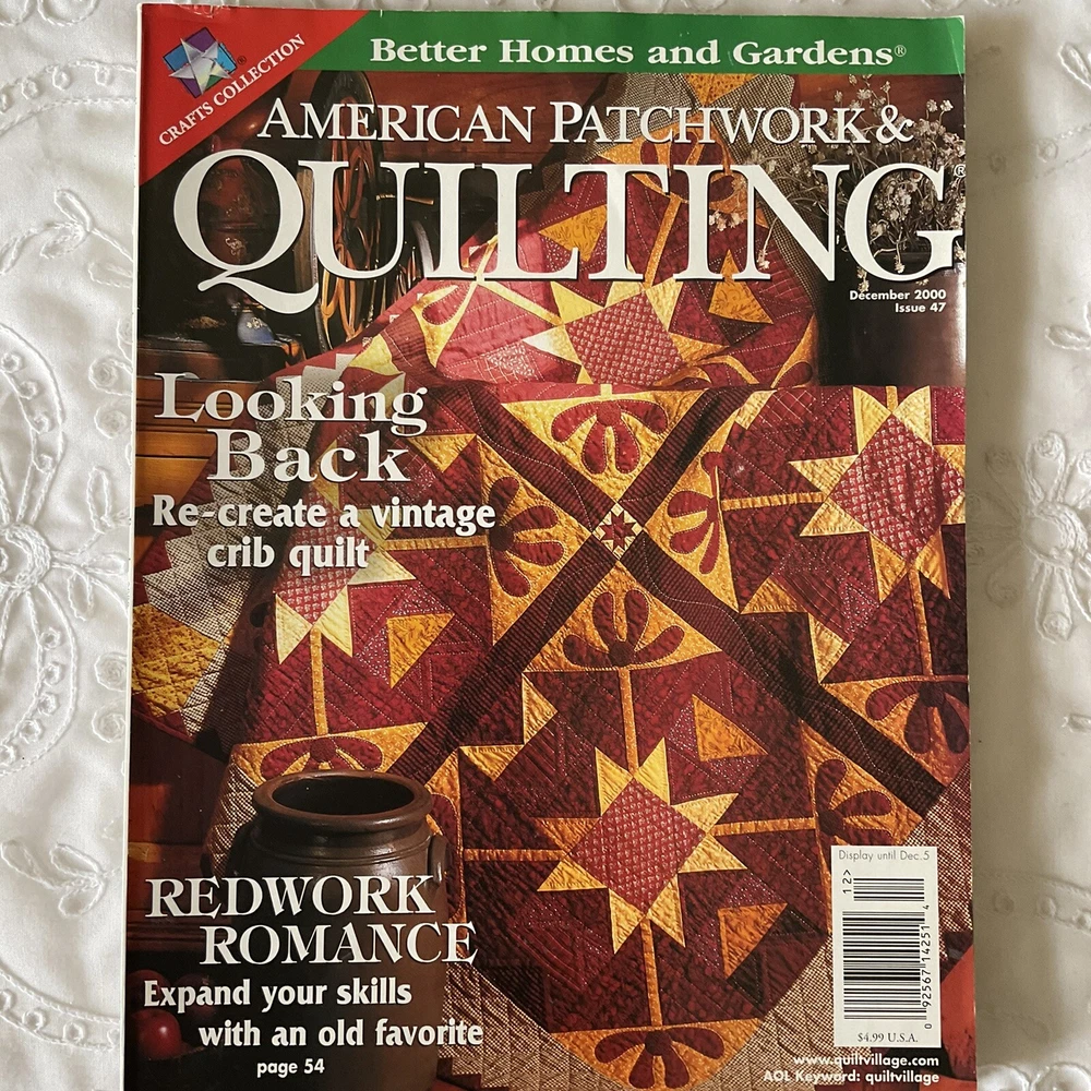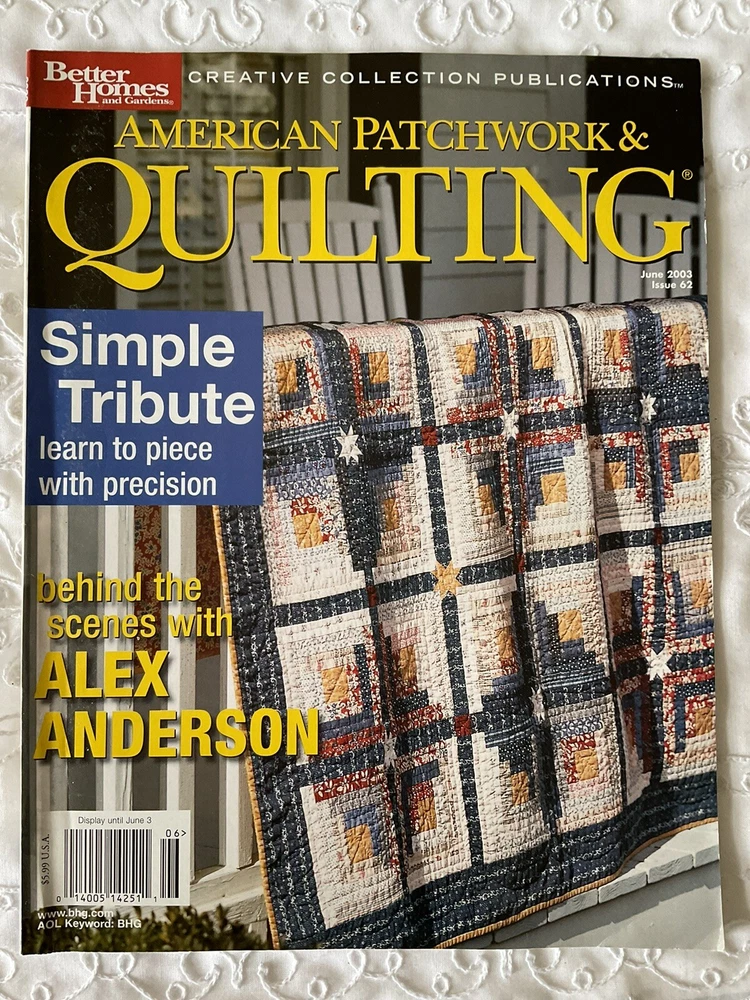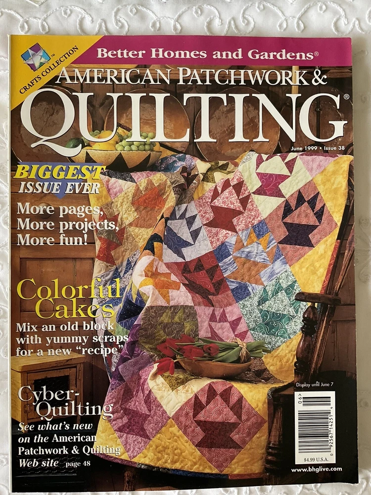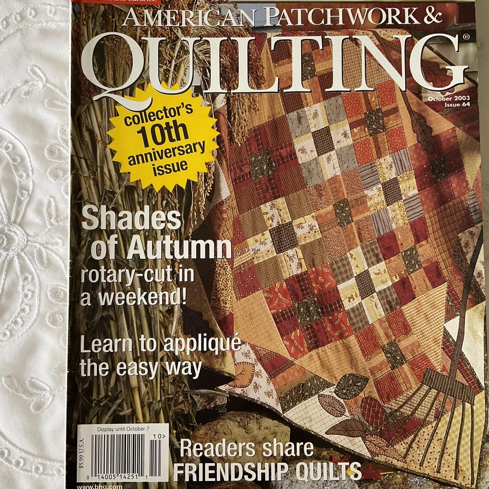American Patchwork & Quilting Magazines Lot of 4 Published in USA Published by: Better Homes & Gardens Editor in Chief: Beverly Rivers #1 Dated: Issue 62, June 2003 Details: 10 Projects and Techniques including - Tied-Edge Throw, Patchwork Throw, Strippy Throw, Colorful Kites, Twist and Shout, Simple Tribute, Round the Twist, Gather of Geese, Heading North, Morning Glories plus Features and Tips. #2 Dated: Issue 38, June 1999 Details: 11 Projects and Techniques including - I Love You, Colorful Cakes, Fannie's Flower Garden, Dutch Blue, Fanciful Fruit, With Friends in Mind, Star Chain, Glitter Gems, Flight of Fancy, Tracy's Quilt, Jewels in The Night, plus Features and Tips. #3 Dated: Issue 47, December 2000 Details: 7 Projects and Techniques including - Double Star, Bridging the Centuries, Red Radiance, Antique Peony, Looking Back, Liberty Garden, and Cold Hands, Warm Heart, Life Lessons in Quilting featuring Redwork. #4 Dated: Issue 64, October 2003 Details: Collectors 10 th Anniversary Edition. Shades of Autumn Please note: To receive a great savings in shipping charges, you may want to continue shopping and purchasing additional items. I am happy to combine purchase for you. Please make your purchases on the same day and wait to pay until you receive an invoice from me.