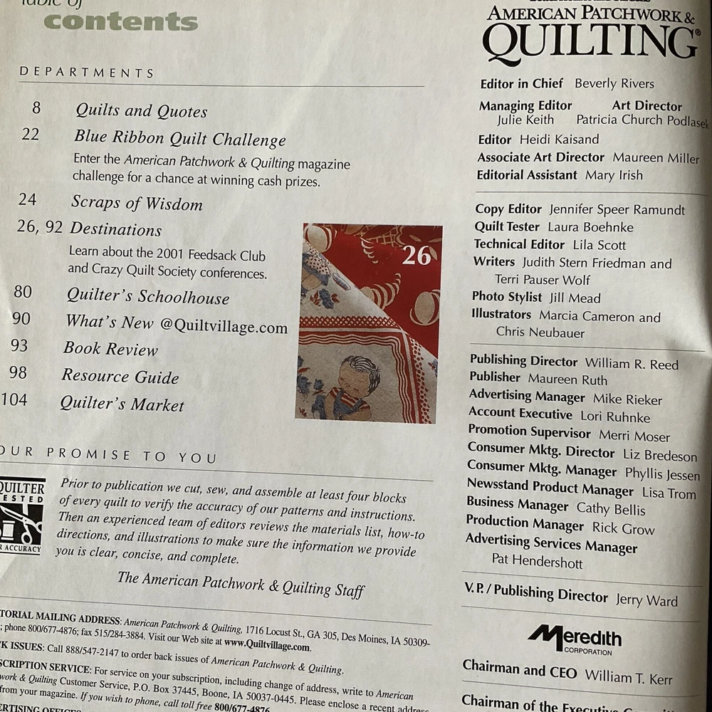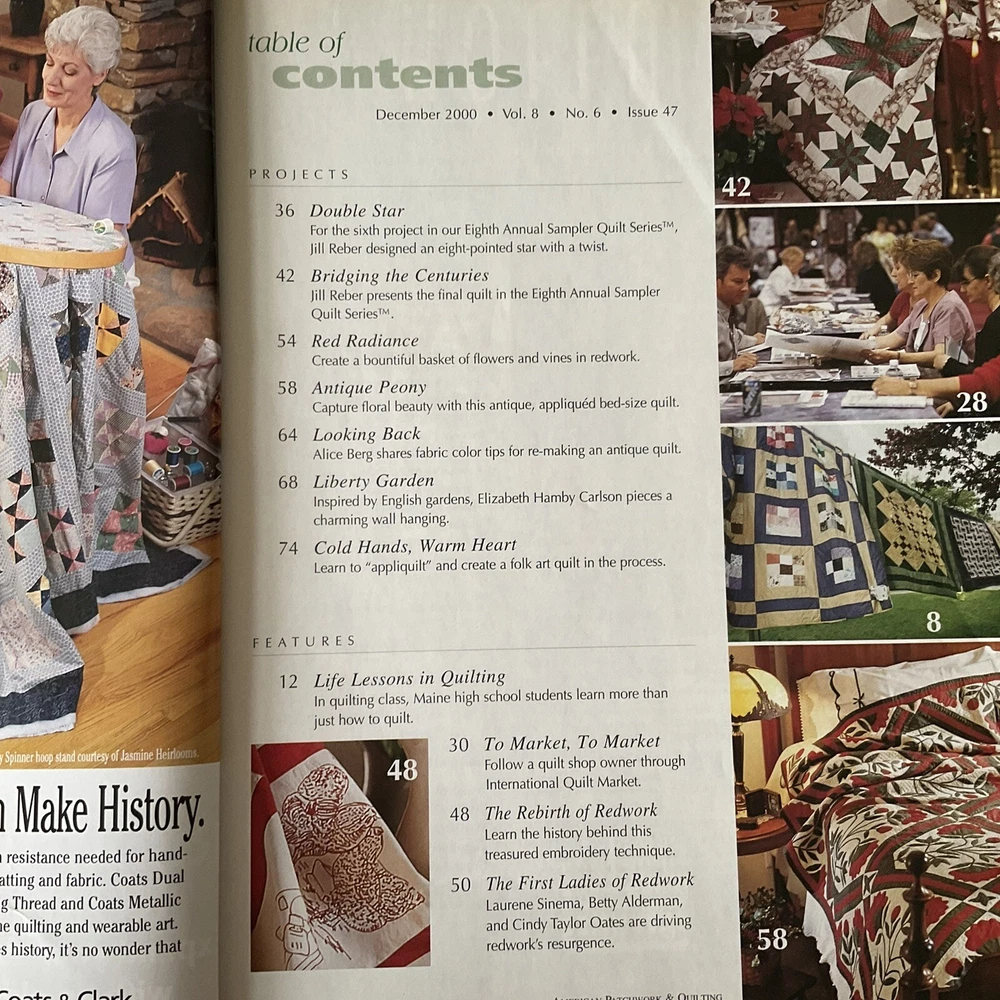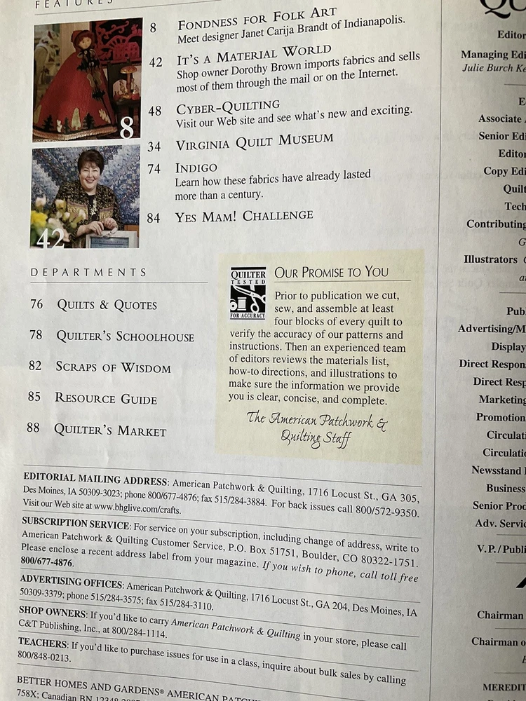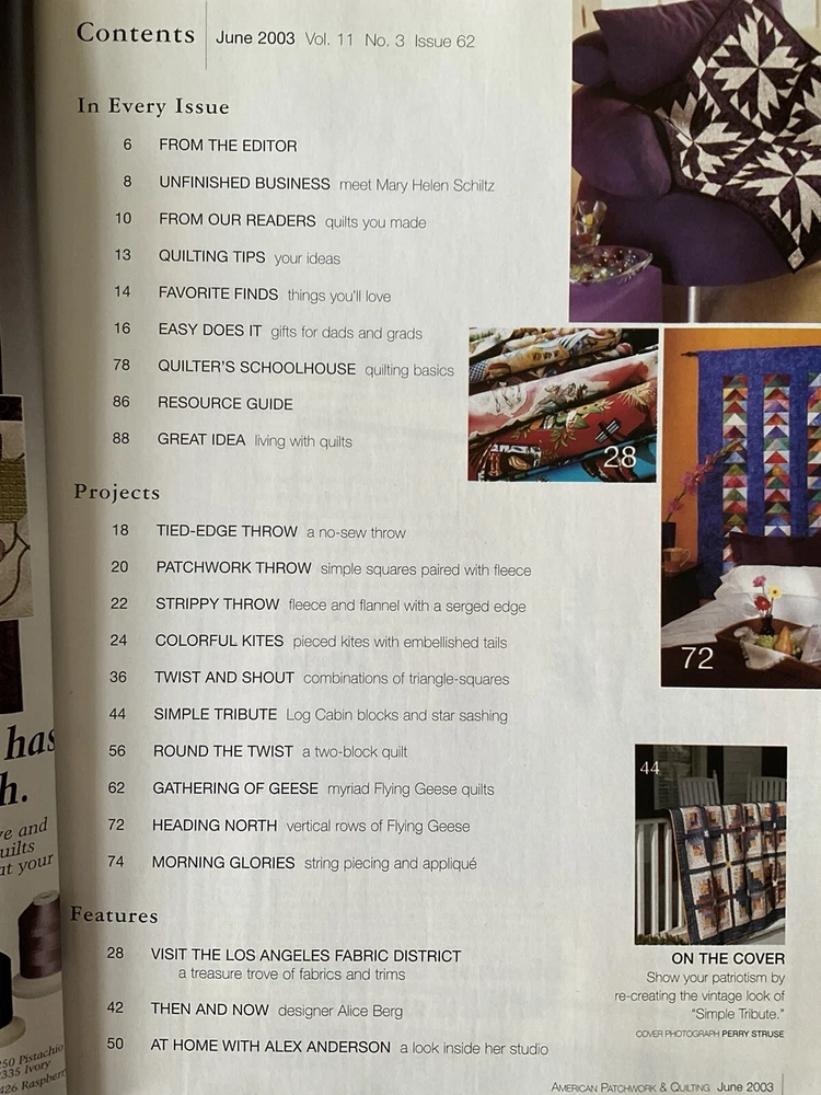 American Patchwork & Quilting Magazines Lot of 4 Published in USA Published by: Better Homes & Gardens Editor in Chief: Beverly Rivers #1 Dated: Issue 62, June 2003 Details: 10 Projects and Techniques including - Tied-Edge Throw, Patchwork Throw, Strippy Throw, Colorful Kites, Twist and Shout, Simple Tribute, Round the Twist, Gather of Geese, Heading North, Morning Glories plus Features and Tips. #2 Dated: Issue 38, June 1999 Details: 11 Projects and Techniques including - I Love You, Colorful Cakes, Fannie's Flower Garden, Dutch Blue, Fanciful Fruit, With Friends in Mind, Star Chain, Glitter Gems, Flight of Fancy, Tracy's Quilt, Jewels in The Night, plus Features and Tips. #3 Dated: Issue 47, December 2000 Details: 7 Projects and Techniques including - Double Star, Bridging the Centuries, Red Radiance, Antique Peony, Looking Back, Liberty Garden, and Cold Hands, Warm Heart, Life Lessons in Quilting featuring Redwork. #4 Dated: Issue 64, October 2003 Details: Collectors 10 th Anniversary Edition. Shades of Autumn Please note: To receive a great savings in shipping charges, you may want to continue shopping and purchasing additional items. I am happy to combine purchase for you. Please make your purchases on the same day and wait to pay until you receive an invoice from me.