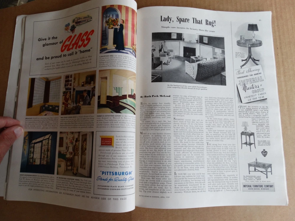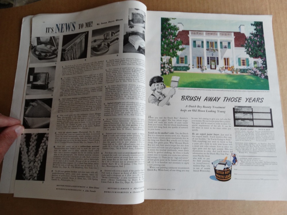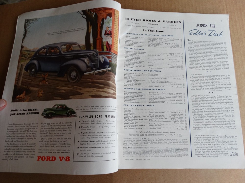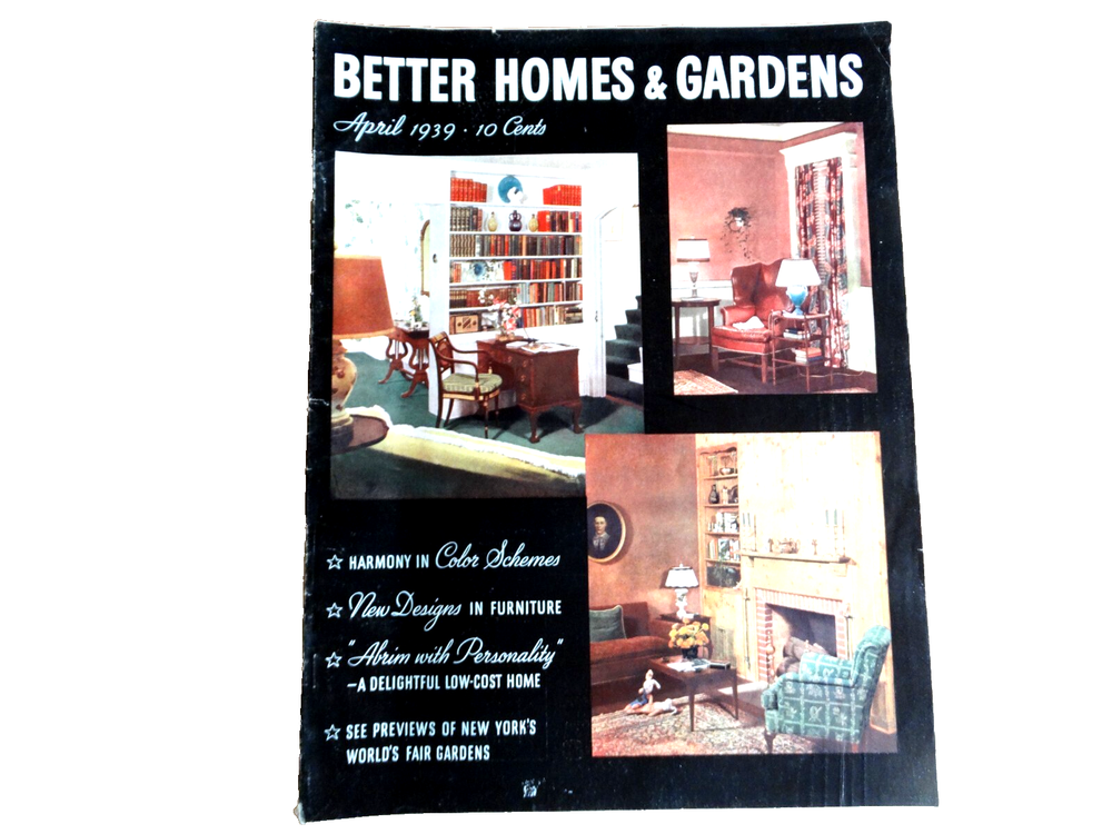 A classic magazine from the first half of the 20 th century! This is the April 1939 issue of Better Homes & Gardens. Cover articles include “ See Previews of New York World’s Fair Gardens .” The magazine contains 120 pages and measures approximately 9.75 x 12.75 inches. The magazine is like a “time capsule” to learn about home décor, gardening and interior design from the late 1930s. In addition, there are many vintage black & white and color advertisements. Better Homes and Gardens is the fourth best-selling magazine in the United States. The magazine focuses on interests regarding homes, cooking, gardening, crafts, healthy living, decorating and entertaining. The magazine is published monthly by the Meredith Corporation. It was founded in 1922 by Edwin Meredith, who had previously been the United States Secretary of Agriculture under President Woodrow Wilson. The original name was Fruit, Garden and Home from 1922 to 1924. The name was changed in 1925 to Better Homes & Gardens (and later to Better Homes and Gardens).