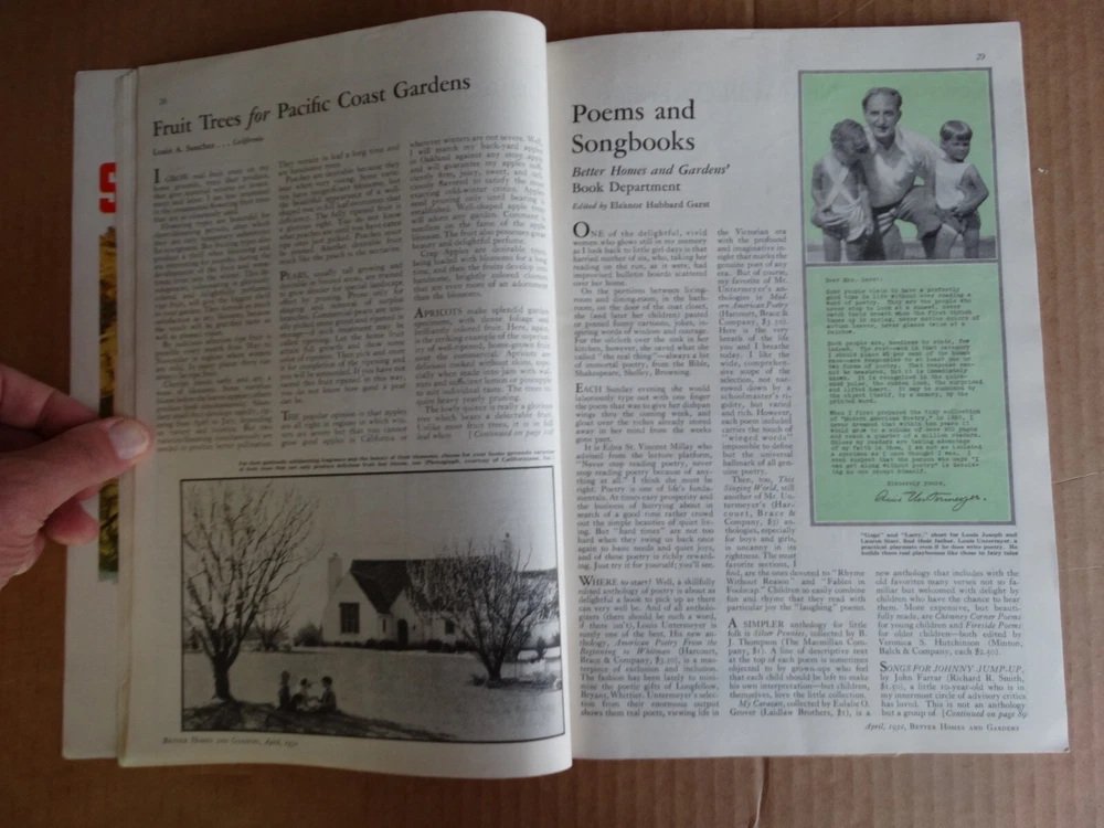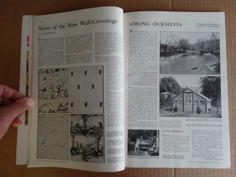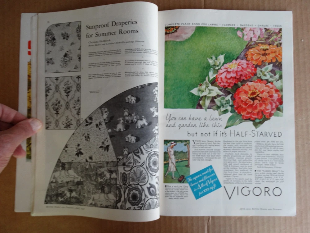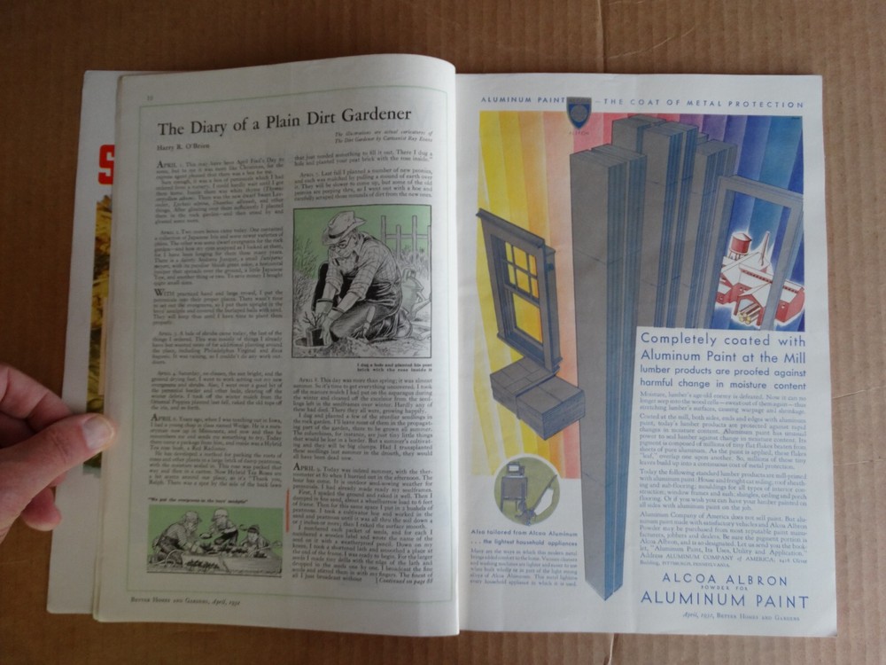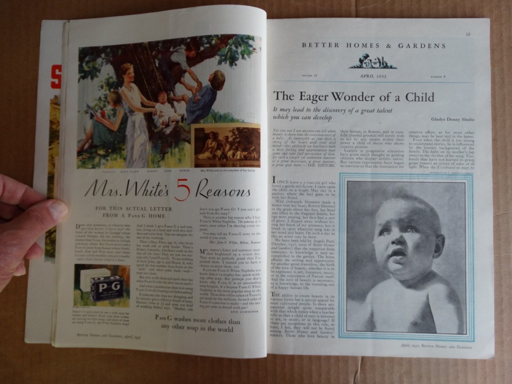 A classic magazine of the 20 th century! This is the April 1932 issue of Better Homes & Gardens. Its painted cover by Frederick V. Carpenter features three birds in a nest. The magazine is like a “time capsule” allowing the reader to learn about home design and interior design from the early 1930s. In addition, there are many vintage black & white and color advertisements. This issue originally contained 112 pages and measures approximately 8.5 x 12 inches. Better Homes and Gardens is the fourth best-selling magazine in the United States. The magazine focuses on interests regarding homes, cooking, gardening, crafts, healthy living, decorating and entertaining. The magazine is published monthly by the Meredith Corporation. It was founded in 1922 by Edwin Meredith, who had previously been the United States Secretary of Agriculture under President Woodrow Wilson. The original name was Fruit, Garden and Home from 1922 to 1924. The name was changed in 1925 to Better Homes & Gardens (and later to Better Homes and Gardens).