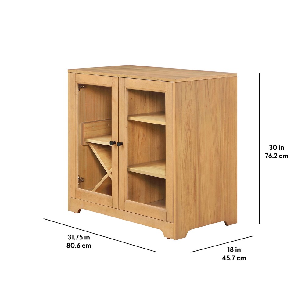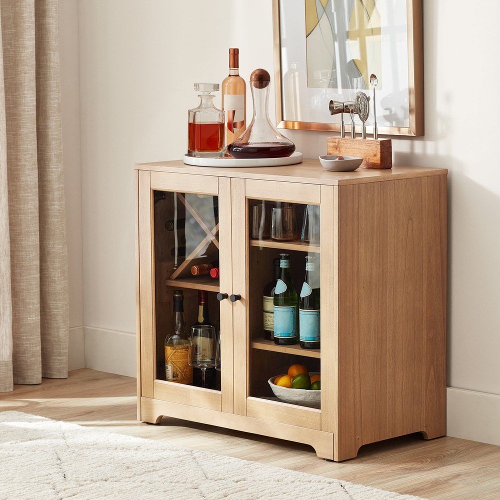 Update the look of your home with this Better Homes & Gardens Aster Bar Cabinet by Dave & Jenny Marrs. Featuring a natural oak finish, this bar cabinet has clean lines and a timeless design that will revitalize any space. Designed with slow-close hinges, it features adjustable shelves and removeable wine storage. Easy to assemble, this bar cabinet is durably constructed out of quality materials. Coordinate it with other artisanal home pieces from the Dave & Jenny Marrs collection. This Better Homes & Gardens Aster Bar Cabinet by Dave & Jenny Marrs will add effortless style to any room. From book cases to TV stands, Better Homes and Gardens furniture is designed to help you organize your home. Look for a new dresser for your clothes, display your favorite books with a bookcase or create your home office with a desk and a cube organizer. You'll also find kitchen and dining tables and chairs, living room furniture and kid s furniture. Better Homes & Gardens Aster Bar Cabinet, Natural Oak Finish, by Dave & Jenny Marrs Ratchet tool is included Dimensions: 31.75" L x 18" W x 30" H Sturdy bar cabinet made of solid rubber wood, MDF, and PB Easy to assemble Features adjustable shelves and removeable wine storage With slow-close, European hinges and black textured knobs Weight: 99.2 lbs Clean lines and a timeless design will revitalize any space Coordinate with other furniture from the Better Homes & Gardens by Dave & Jenny Marrs collection