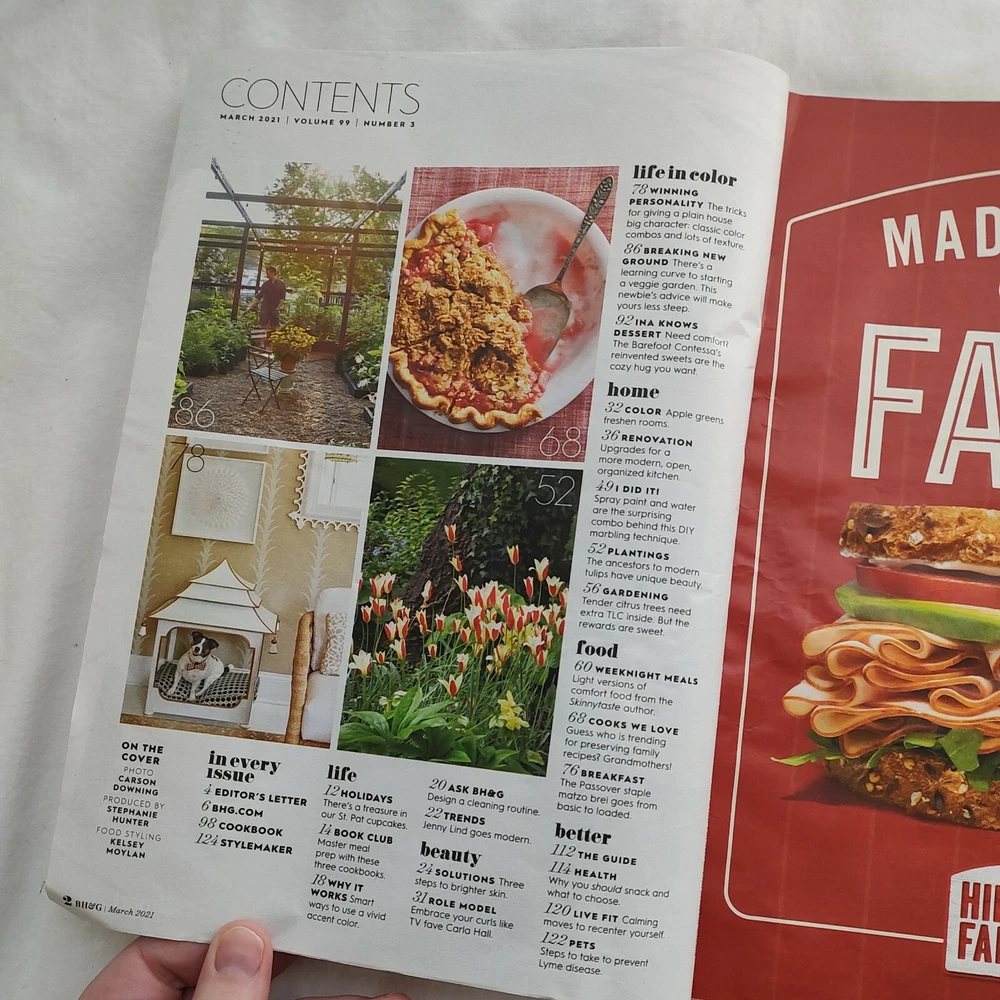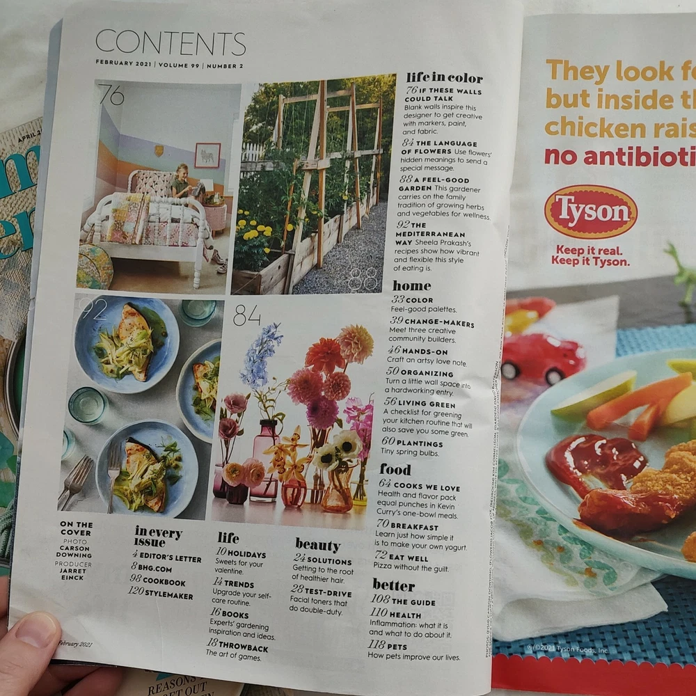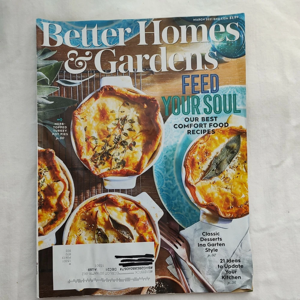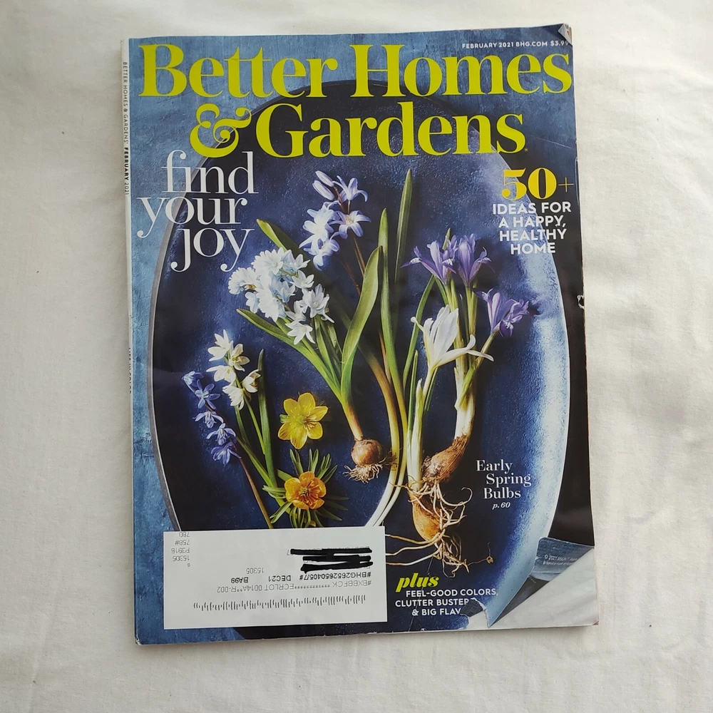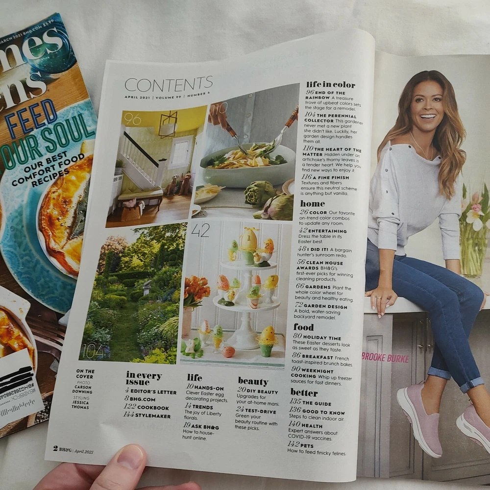 The product is a physical magazine titled "Better Homes & Gardens BHG Magazine" published by Meredith Corporation. It includes three issues for January, February, and March 2021, focusing on spring and Easter themes. The magazine is in English, with illustrations, and falls under the genres of Home & Garden and Holiday. Contributors include several columnists, and it is published monthly with the option for subscription. This magazine is manufactured in the United States.