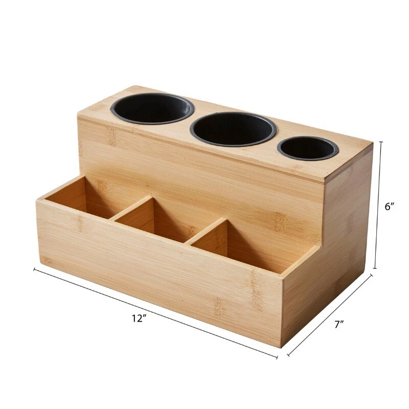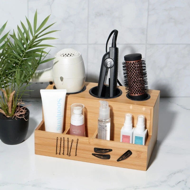 The Better Homes & Gardens Natural Bamboo Hair Tools Organizer is a stylish and practical way to keep your hair styling tools organized and easily accessible. It has six compartments of varying sizes to accommodate different types of hair styling tools such as hairbrushes, combs, hair dryers, and curling irons. The organizer is made of natural bamboo which is durable, eco-friendly, and easy to clean. The dimensions of the organizer are 12 inches x 6 inches x 7 inches. It is compact and lightweight, making it easy to move around and store. The organizer’s sleek and modern design will complement any bathroom decor. It is perfect for people who want to keep their hair styling tools organized and within reach. Better Homes & Gardens Bamboo Hair Tools Organizer Natural Bamboo Clean-lined modern aesthetic 6 Compartments Rectangle shape