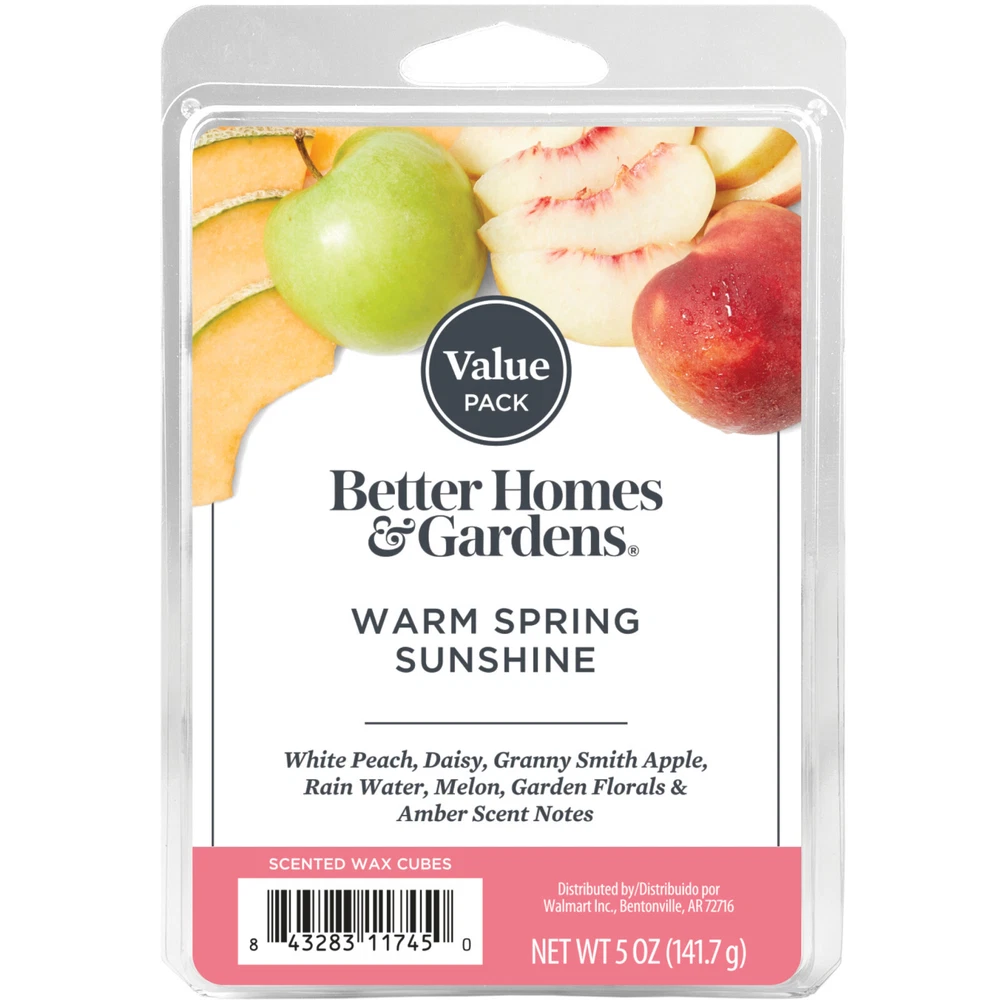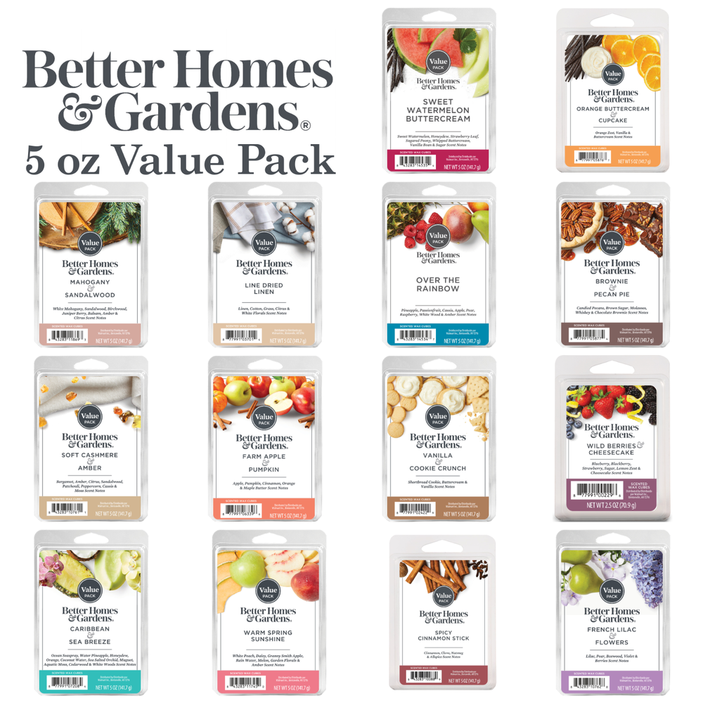 PLEASE READ - Some listings are for 2 smaller (2.5oz) packs. They are the same weight and amount of cubes as the value packs are. Better Homes & Gardens 5 oz or 2 x 2.5oz Scented Wax Melts are for use in an electric wax warmer and release a soothing highly fragrant scent into the air immediately upon melting. They are ideal for spreading a relaxing scent and welcoming atmosphere throughout your home. Simply break off a piece and add it to your favorite electric wax warmer. Highly fragranced Releases a soothing fragrant scent Replace wax melts when the fragrance is gone Easy cleanup No flame or soot residue Wax can be recycled or reused Use with Fragrance Wax Warmer ( Sold Separately) Assortment of Better Homes & Gardens Scented Wax Melts & Fragrance Warmers available