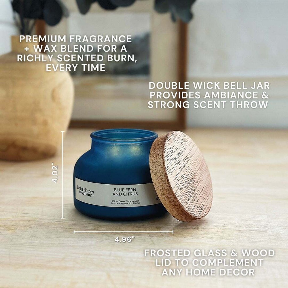 Better Homes & Gardens Blue Fern and Citrus Scented 2-Wick 18oz (510.3 g) Frosted Jar Candle – Emitting a warm, golden light, this candle fills your space with an indulgent fragrance. Notes of citrus, green, floral, amber, moss, and woods create a delightful atmosphere. The frosted glass jar with a carbonized printed wood lid houses a paraffin wax blend ideal for various rooms and décor styles. Crafted with care, this candle features a printed frosted glass design with a 2-wick design for a consistent, pleasant burn experience. Its versatile, contemporary style seamlessly integrates with any décor. Scent notes: Citrus, Green, Floral, Amber, Moss & Woods Includes: 18oz (510.3 g) Frosted Bell Jar Candle Wicks: 2 Wax: Paraffin Wax Blend Burn Time: 52 Hours Why you’ll love it: Customers will love this candle for its inviting fragrance, stylish design, and consistent burn, making it a versatile choice for enhancing any space. Fragrance Pro Tip: Let the wax harden before relighting, touching, or moving. Country of Origin: Imported Dimensions: 4.96" (w) x 4.02" (h) Fill weight: 18oz (510.3 g)., Item Weight: 2.40 lb.