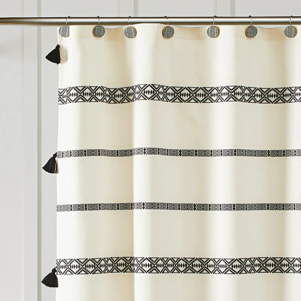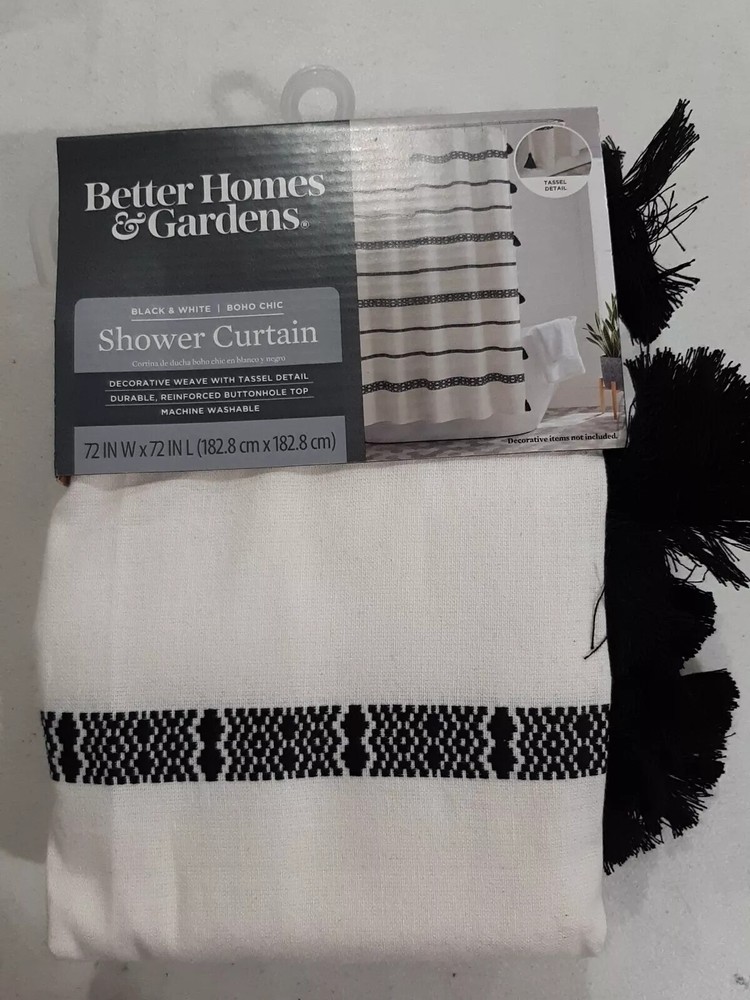 New in Package Better Homes & Garden Brand Shower Curtain Boho Chic Design Black & White 72 in W x 72 in L (182.8 cm x 182.8 cm) 100% Cotton Decorative Weave with Tassel Detail Durable Reinforced Buttonhole Top Machine Washable Tassels accent with Stripe Design **Requires Liner & Shower Curtain Hooks SOLD SEPARATELY** Thanks for Looking! Please check out my other listings!