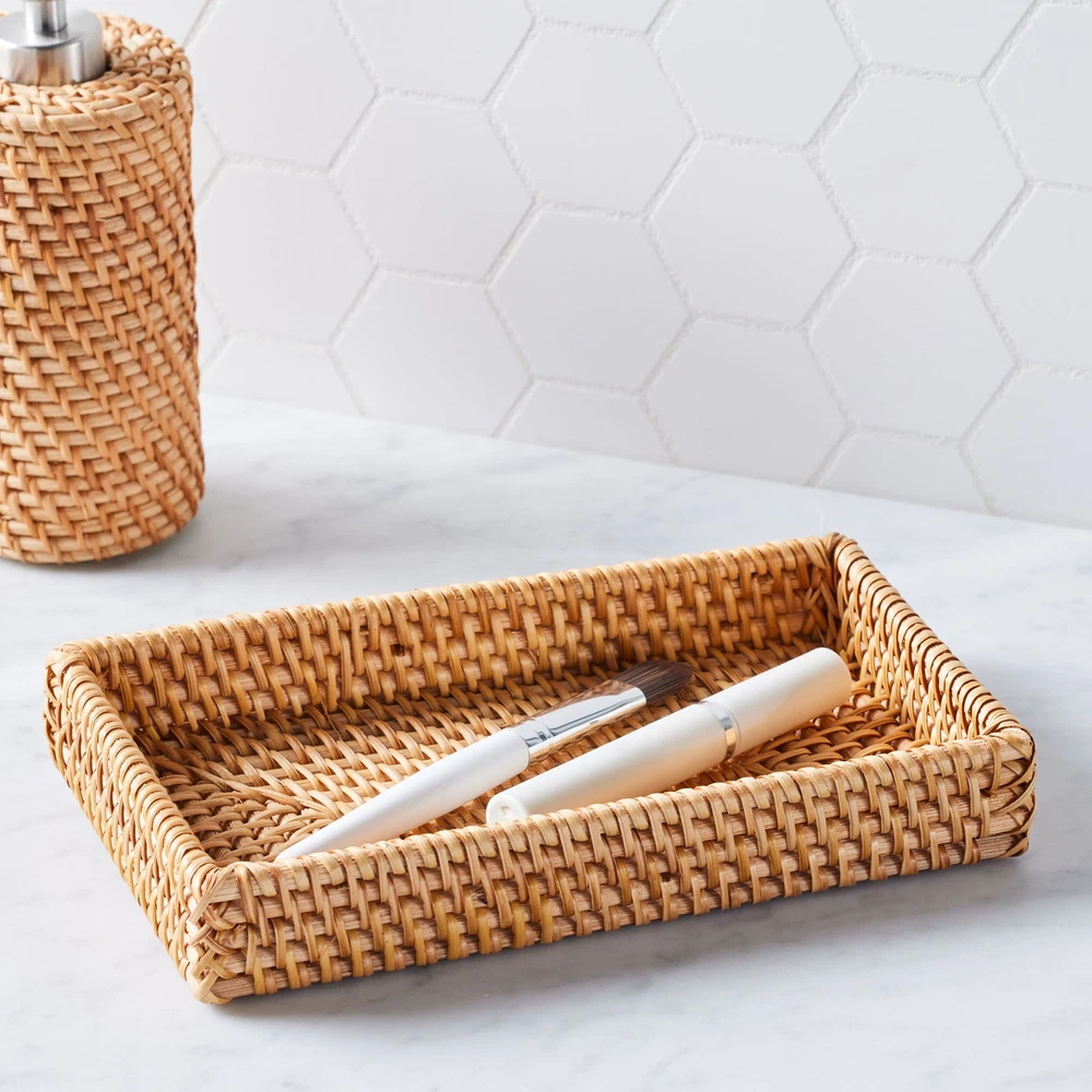 Transform your bathroom into a beautifully organized space with the Better Homes & Gardens Rattan Bathroom Tray. Crafted from durable, woven polyethylene rattan, this tray combines functionality with effortless style. Designed to keep your countertops and vanity tidy, it provides a convenient and attractive way to store your cosmetics, toiletries, and everyday essentials. The raised edges ensure items stay securely in place, preventing spills or clutter. Its natural woven texture adds a warm, inviting touch, complementing a variety of bathroom decor styles—from modern and minimal to cozy and rustic. Whether you use it to organize your morning routine essentials or as an elegant display for decorative accents, this tray is a practical and charming addition to any bathroom space. Better Homes & Gardens Rattan Bathroom Cosmetic & Toiletry Tray Beautiful Honey Color Perfect for bathroom and decorative storage Dimensions: 5"W x 9"L