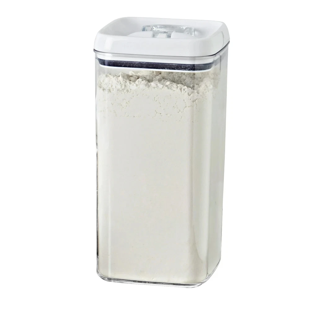 Better Homes & Gardens Canister Pack of 4, Flip-Tite® Square Food Storage Container Set Keep your kitchen countertops organized with Better Homes & Gardens Flip-Tite® Food Storage Containers. It is a handy item to have in your kitchen or pantry. These food storage containers are great for storing dry foods, such as flour, dried beans, pasta, and more. They're made without Bisphenol-A (BPA) to ensure the safety of your food. The see-through container makes it easy to identify the contents at a glance without having to label each canister. Open them with ease and stack one or more on top of the other for space-saving storage. This 4 pack set includes 1 of 6.2-cup small square food storage container, 1 of 10.1-cup medium square food storage container, 1 of 13.8-cup large square food storage container, 1 of 19-cup square tall food storage container and 4 lids. Always wash before first use and remove seal from lid before wash. Allow all components to dry thoroughly before next use. Container and lid are dishwasher safe, the silicone seal is hand wash. Not Microwave safe. Do not carry Flip-Tite® Container by the lid. Better Homes & Gardens 4 Pack Flip-Tite® Square Food Storage Container Set: 4 Airtight Containers with Easy Open Lids Ideal for storing dried beans, lentils, flour, and snacks Stackable for space saving organization Top rack dishwasher safe BPA Free Durable Material This set contains 1 of 6.2-cup container, 1 of 10.1-cup container, 1 of 13.8-cup container, 1 of 19-cup container and 4 lids Great for use in the garage, sewing room, and more Dry food storage only Features Stackable Brand Better Homes & Gardens Color Clear Size 4 Canisters Assembled Product Dimensions (L x W x H) 6.10 x 17.30 x 12.20 Inches