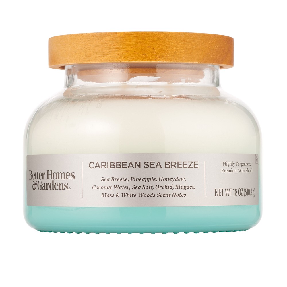 Product details This 18 oz 2-Wick ombre jar glass candle with a wooden lid from Better Homes & Gardens is filled with a specially crafted soy wax that is poured to create a consistent and pleasant burn experience. The features a soothing fragrance that transports you to the Caribbean as ocean seaspray, water pineapple, and honeydew captivates the senses. Coconut water, sea orchid, and muguet lead into aquatic moss and white woods in the base for a tranquil feel. The contemporary ombre printed glass design is wonderful to use in a variety of settings and is sure to match and complement your existing décor. Scent Notes: Sea Salt, kelp, lavender, Vetiver, Tobacco, Musk 18 oz. of fragranced premium soy wax blend, poured in Minnesota, USA. Burn time up to 40-hours. Ombre colored jar, 2 wicks A selection from the woody and musk scent-family.
