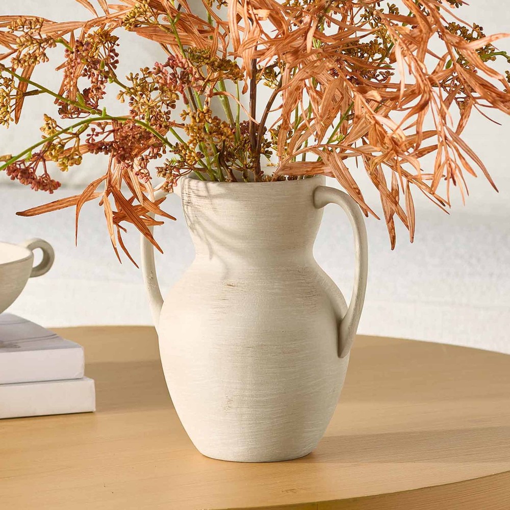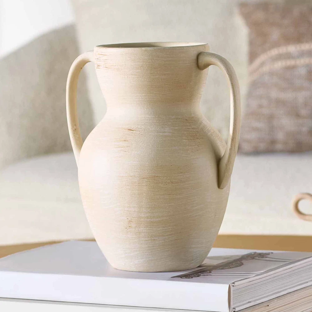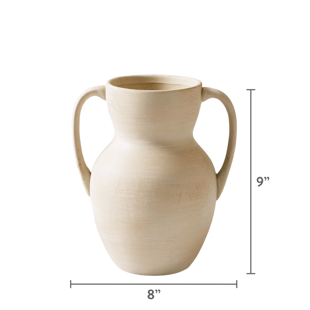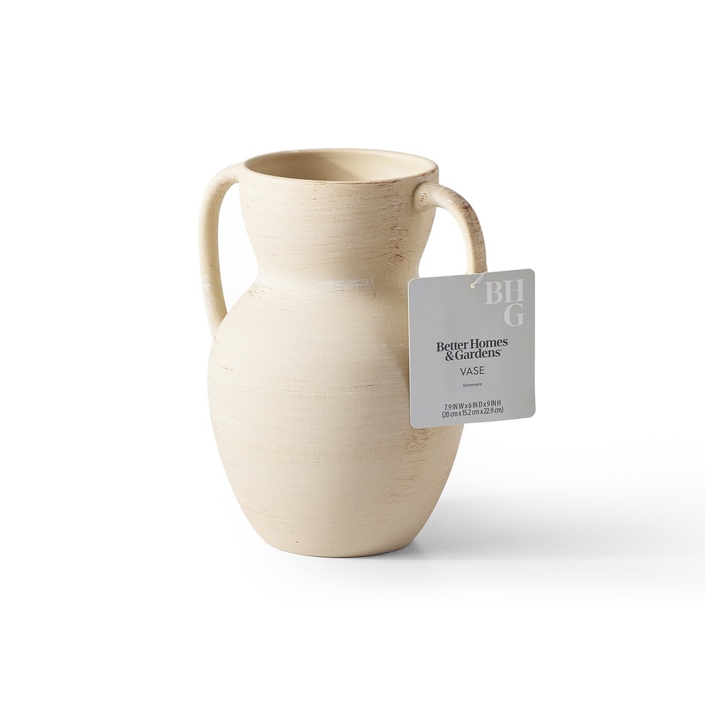 Add character and craft to your home with Better Homes & Gardens Ceramic Handled Distressed Vase. Distressed texture and a neutral taupe color enhance its earthy charm, comfortably matching in a rustic farmhouse to a minimalist apartment. Two handles make for an elegant shape. Fill it with dried flowers or your favorite branches for a striking look, or it doubles as a beautiful sculptural piece when empty. Only at Walmart. Material: Stoneware Dimensions: 6'' D x 8.75'' H Includes: One decorative vase Care: Wipe clean Country of Origin: Imported Features: Two side handles; distressed texture Designed for: Display as is or add your favorite flowers; indoor use only Ceramic Handled Distressed Vase from Better Homes & Gardens