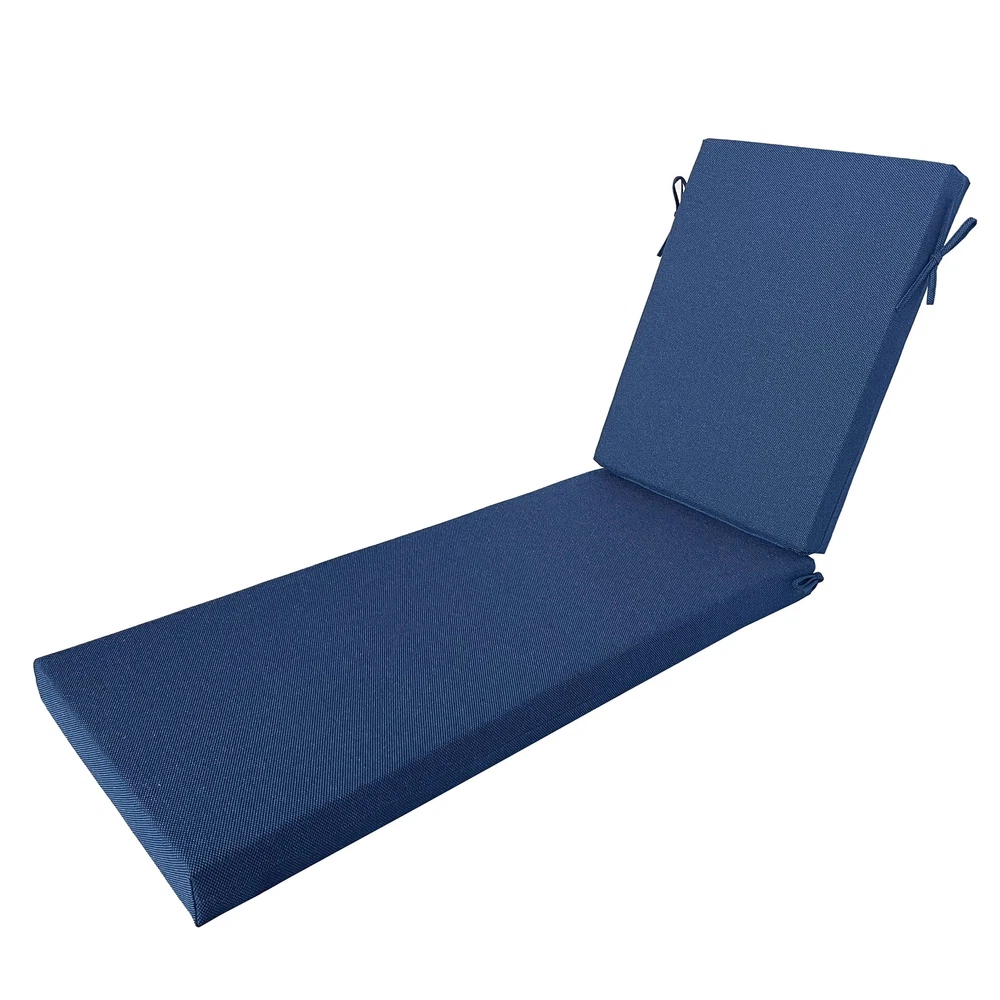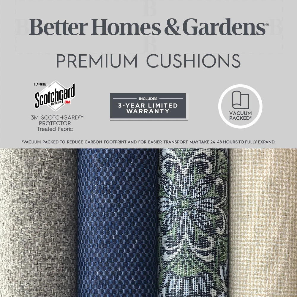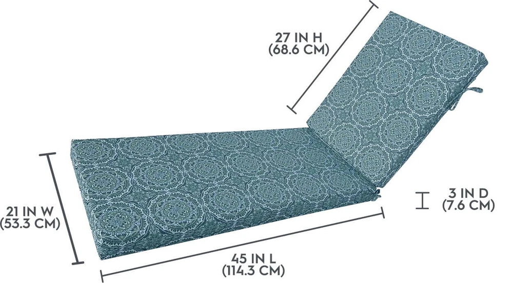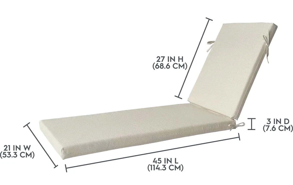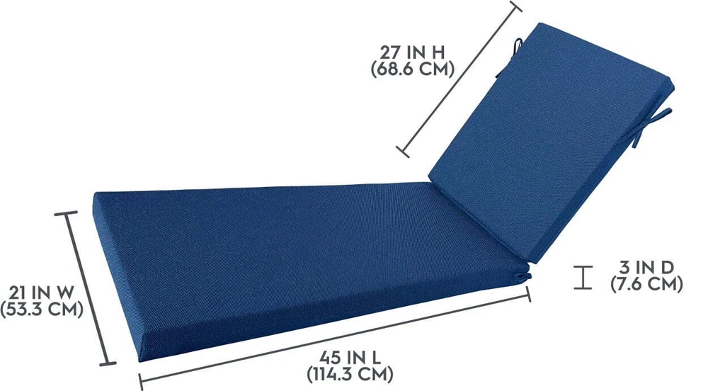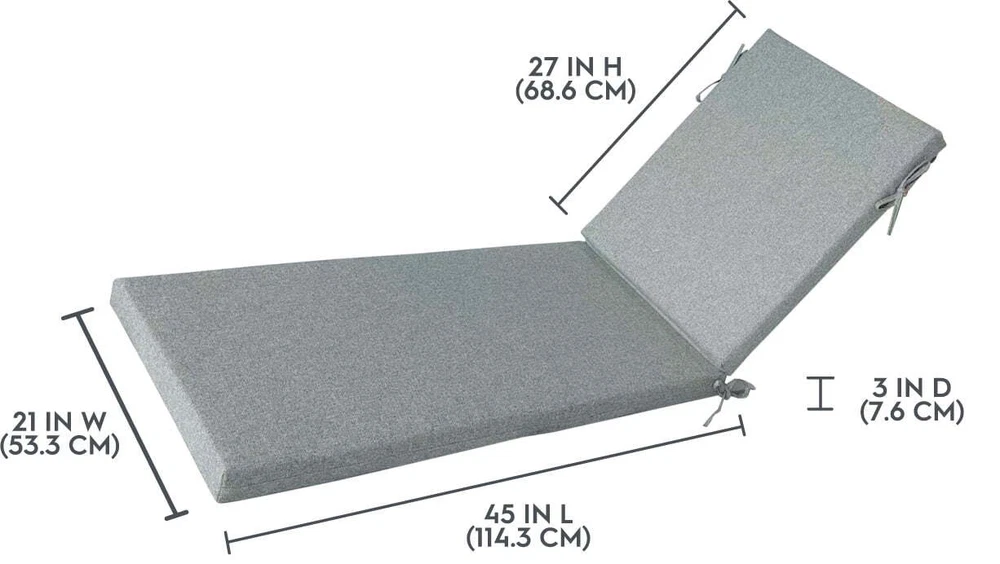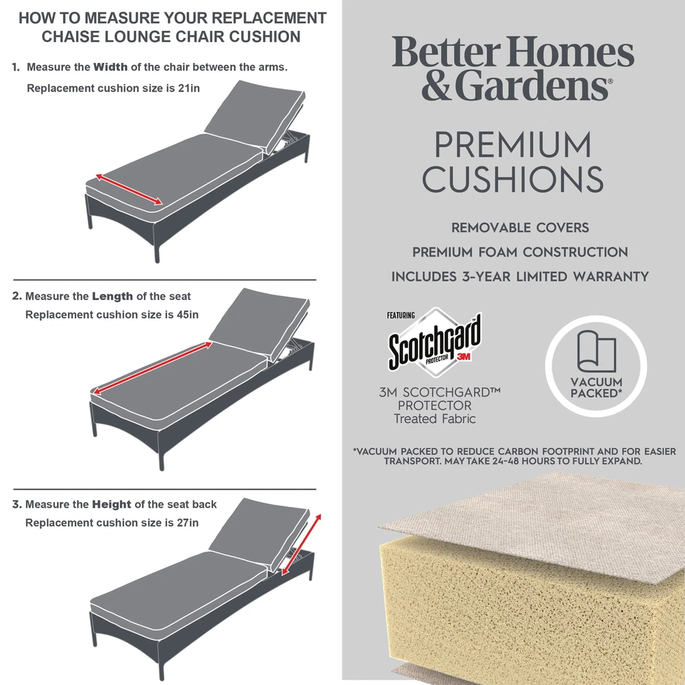 Our Better Homes & Gardens premium chaise lounge chair replacement cushion features a durable foam core to add comfort, support, and style to outdoor furniture. The fade resistant 100% solution dyed polyester fabric is treated with 3M Scotchgard™ to resist fading, water, and stains. Designed to fit most chaise lounge chairs. This 2-piece set includes 1 seat cushion and 1 back cushion. Cushion ships vacuum-sealed with removable fabric cover to adjoin the 2 cushions together. 3-year limited warranty. Equipped with ties. Pictured with Brookbury Chaise Lounge Chair Universal dimensions to accommodate most chaise lounge chairs 72" L x 21" W x 3" H 3M Scotchgard™ treated fabric resists water and stains Superior fade resistant 100% solution dyed polyester fabric Premium cushion with durable foam core adds extra support and comfort Equipped with ties to keep cushion in place Clean fabric with mild soap and water and air dry After unpacking, allow 24-48 hours for vacuum-packed cushion to fully expand 3-year limited warranty IMPORTANT: measure carefully before ordering