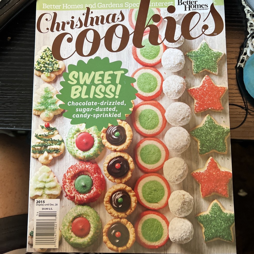 The product is the Better Homes & Gardens Christmas Cookies 2015 issue, featuring sweet bliss recipes for the holiday season. This magazine, published in 2015 in the United States, focuses on cooking and food, specifically catering to those looking to bake delicious holiday treats. With a focus on festive and tasty treats, this publication is sure to inspire and delight any home baker looking to add some holiday cheer to their kitchen.