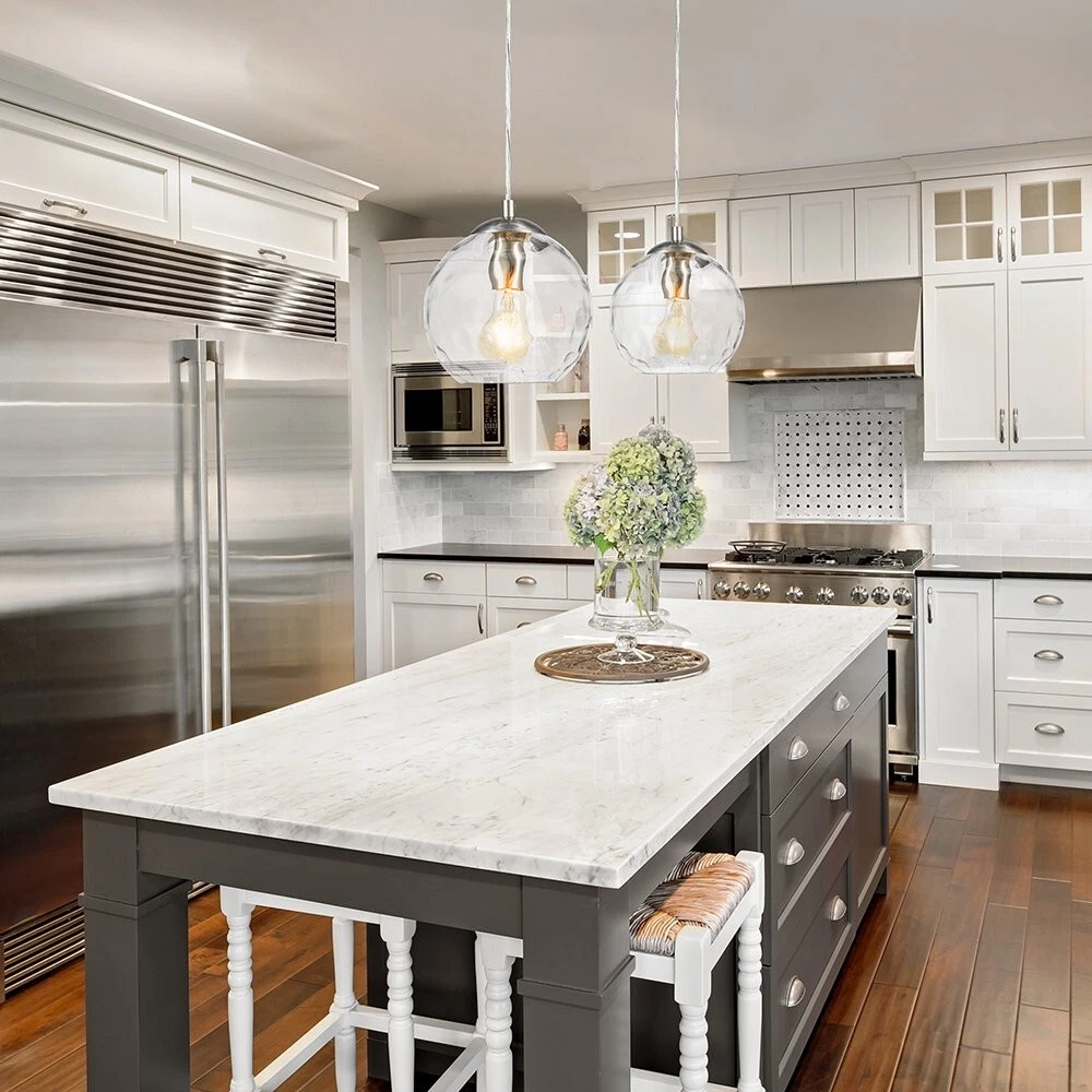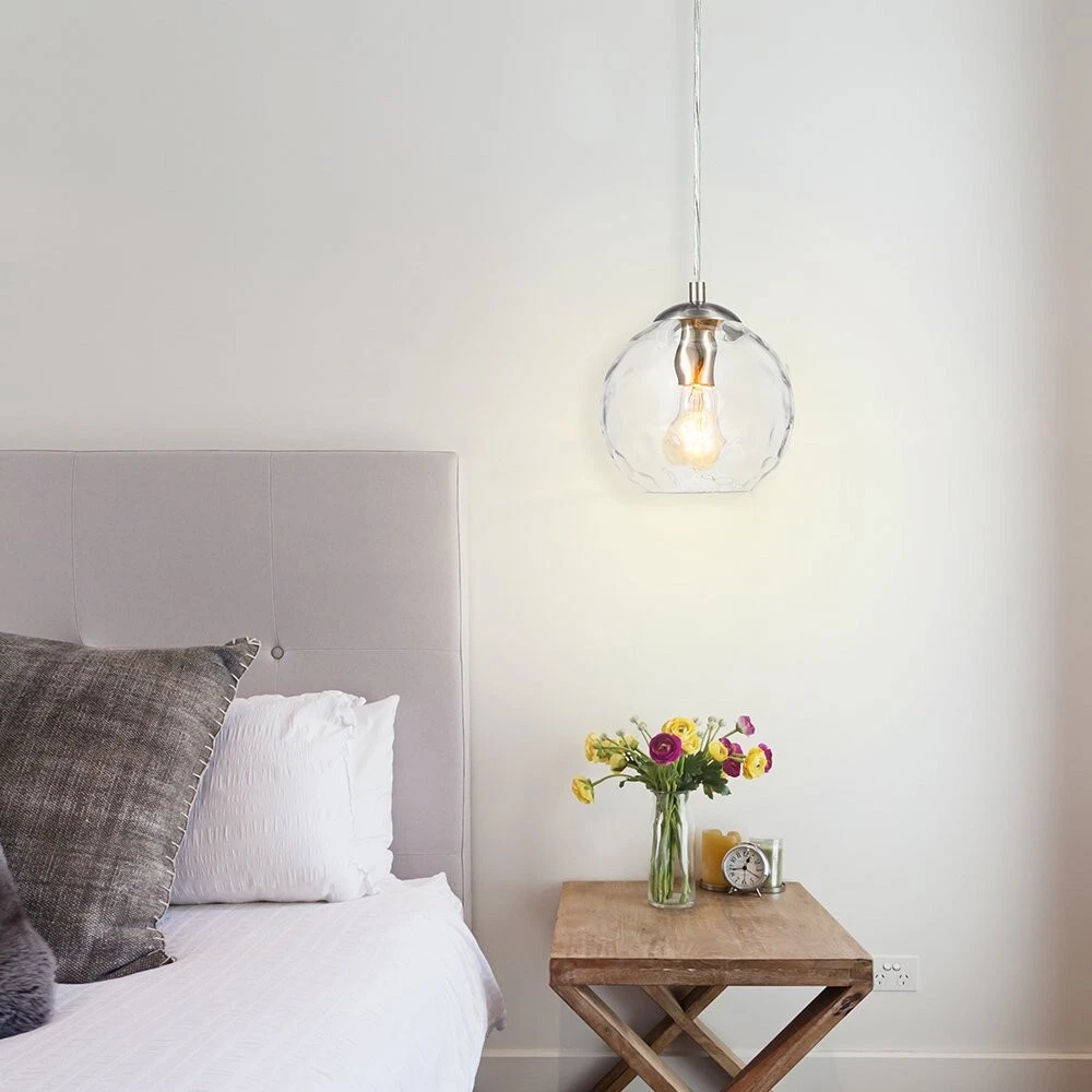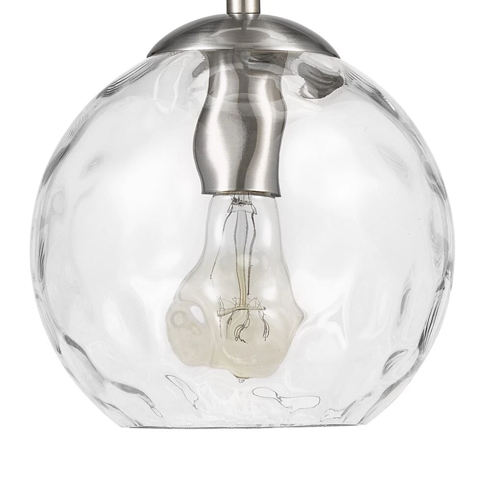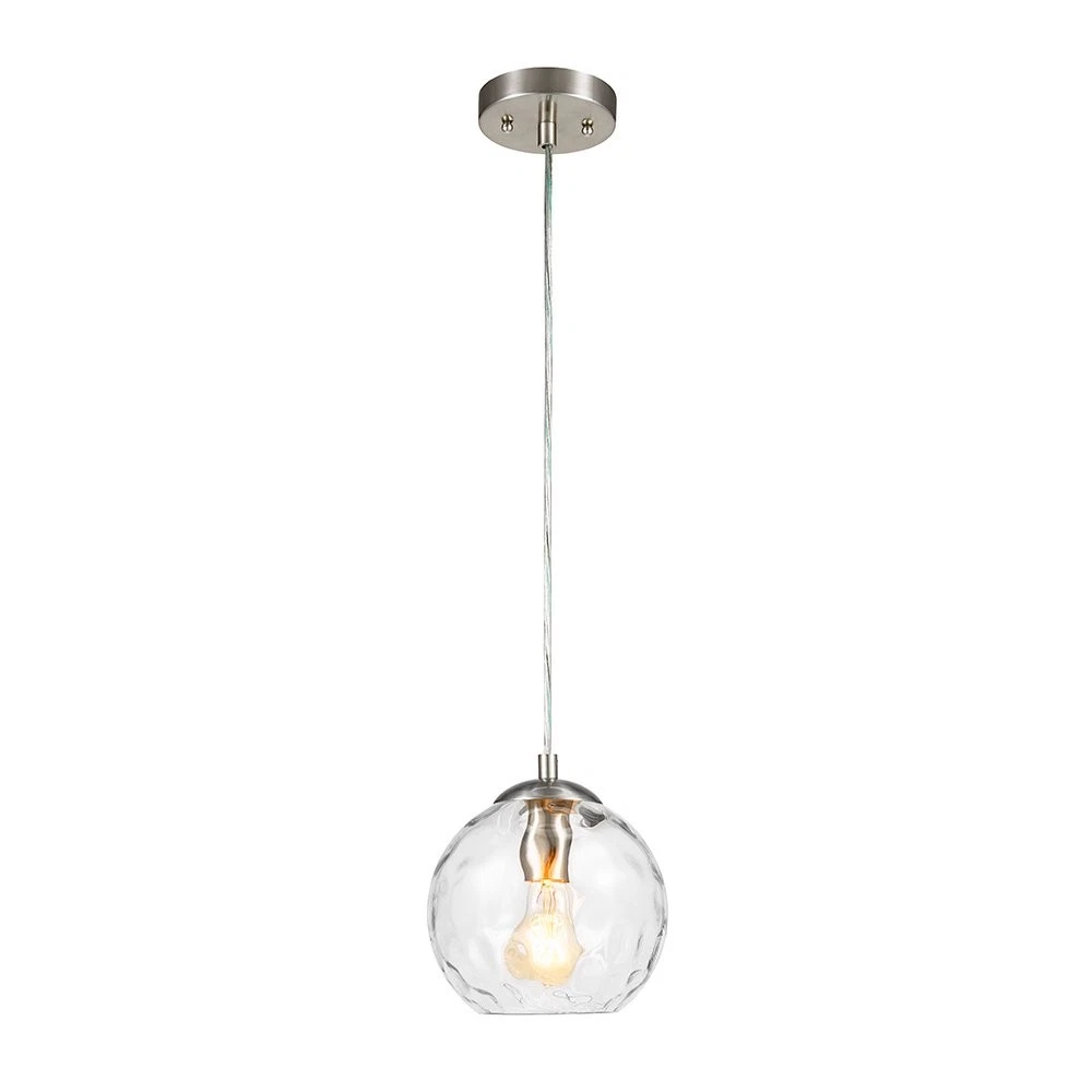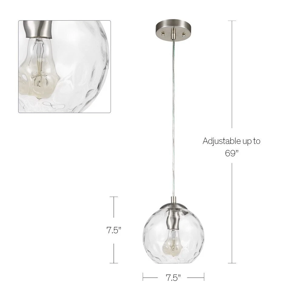 Decorate and illuminate your room with the Better Homes & Gardens Clear Glass Pendant Light. This light will make a contemporary statement in your room décor with a simple clear glass shade with a hammered finish and brushed steel accents. The light has a metal canopy that mounts to any standard ceiling junction box using the included mounting hardware and uses one 60-watt incandescent equivalent bulb. This versatile pendant light is Ideal to hang over kitchen islands, kitchen and laundry room sinks, and bedside tables to add the look of a custom lighting statement piece to your design. Better Homes & Gardens Clear Glass Pendant Light Clear hammered glass shade Brushed steel finish Mounting hardware included 69"H x 7.5"W x 7.5"D Uses one 60-watt incandescent equivalent bulb