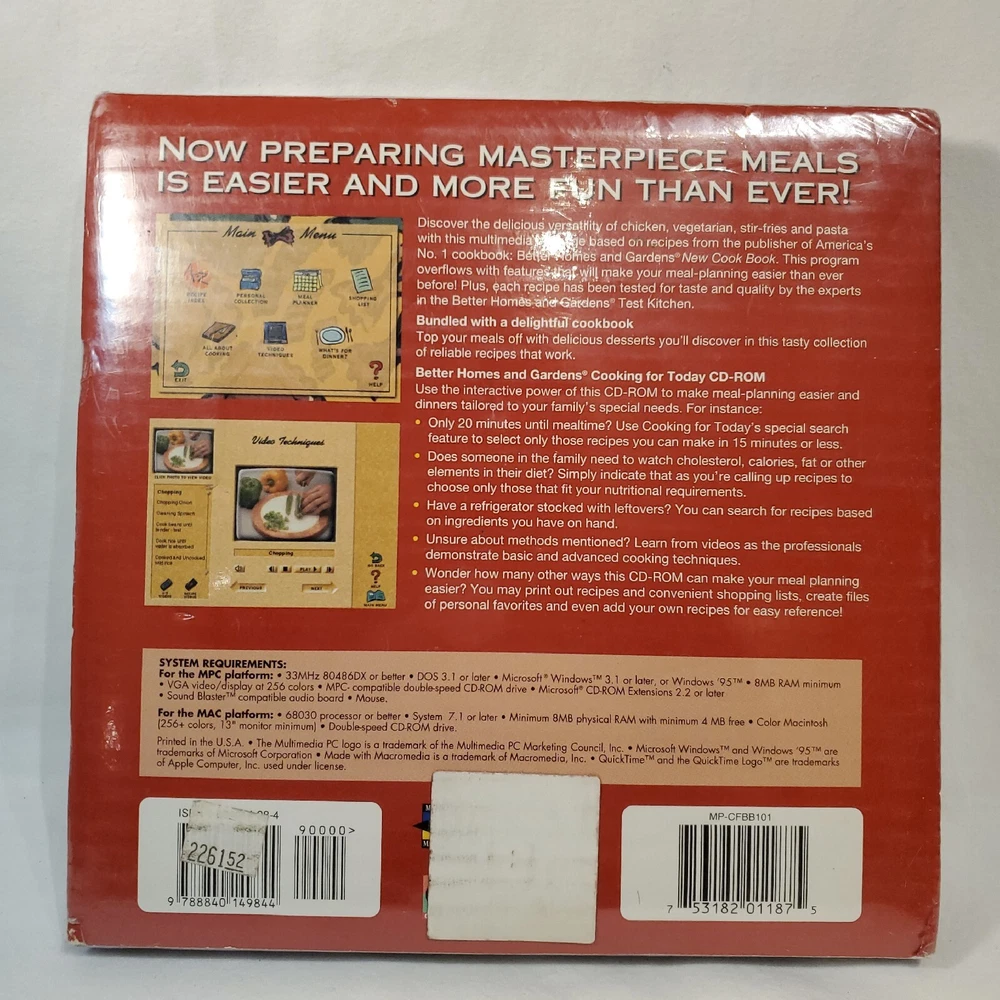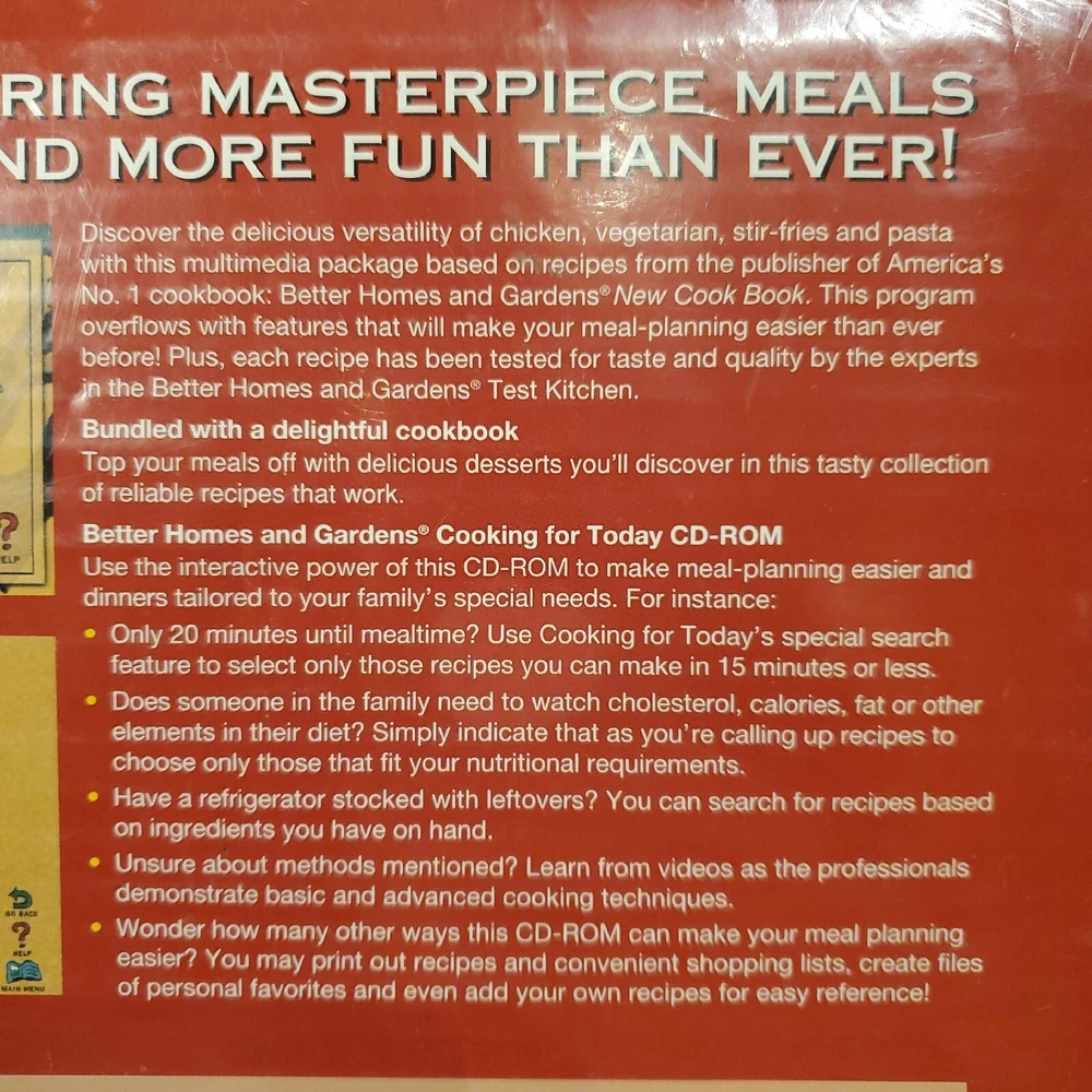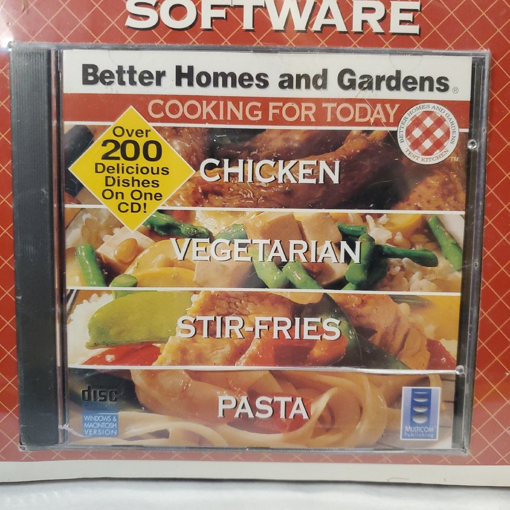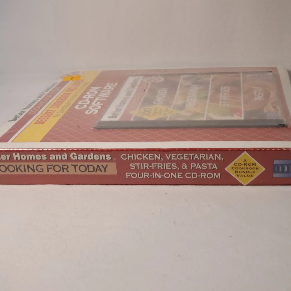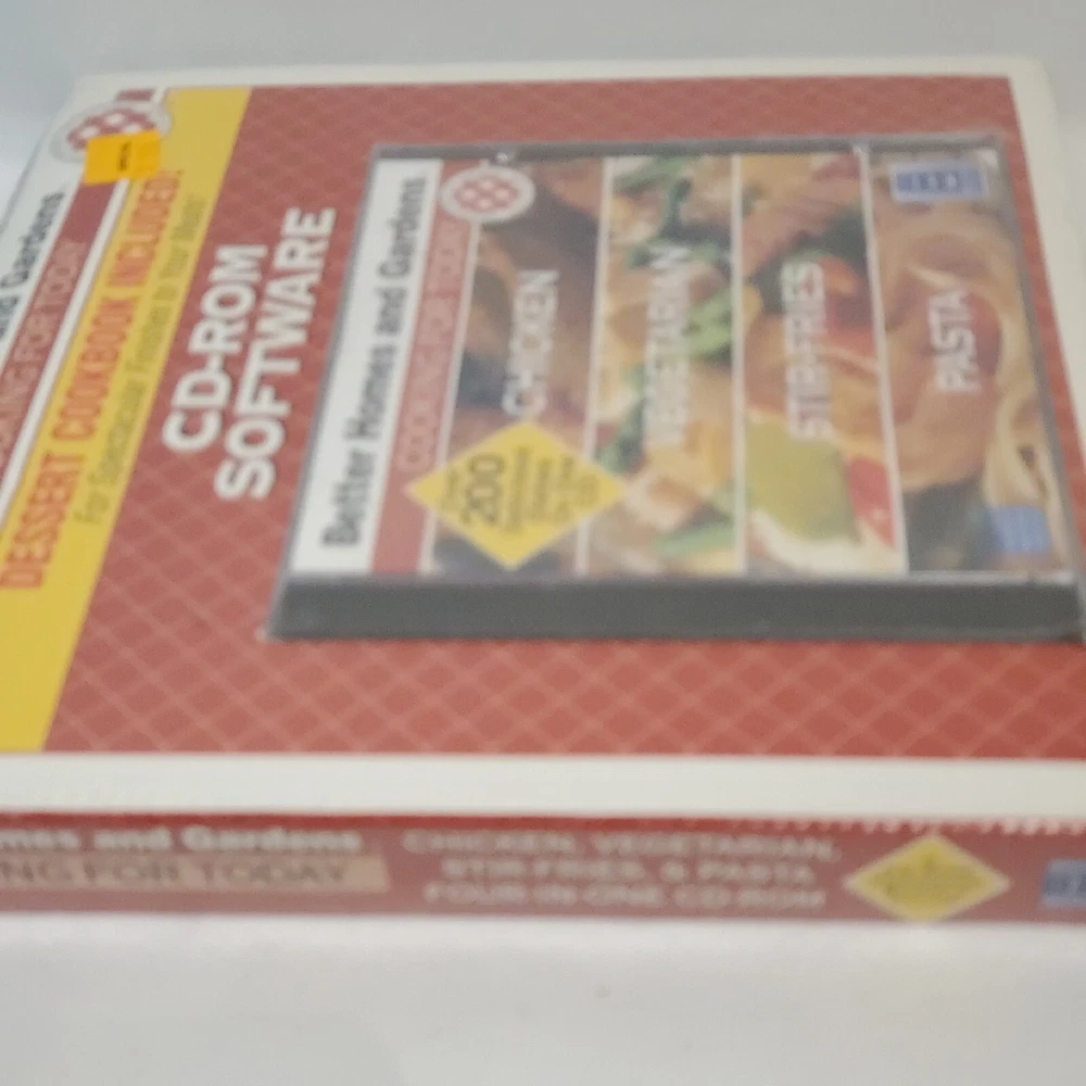 Better Homes & Gardens Cooking for Today 200+ Recipes CD PLUS Dessert Cookbook. This item is pre-owned. Item is in the original packaging. The CD case has a crack on the cover. Has the item is still sealed I am unable to open it. I did take pictures of it please see pictures for details. Also see picture of system requirements. Cuz item is used it shows signs of w e a r on the packaging. I am unable to verify the condition of the inside items. Please see all pictures poor condition details.