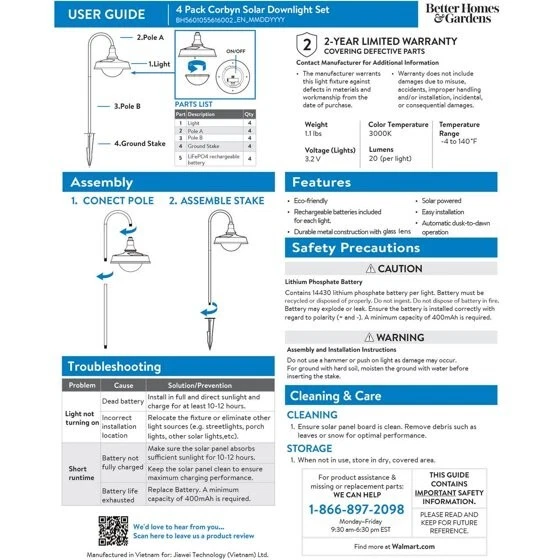 Illuminate your outdoor area with this Better Homes & Gardens Solar Powered Landscape LED Pathway downlight. The perfect way to enhance your home's landscape and walkway, adds charm and elegance while increasing safety during the nighttime hours. The downlight produces 20 lumen of bright light, with no wiring required. Classic design in matte black finish is stylish and sturdy, perfect for lighting up your driveway, garden, pathway, and more. Easy to setup and install. It is powered by a rechargeable lithium battery (included) that will provide up to 8 hours of illumination during the evening hours. Give it direct sunlight to charge fully then watch it work! Durable metal construction with glass lens Matte Black finish Integrated LED delivers 3000K warm white light, with 20 lumens output 1-400mAh 14430 Lithium-LiFePO4 solar rechargeable battery included Weather-resistant for outdoor installation, IPX5 waterproof Up to 8 hours of run time after average sunny day charged