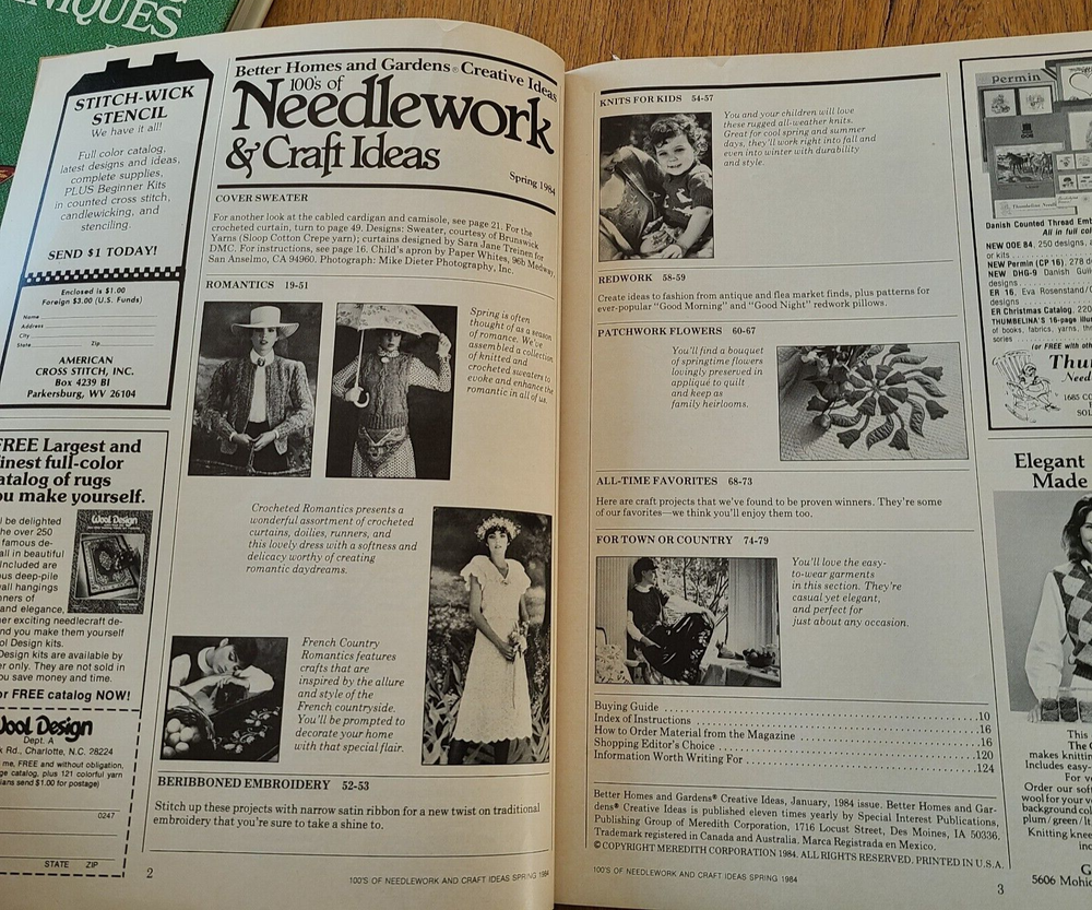 Better Homes & Gardens Creative Ideas: 100's of Needlework Craft Ideas Spring 1984 Issue in near mint condition: Romantic New Fashions, Crocheted Keepsakes, Patchwork Applique, Plus Stencil, Cross Stitch & Needlepoint treasures. Perfect for anyone looking for GrannyCore CottageCore ideas, fun throwback 80's styles. Tracking available with Ground Advantage, buyer pays shipping.