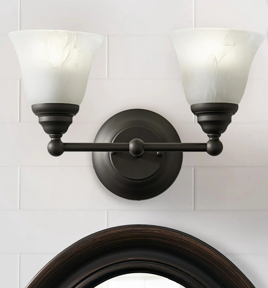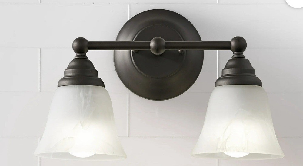 Brighten your beauty regimen with Better Homes & Garden Vanity Lights. These lights offer professional-grade illumination, perfect for makeup application or hair styling. With a chic design, they enhance your vanity space and room ambiance. Easy to set up and adjust, they ensure the ideal angle and height for all your beauty needs. Commonly used in bathrooms, bedrooms, and living rooms. LED bulbs included. Style #BHS036179061016. Illuminate your world of beauty today! Better Homes & Garden Classic 2-Light Vanity Wall scone Traditional Style Crafted from metal with oil rubbed bronze finish Includes 2 frosted glass shades Compatible for use with dimmer switch Damp rated - suitable for used indoors and covered outdoors 120V Hardwired; professional installation recommended Requires (2) E26 Medium base Light Bulbs (2) Dimmable LED A19 Light Bulbs are included The included bulbs are 60W Equivalent, 800 lumen each