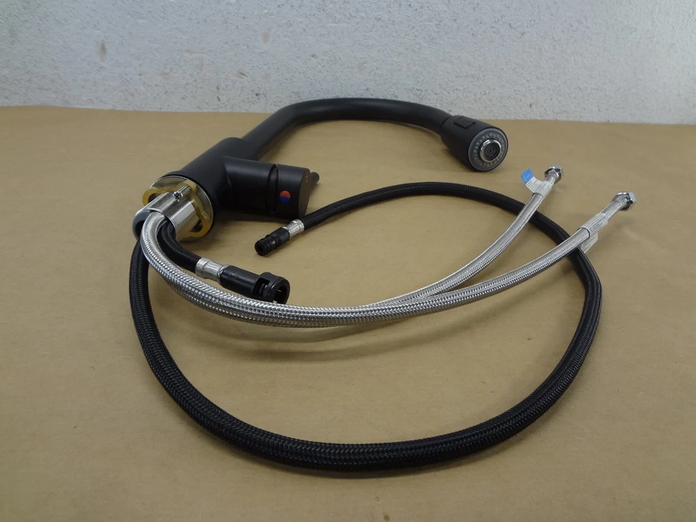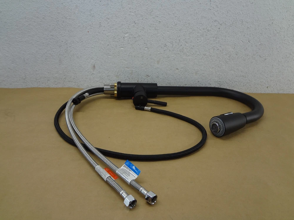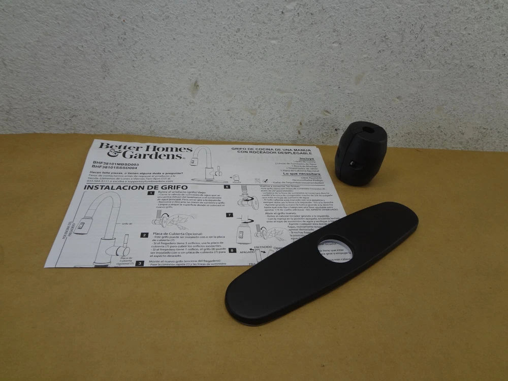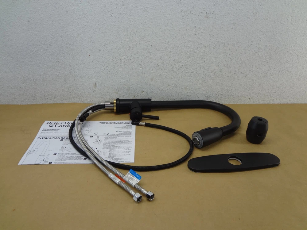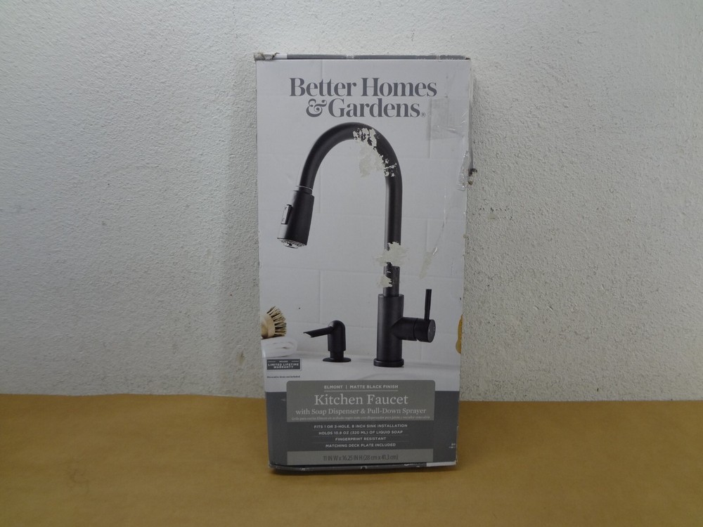 This Better Homes & Gardens Elmont Single Handle Pull-Down Kitchen Faucet in Matte Black finish features a matching Soap Dispenser. The perfect blend or strength and beauty, this faucet features a design with a pull-down spray head that can be used in spray or stream function. The included optional deck plate allows for installation in 1 hole or 3 hole sink configurations. This single handle design allows for easy one hand operation of flow control and temperature. Clean periodically, but avoid use of abrasives cleaners, steel wool, or harsh chemicals. Handles: Single Handle Lever Stainless Steel Supply Lines Included 3/8" Female Compression Faucet Connection Includes matching soap dispenser Optional Deck Plate Holes for Installation:1 or 3 hole 8-inch on center installation Meets California low-lead AB1953 requirements High Quality Ceramic Cartridges for Durability and Reliability cUPC certification Easily rub spray nozzles clean with the touch of a finger to easily wipe away calcium and lime build-up Flow Rate (GPM): 1.8 Complies with ASME A112.18.1-2012/CSA B125.1-12 Cartridge Type: Ceramic Cartridge Lead Free Compliant: Yes Complies with NSF IMPORTANT: Soup dispenser is missing and NOT included Before you buy, please check my Feedbacks!!! You are buying from trusted seller!!!!!! New – Never Used - Original Open box (open only for exhibition) The box is slightly damaged. Important: Since this item is a store display model it may have small areas that got in touch with dust or have minor scratches, but this is only from being on a self without a box. Pictures are of actual item for sale, please review closely and let me know of any questions you may have. Only include the accessories show in the picture; Do not assume anything, If it is not shown in the pictures or written in the description, chances are, it does not come with it!!! If you are looking for further details, you might want to check the manufacturer or publisher website. Their sites frequently contain details about an item’s specification such as physical dimensions, size, weight, included accessories, format, edition, version, color, etc. Additionally, we are not able provide technical, warranty support or confirm if an item is compatible. We are not authorized Sellers/Dealers/Retailers of any of the products/merchandise we list/sell. Shipping is MON thru FRI, except for all Federal Holidays. We do SAME DAY SHIPPING on confirmed addresses by 11:00 a.m. CST. We will ship using UPS or USPS, according to our criteria in each case. A tracking number is automatically emailed when the order is processed. UPS does not deliver in a PO Boxes, make sure to include a physical address. This item can only be shipped to the US (the lower 48 only) We are not able to ship products to Hawaii, Alaska, Puerto Rico, the US Virgin Islands or Mariana Islands. We will only ship to the address defined in your eBay account. We are not able to ship to international addresses. Thanks for your business. 227-BW09-030