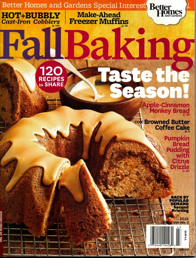 Fall Baking This listing is for an original copy of Better Homes & Gardens Fall Baking Magazine. This is the 2014 issue. The cover has minor shelf wear. The pages are clean. There are no missing or torn pages. This item ships USPS Ground Advantage. International buyers use eBay international shipping program.
