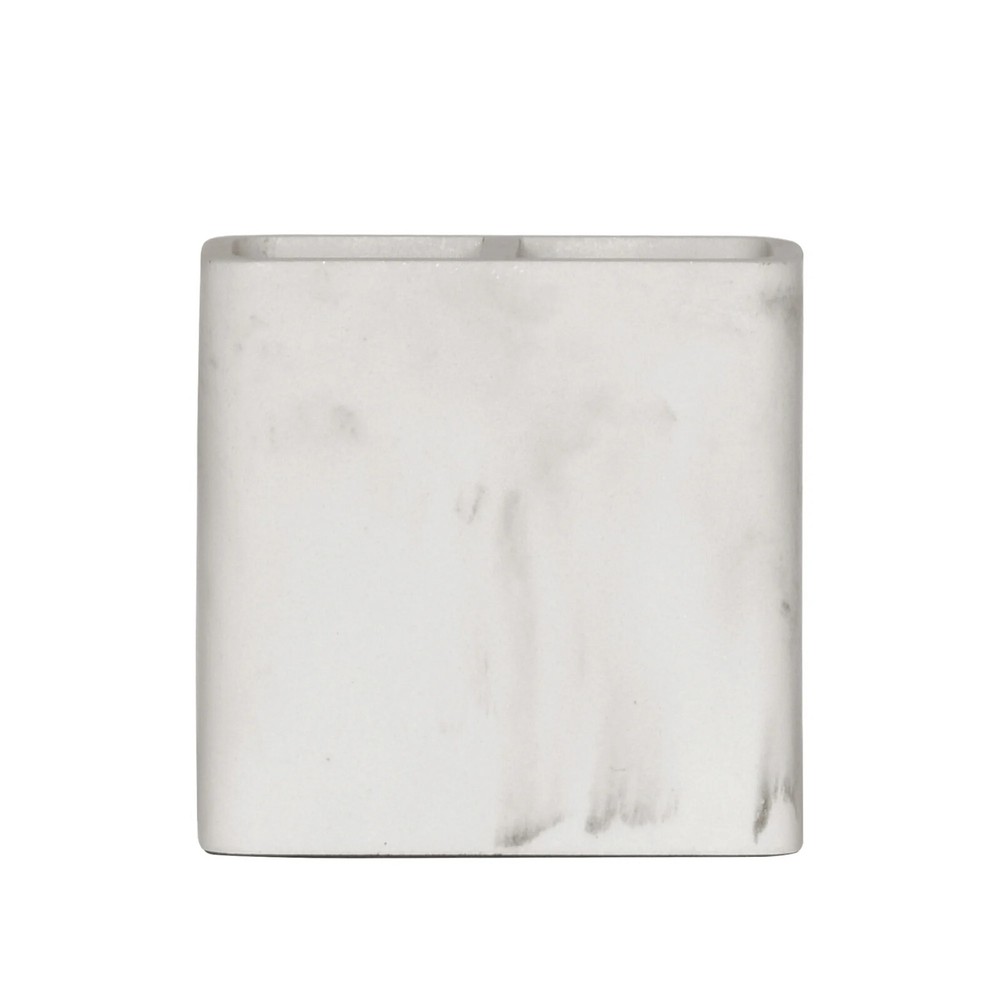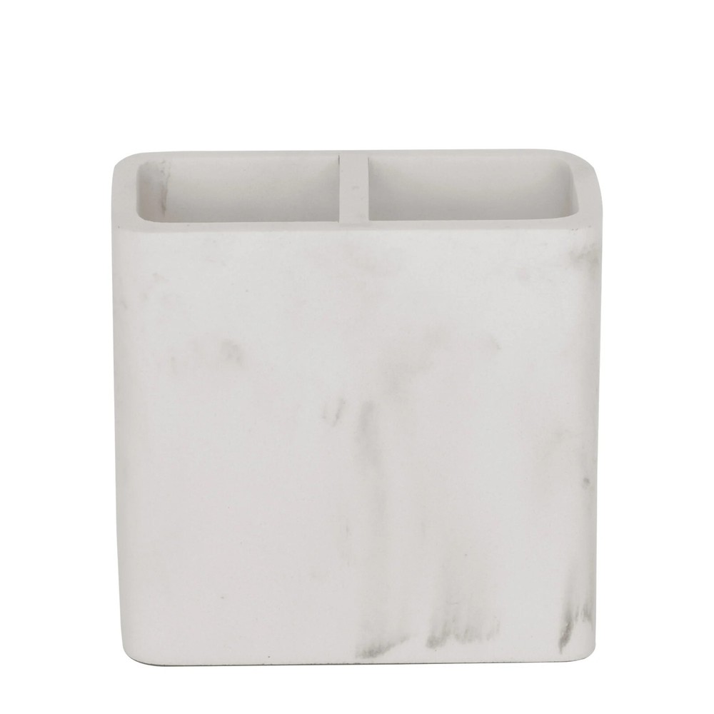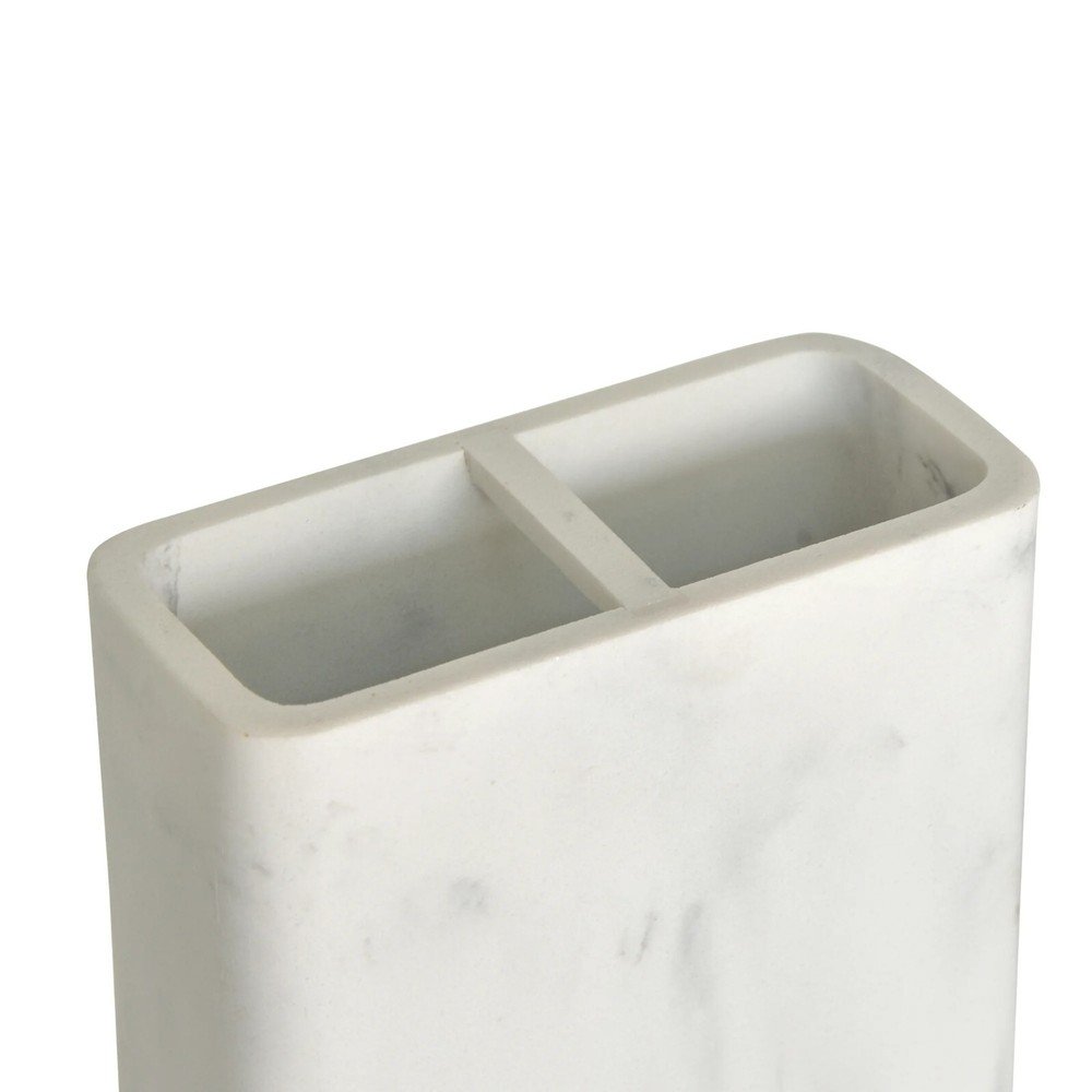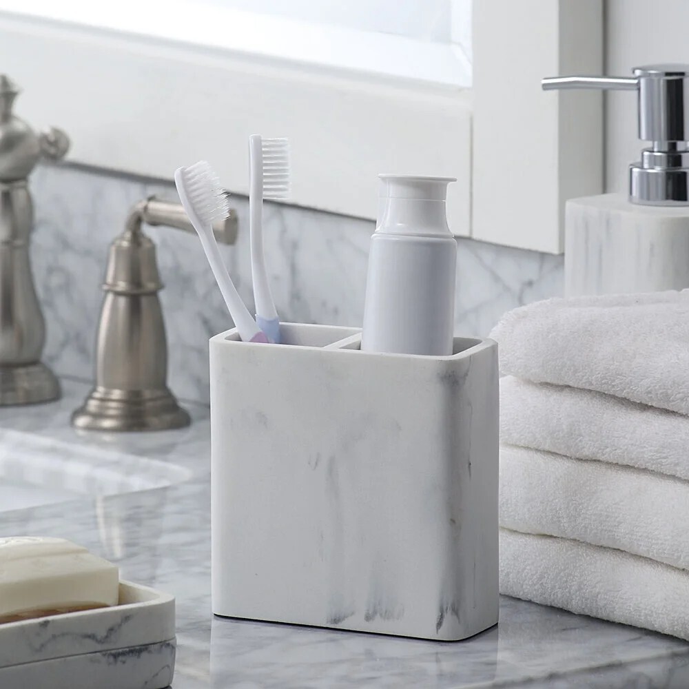 bout this item Better Homes & Gardens Faux Marble Toothbrush Holder, White Great for organizing anything on your countertop, from toothbrushes to makeup brushes The resin toothbrush holder features a classic white marble look in a clean and versatile silhouette Measures: 4.45" x 2.05" x 4.41" high Wide opening fits most electric toothbrushes Perfect for storing toothbrushes and toothpaste, or use as a makeup organizer for brushes and beauty products Perfect for storing toothbrushes and toothpaste, or use as a makeup organizer for brushes and beauty products Coordinates with other Better Homes & Gardens Faux Marble accessories: BHG Faux Marble Soap Dispenser, BHG Faux Marble Soap Dish, BHG Faux Marble Vanity tray, BHG Faux Marble Toilet Brush, BHG Faux Marble Waste Basket, BHG Faux Marble Vanity Mirror, BHG Faux Marble 4-pc Vanity Organizer Set Sturdy and durable