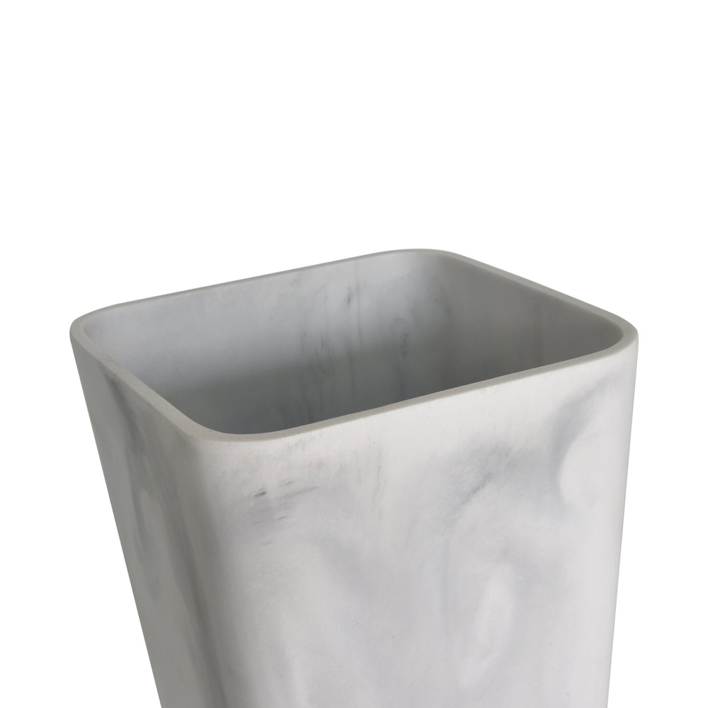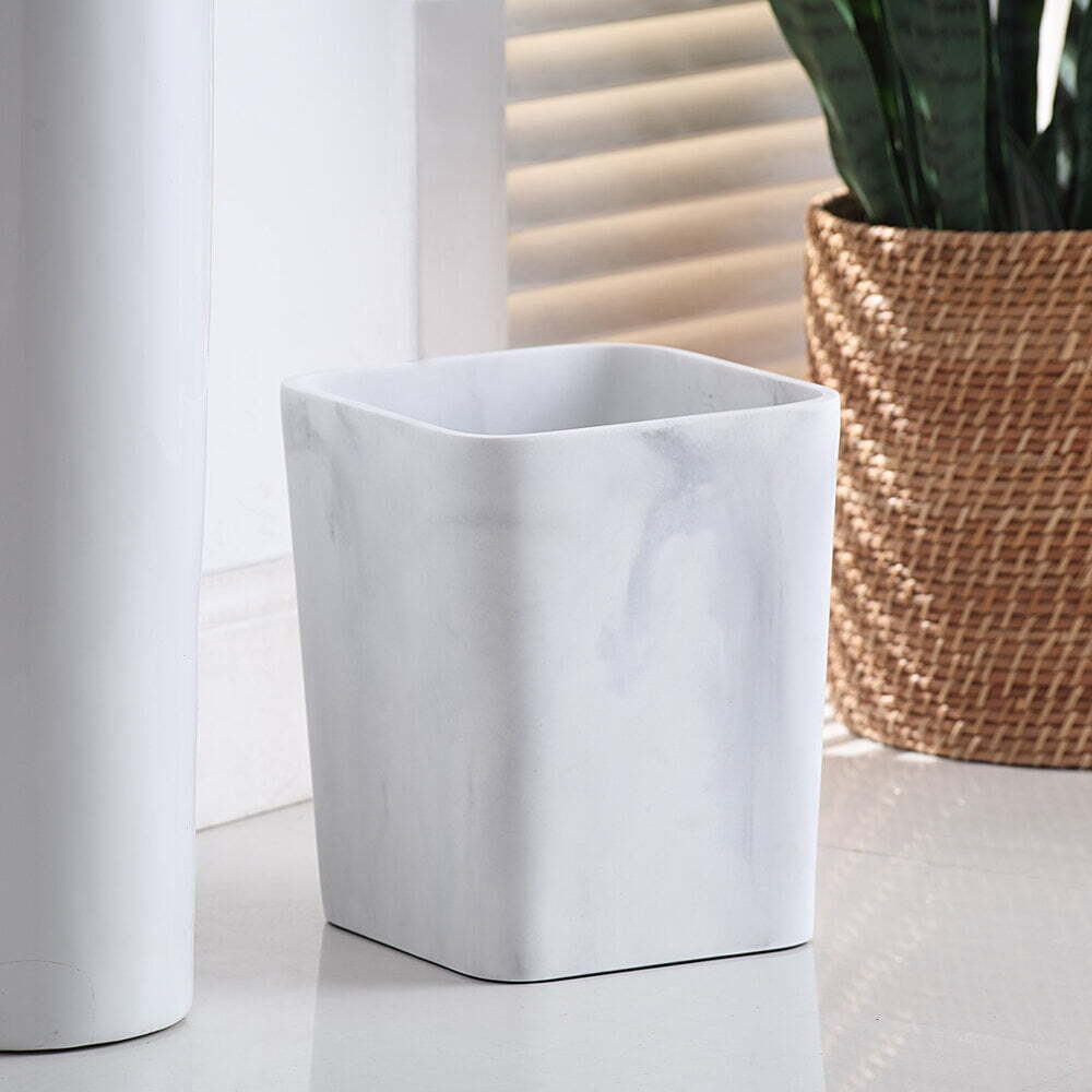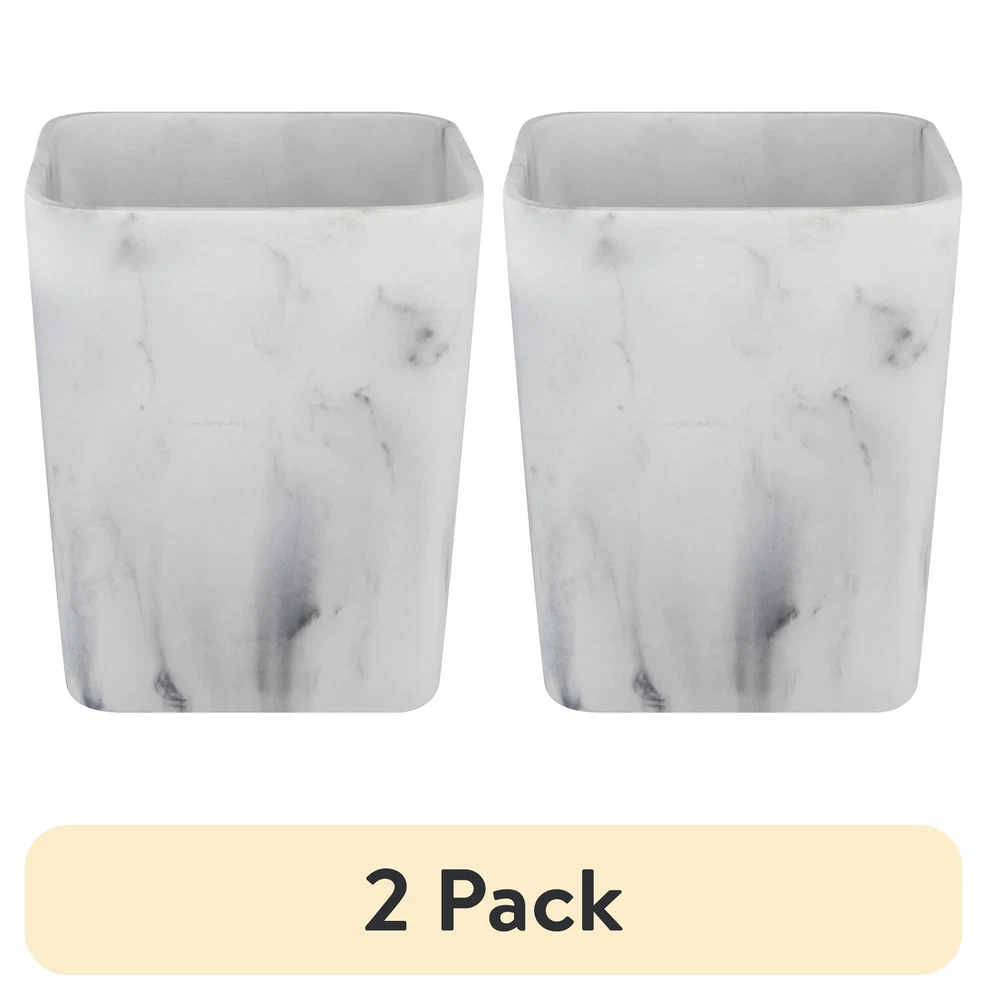 The Better Homes & Gardens Faux Marble Wastebasket combines simple functionality and style. Cast from a smooth, durable resin composite, which looks and feels like heavy white marble with veining, this waste basket is sure to upgrade your home or office decor. It features a classic soft square, tapered shape, making it ideal for many different decorating styles. This faux marble trash can also has a non-slip foam pad to keep it in its place. Paired with other items in the Better Homes & Gardens Faux Marble Collection, you can transform your bathroom into a spa-like oasis. Better Homes & Gardens Faux Marble Wastebasket, White Designed 9.75" deep to provide ample room for trash Resin waste basket features classic white marble look in a clean and elegant design Measures: 8" x 8" x 9.75” high Smooth, marble-like and hand feel in resin Open design for easy trash disposal Use with 2 gallon (7.5 liter) trash bags Non-slip EVA foam pad on bottom