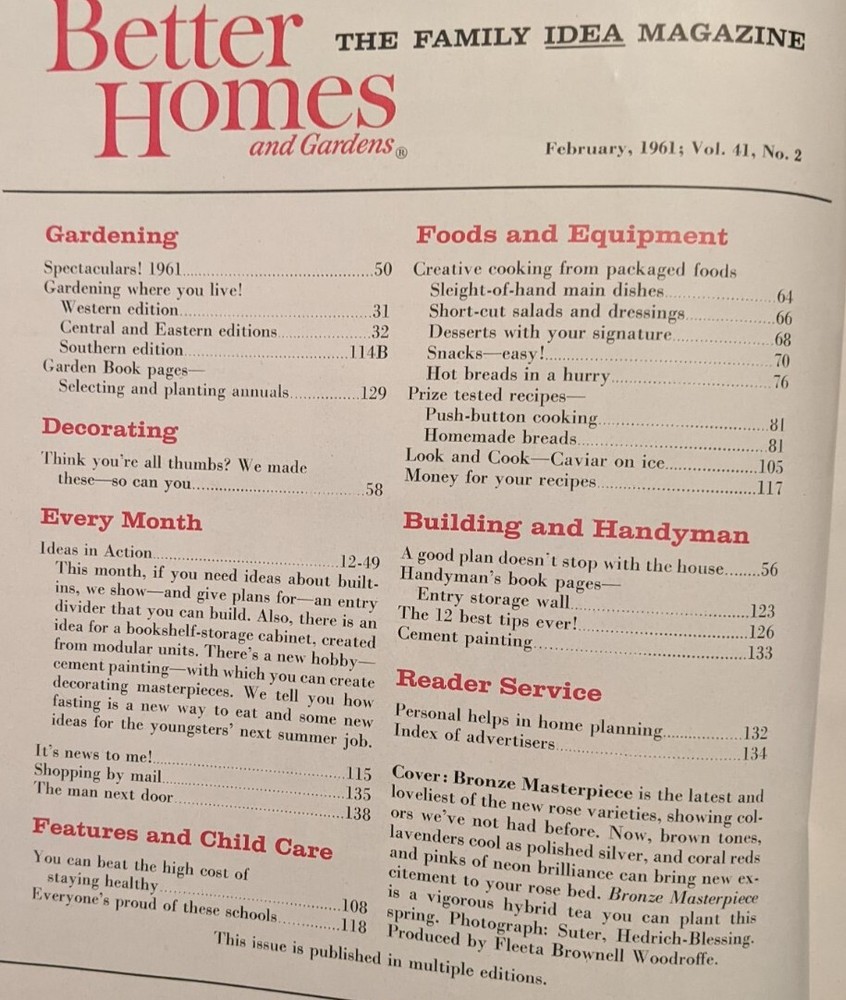 This listing listing is the February 1961 issue of Better Home & Gardens. See photos of cover, table of contents, plus a few of the pages.