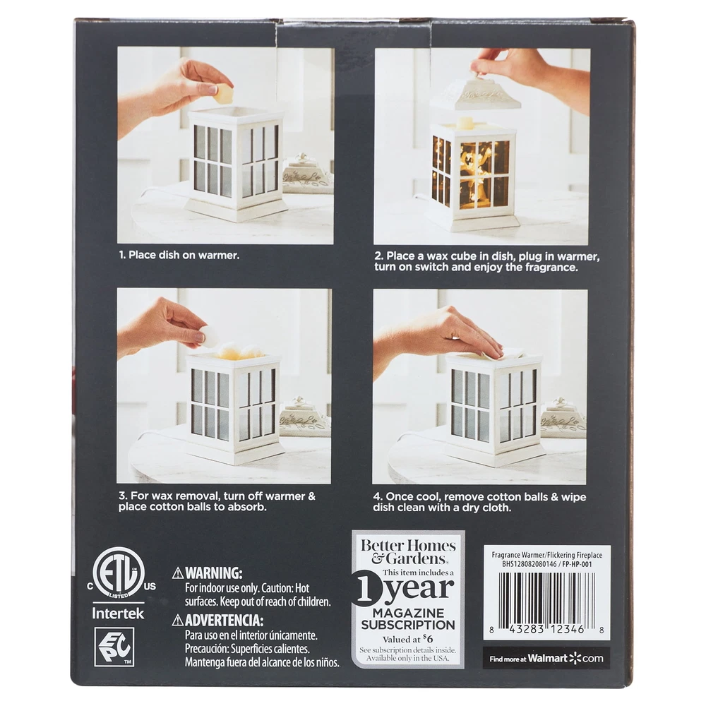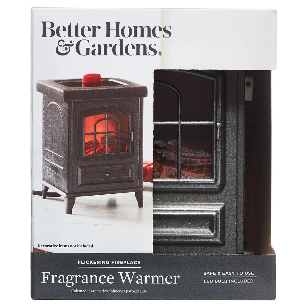 Better Homes & Gardens Full Size Wax Warmer, Flickering Fireplace: The Better Homes & Gardens Flickering Fireplace Wax Warmer is the perfect addition to any room. The Flickering Fireplace warmer is a perfect replica of a cast iron stove with metal finishes and realistic moving flames that will give you the feeling of sitting by a wood burning fire. It gently melts scented wax, releasing aromatic scents that fill an entire room with inviting warmth. It produces a soft glow from the flames when plugged in with no need for a bulb that would need replacing. The Flickering Fireplace wax warmer will make you want to sit back and unwind while giving you a safe heat source to melt your choice of fragrance wax melts (sold separately). The use of an electric light makes this a safe way to heat your fragrance with no soot or residue. This Better Homes & Gardens Flickering Fireplace Wax Warmer is perfect for adding the right amount of ambience and fragrance to your space. No flame or soot residue Gentle light adds a touch of ambiance Hundreds of wax melts to choose from (sold separately) Safe and clean heat source Easy clean up Long-lasting fragrance