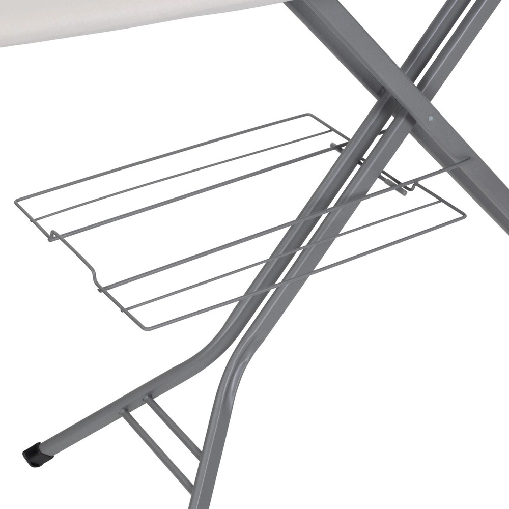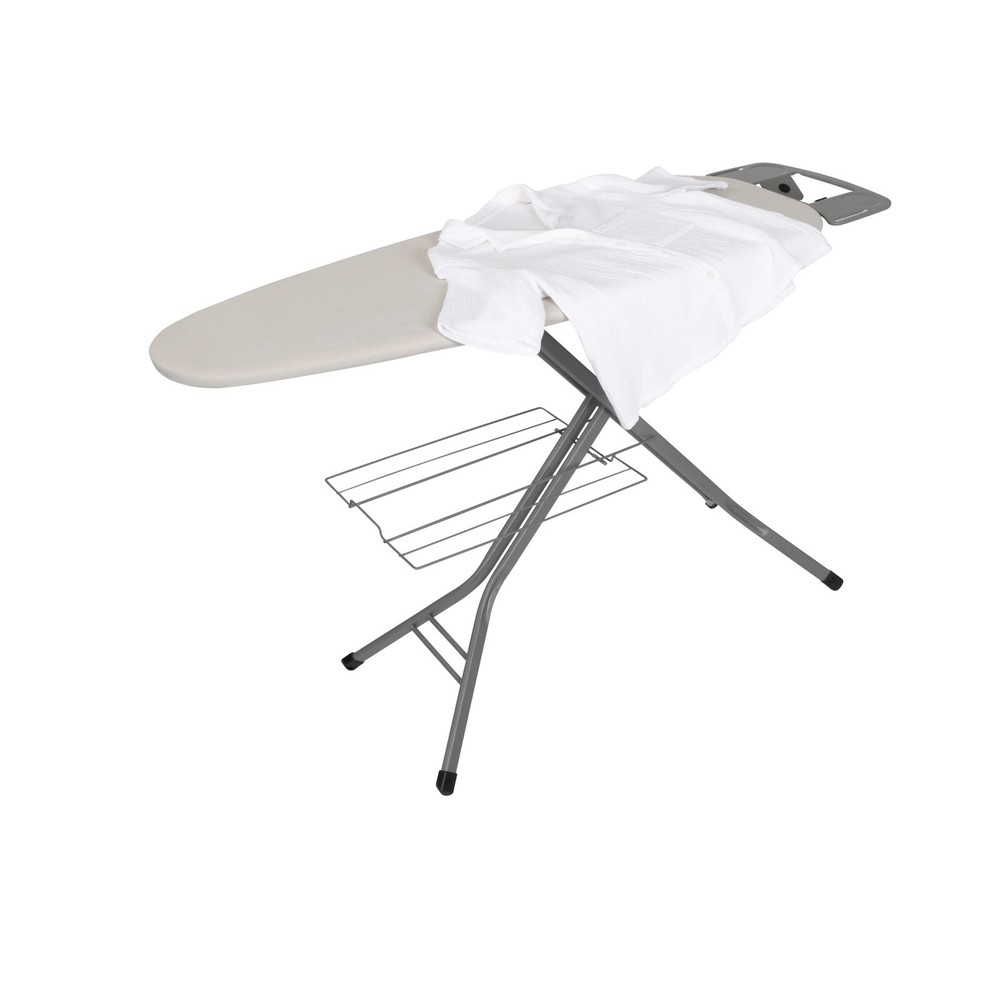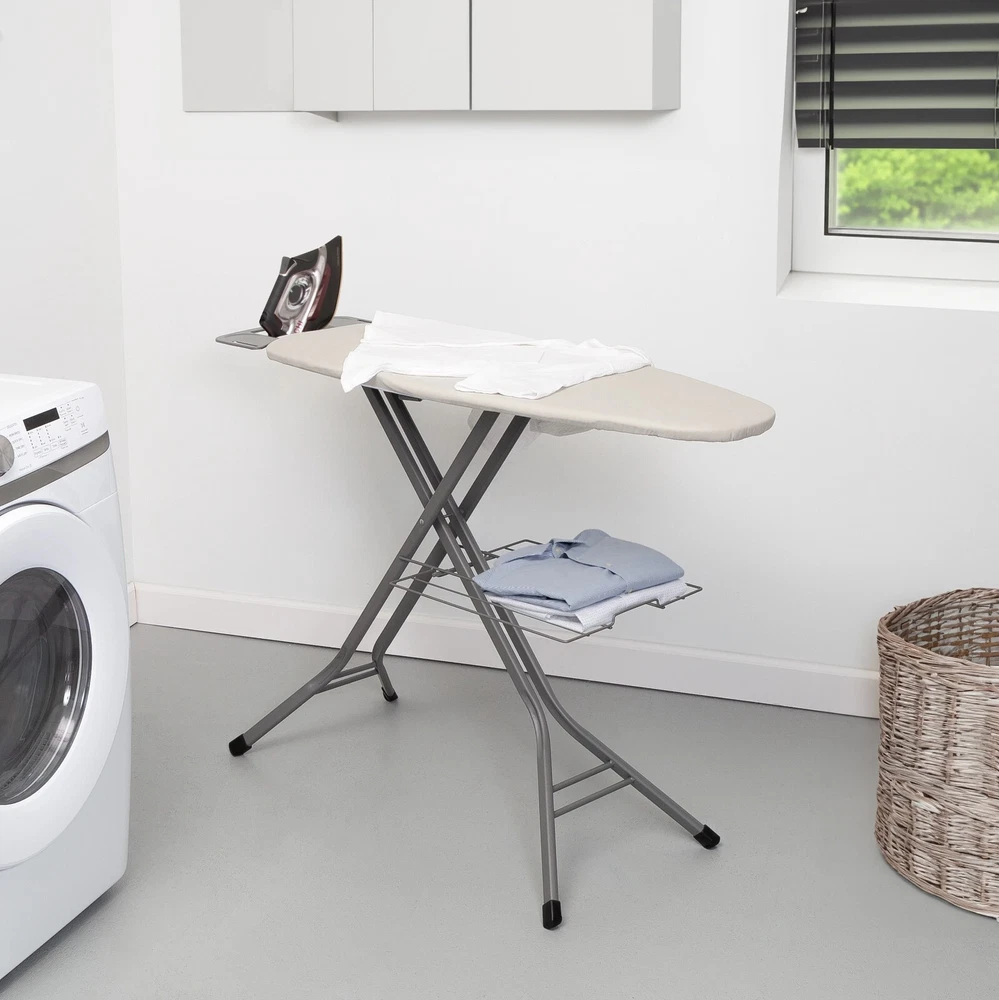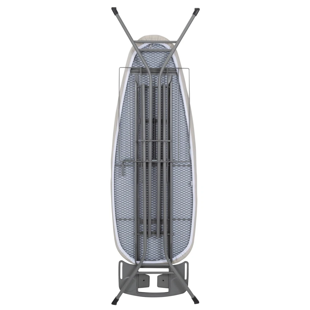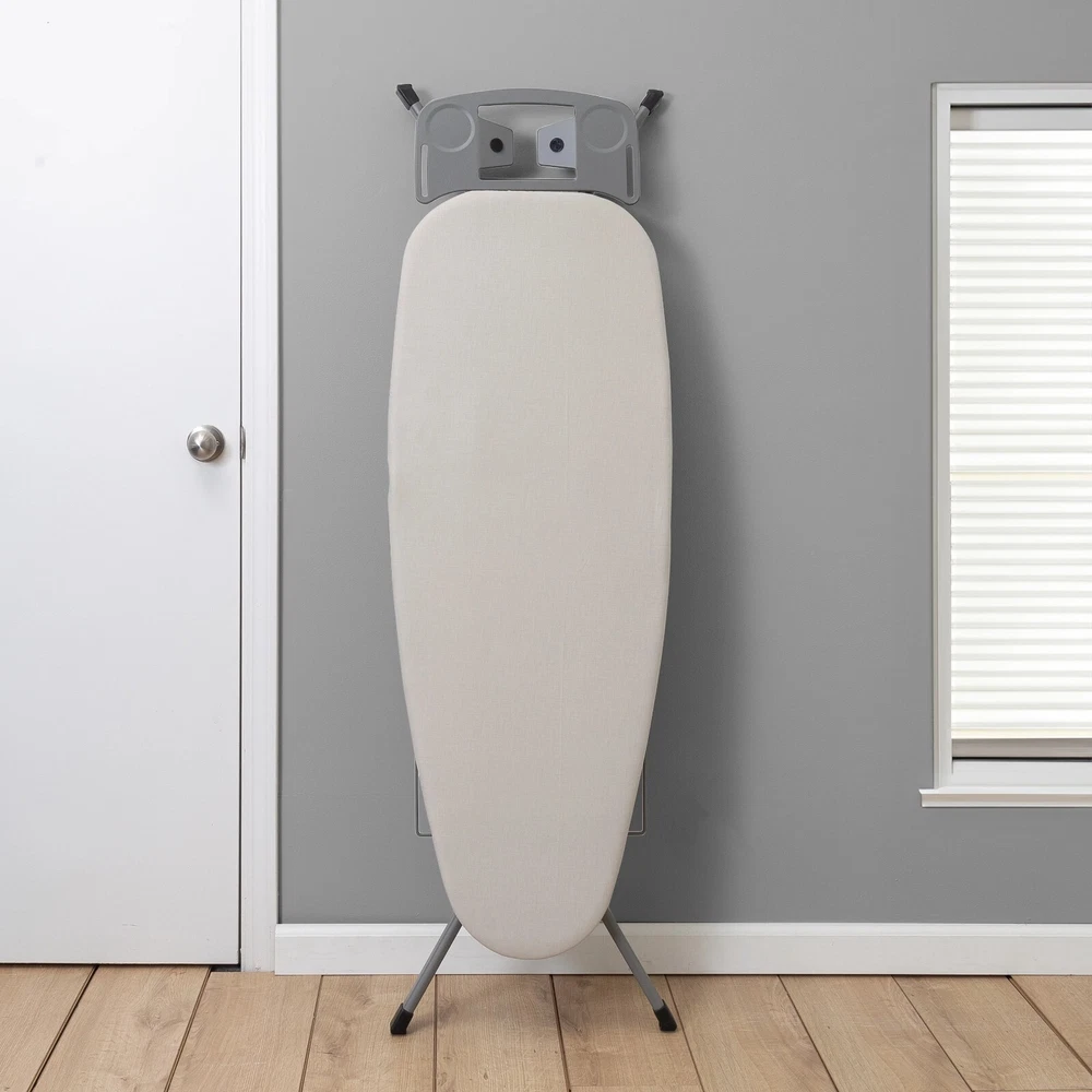 Better Homes & Gardens Gray Wide Top Freestanding Ironing Board Enhance your home with the Better Homes & Gardens Gray Wide Top Ironing Board. It's made of strong steel and has a wide mesh top for better moisture release. This board offers 24% more space than regular ones for improved steam flow. Adjust the height easily for comfortable ironing. The built-in iron rest is sturdy and has silicone pads to keep things safe. Use the clothes rack for extra storage. Simplify your ironing with this board. Adjustable Height: 4 different pre-set heights with a built in lever for adjustments Built in iron rest is made of stamped metal for added support and angled Angled support to prevent iron from releasing steam when not in use Cover: 100% Cotton (Exclusive of Decoration), Pad: 2-layer pad 100% Polyester felt & 100% Polyurethane foam Dimensions: 47.99" L x 17.99" D x 29.75"-38" H (55.5" L including iron rest) Better Homes & Gardens Features Portable, Storage, Adjustable Height Brand Better Homes & Gardens Manufacturer Part Number BRDW09911 Assembled Product Weight 14.2 lb Assembled Product Dimensions (L x W x H) 47.50 x 38.18 x 17.99 Inches
