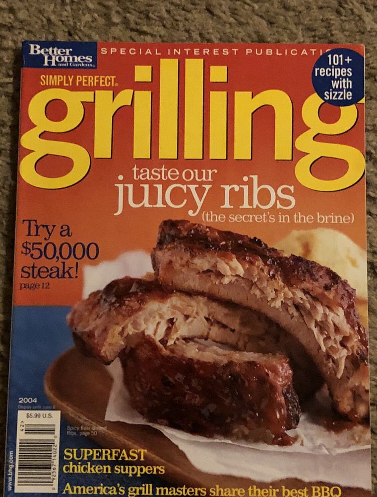 Better Homes & Gardens Grilling Magazine 2004 Juicy Ribs 101+ recipes with sizzle. I combine shipping Condition is BRAND NEW and will be shipped in a plastic sleeve for protection I combine shipping with my other items so check Them out Thanks