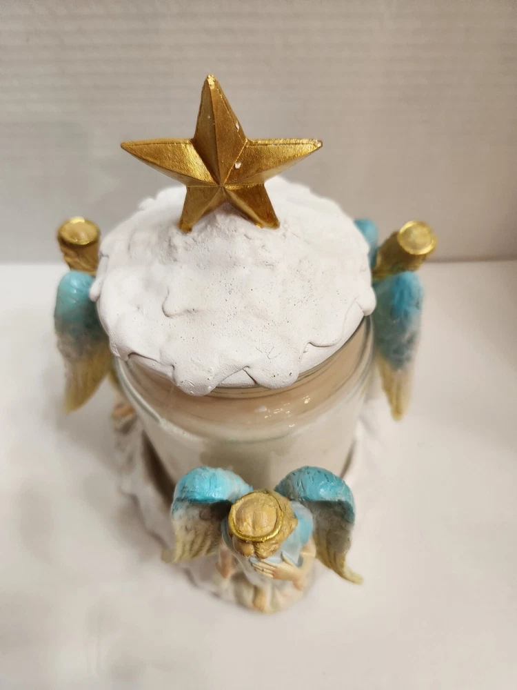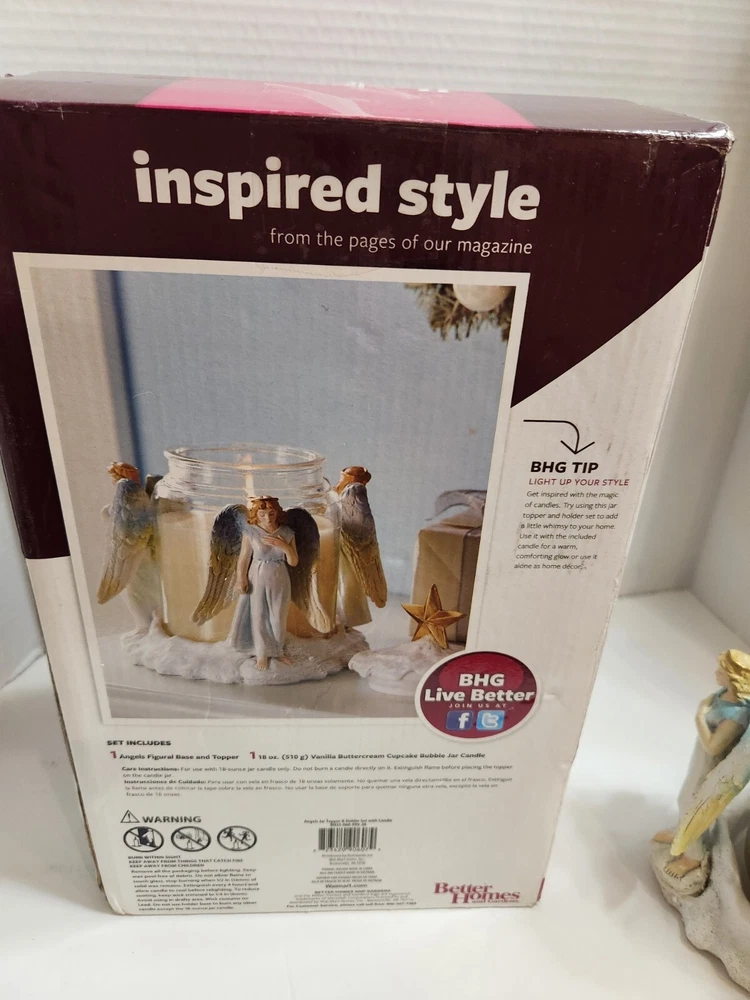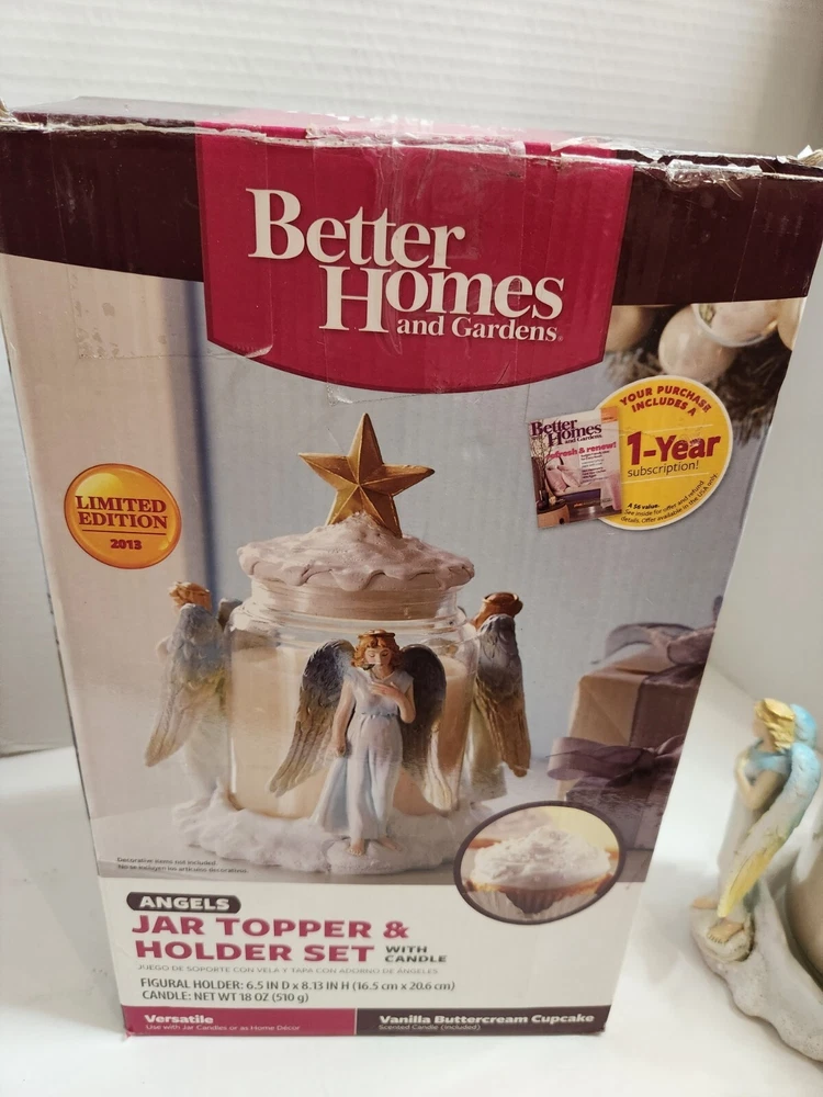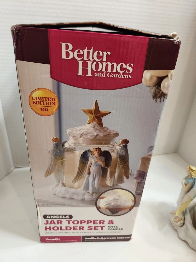 Better Homes & Gardens Jar Topper & Holder Set w/Candle in Original Box. Candle never used. Measures 6.5 inches in diameter x 8.13 inches in height. Vanilla Buttercream Cupcake scented candle. Choose USPS Ground Advantage or USPS Priority Mail.