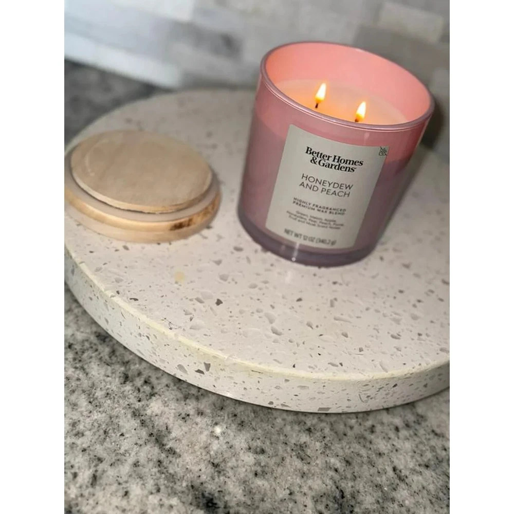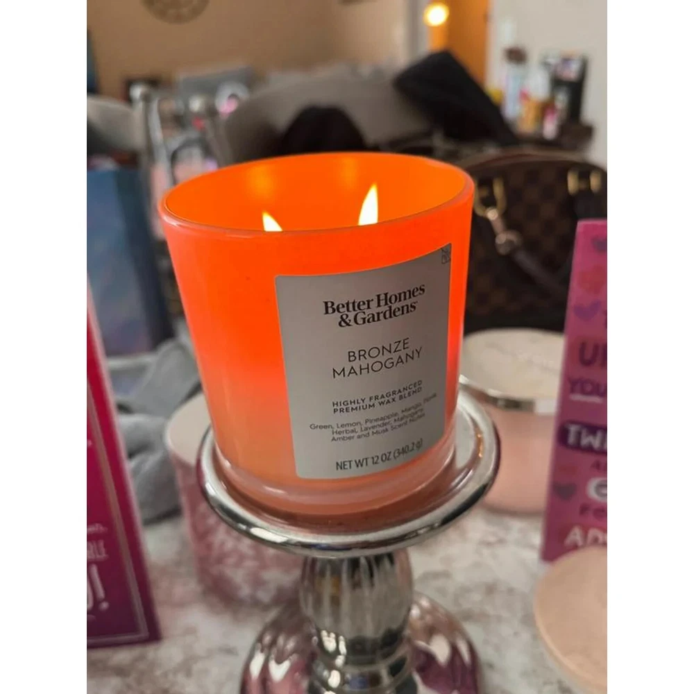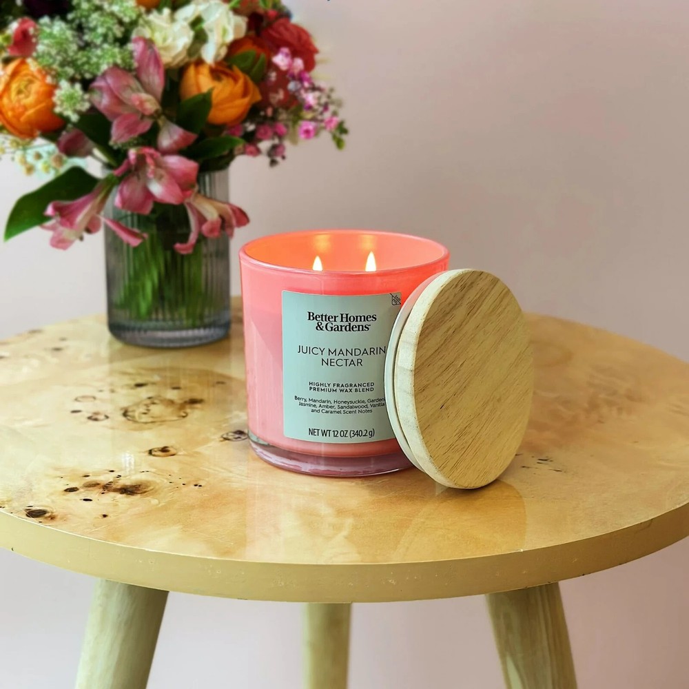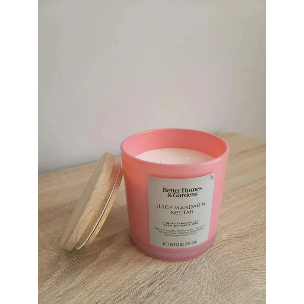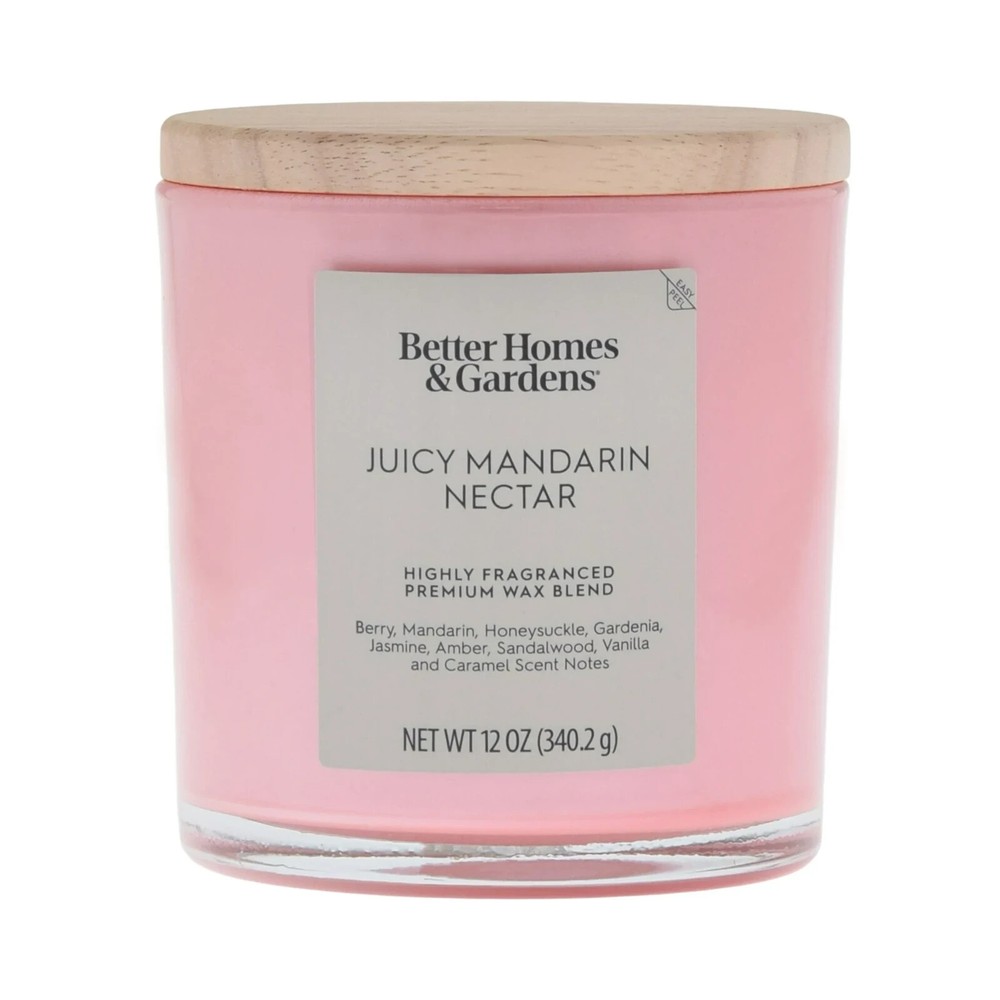 Product details Better Homes & Gardens Juicy Mandarin Nectar Scented 2-Wick 12oz Iridescent Jar Candle - Emitting a warm, golden light, this candle fills your space with an indulgent fragrance. Notes of Lemon, Lavendar, Georgia Pine, Mint, Violet, Amber, Musk, Evergreen Bark that creates a delightful atmosphere. The Sea Glass Finish Jar houses a paraffin a paraffin wax blend ideal for various rooms and décor styles. Crafted with care, this candle features versatile and contemporary, with our Sea Glass Finish design seamlessly complements diverse settings, effortlessly blending with your existing décor. Scent Notes: Berry, Mandarin, Honeysuckle, Gardenia, Jasmine, Amber, Sandalwood, Vanilla, Caramel Includes: 12oz (340.2 g) Iridescent Jar Candle Wicks: 2 Wax: Paraffin Wax Blend Burn Time: 40 Hours Why you’ll love it: Customers will love this candle for its inviting fragrance, stylish design, and consistent burn, making it a versatile choice for enhancing any space. Fragrance Pro Tip: Let the wax harden before relighting, touching, or moving. Country of Origin: Imported Dimensions: 3.94" (w) x 4.29" (h) Fill weight: 12oz (340.2 g). Item Weight: 1.77 lb.