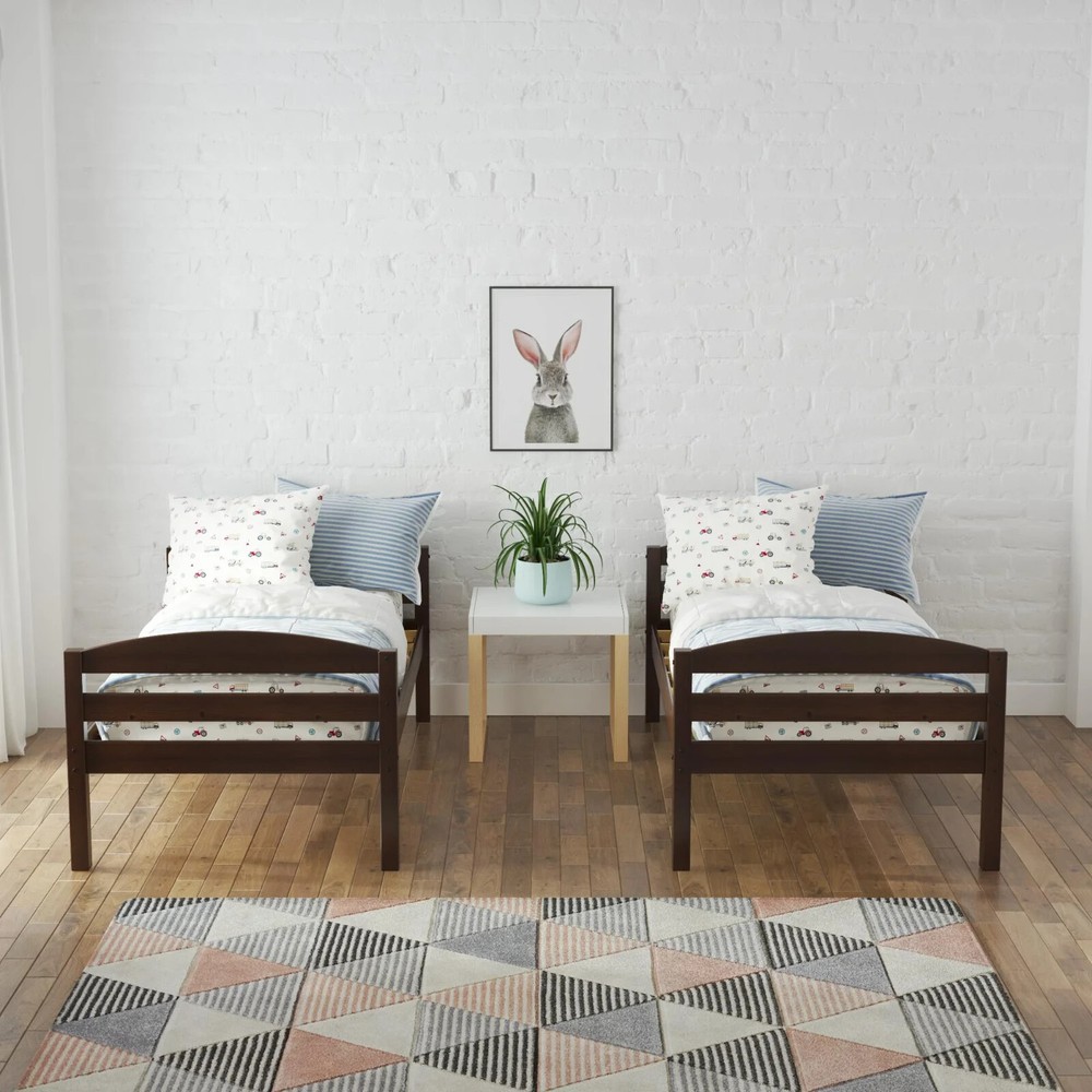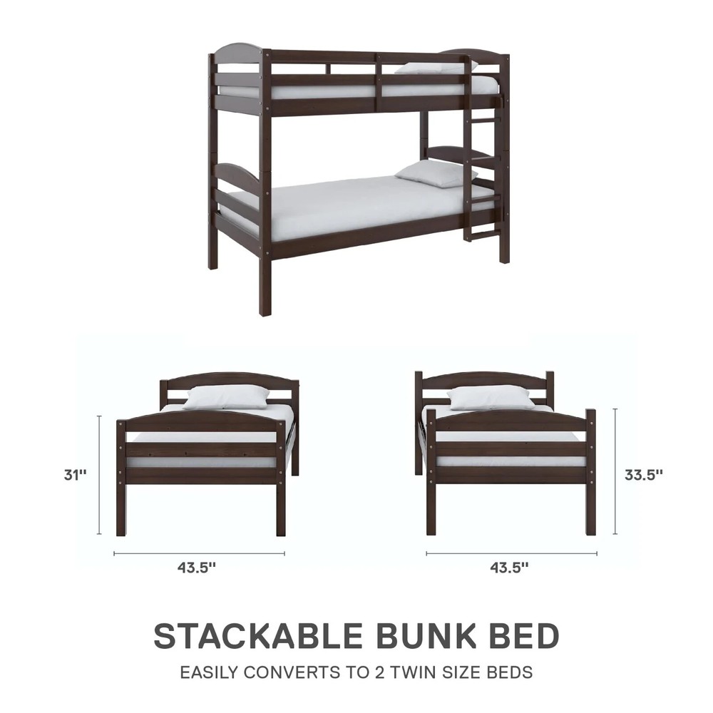Solid wood bunk bed frame with painted finish Stackable bunk bed converts into two free-standing twin size beds 12.5" high guardrail; top bunk not intended for children under 6 years old 12.5" under bed clearance for toys, storage bins or boxes Fits two twin size spring mattresses (sold separately) with a maximum thickness of 6" each. No boxspring required. Bunk bed assembled dimensions: 43.5"W x 78.5"L x 64.5"; net weight: 111 lbs. Individual bed assembled dimensions: 43.5"W x 78.5"L x 33.5"H and 31"H Ships in 1 box of 78"L x 15"W x 8"H, gross weight: 121 lbs.