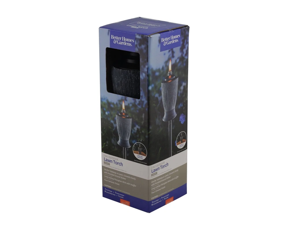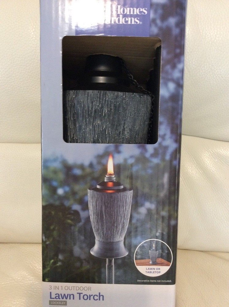One (1) Outdoor Lawn Torch by Better Homes & Gardens in Locksley Collection Illuminate your backyard with these rusic designed Locksley Torches. These unique torches plant firmly into the ground and brighten any backyard using an oil source. An excellent accent for any patio area. 3 In 1 Outdoor Lawn Torch Use for Tabletop or Lawn Converts Easily with Provided Ground Stakes Long Lasting Fiberglass Wick with Snuffer Faux Ceramic Finish For Outdoor Use Only oil is not included Maximum height is 5 feet tall Pet Free/Smoke Free New in Box