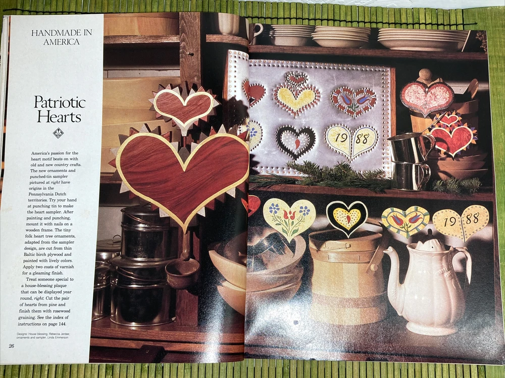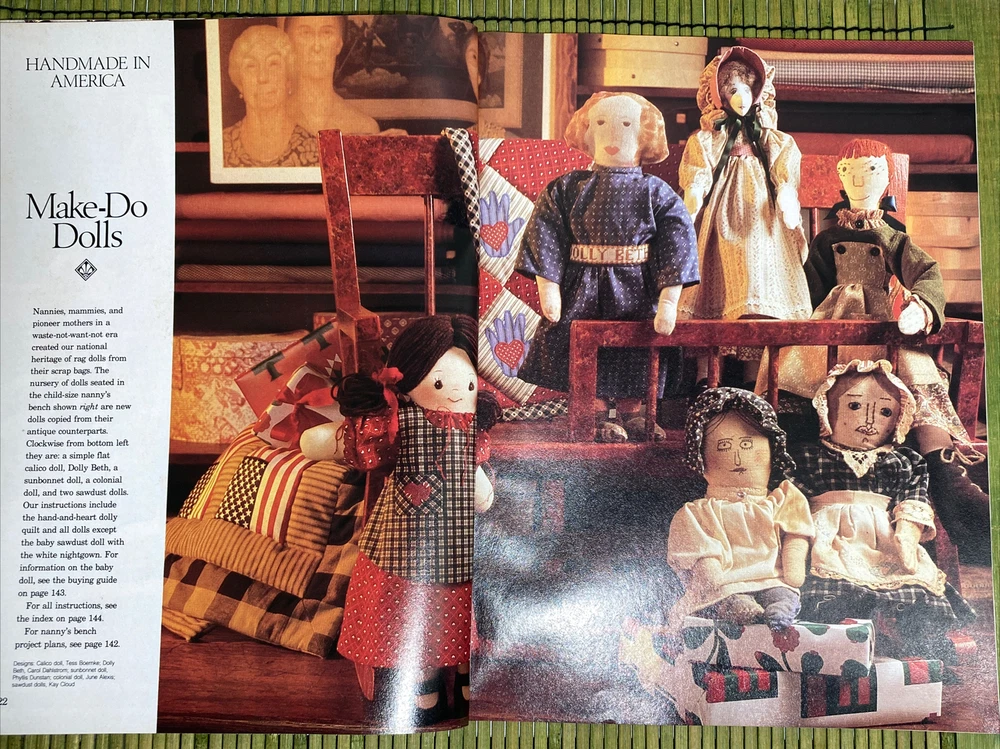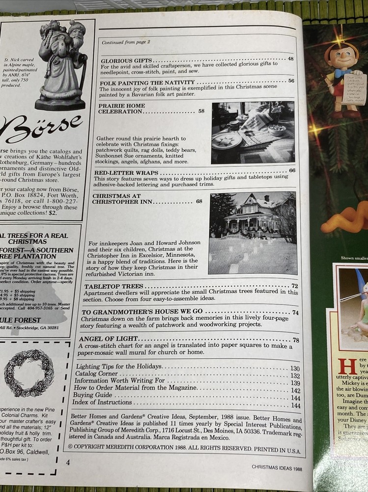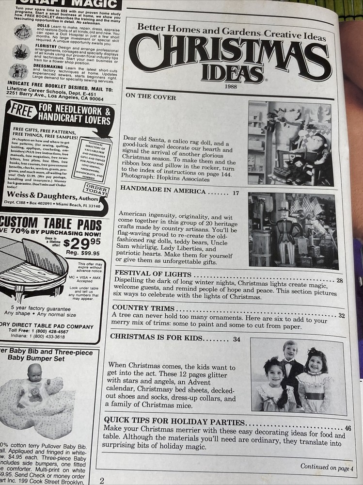 Better Homes & Gardens Magazine 1988 Christmas Ideas Country Toys Quilts Bears Folk Art Santa, Engineer Bear, Sailor Bear, Blue Jeans Bear, Prarie Sampler Cross Stitch, Double Rose Pillow & Tablecloth Cross Stitch, Angel of Light Paper Mosaic Mural, Knitted Christmas Goose Stocking and Afghan, Amish Doll Quilts and Potholders to name a few This is pre-owned and in good condition. Creasing from turning pages and no writing. Pages have yellowed from age as well as some foxing. No odor. Save money on combined shipping when you buy multiple craft kits, patterns, fabric and supplies! Yay! :-)