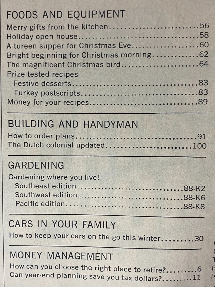 Better Homes & Gardens Magazine December 1965 The Family Christmas This December 1965 issue of Better Homes & Gardens is a festive holiday edition , packed with seasonal recipes, home improvement ideas, gardening tips, and financial advice . With a focus on traditional family Christmas celebrations, holiday entertaining, and practical winter planning , this issue is a perfect collectible for vintage magazine enthusiasts, mid-century homemakers, and holiday decorators . Item Details: Condition: Good – Includes address label, pages intact Authenticity: The item pictured is the exact one you will receive Protection: Comes with a plastic protective covering Key Features: Foods & Equipment: Merry Gifts from the Kitchen – Homemade food gifts for the holiday season. Holiday Open House – Hosting the perfect Christmas gathering. A Tureen Supper for Christmas Eve – A cozy and festive meal idea. Bright Beginning for Christmas Morning – Breakfast ideas to start the holiday right. The Magnificent Christmas Bird – Tips for preparing the perfect holiday turkey. Prize-Tested Recipes – Award-winning holiday dishes. Festive Desserts – Sweet treats for Christmas celebrations. Turkey Postscripts – Creative ways to use holiday leftovers. Money for Your Recipes – Opportunities to submit and profit from home recipes. Building & Handyman: How to Order Plans – Guidance for home improvement projects. The Dutch Colonial Updated – Modernized design ideas for Dutch colonial homes. Gardening: Gardening Where You Live! – Regional gardening tips tailored to your climate. Southeast Edition, Southwest Edition, Pacific Edition – Customized gardening advice for different U.S. regions. Cars in Your Family: How to Keep Your Cars on the Go This Winter – Winter car maintenance and safety tips. Money Management: How Can You Choose the Right Place to Retire? – Factors to consider when planning for retirement. Can Year-End Planning Save You Tax Dollars? – Financial strategies to maximize savings before the new year. Shipping & Handling: Combined shipping is available upon request. The magazine will be securely packaged with protective covering. This classic 1965 Christmas edition of Better Homes & Gardens is a fantastic piece for vintage collectors, home chefs, and mid-century holiday enthusiasts , making it a timeless guide to holiday traditions, entertaining, and practical living . Foods and Equipment Merry gifts from the kitchen Holiday open house A tureen supper for Christmas Eve Bright beginning for Christmas morning The magnificent Christmas bird Prize tested recipes Festive desserts Turkey postscripts Money for your recipes Building and Handyman How to order plans The Dutch colonial updated Gardening Gardening where you live! Southeast edition Southwest edition Pacific edition Cars in Your Family How to keep your cars on the go this winter Money Management How can you choose the right place to retire? Can year-end planning save you tax dollars?