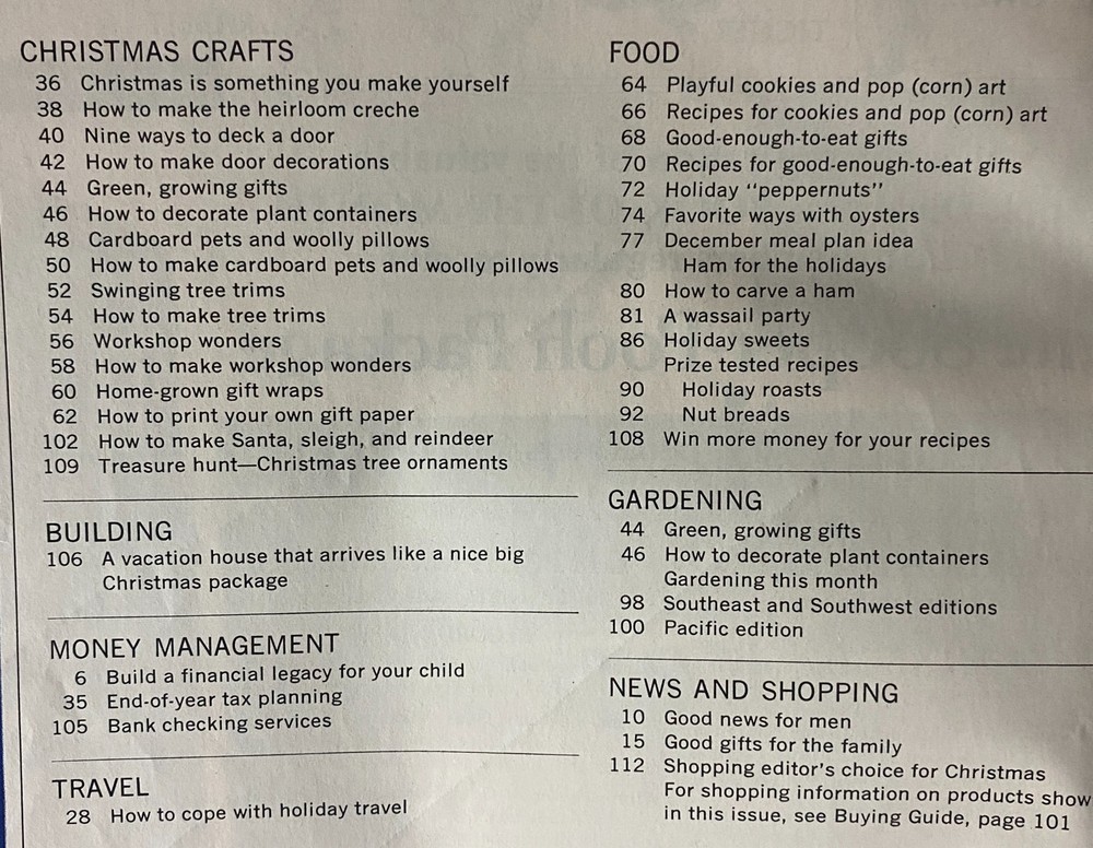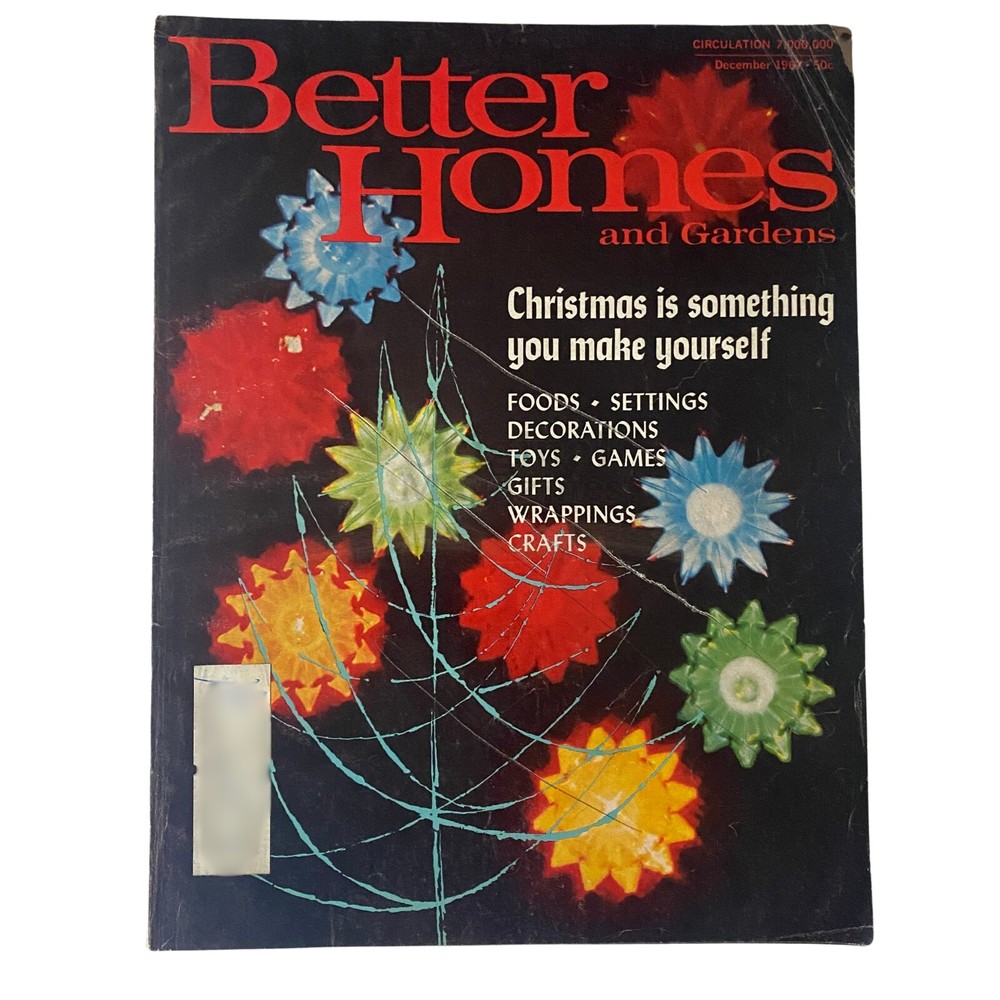 Better Homes & Gardens Magazine December 1967 Green, Growing Gifts This December 1967 issue of Better Homes & Gardens is a festive holiday edition , featuring DIY Christmas crafts, creative home décor, holiday meal planning, gardening tips, and financial advice . With a focus on handmade holiday traditions, seasonal entertaining, and practical money management , this issue is a perfect collectible for vintage magazine enthusiasts, mid-century homemakers, and holiday decorators . Item Details: Condition: Good – Includes address label, pages intact Authenticity: The item pictured is the exact one you will receive Protection: Comes with a plastic protective covering Key Features: Christmas Crafts & DIY Projects: Christmas is Something You Make Yourself – Handmade holiday decorations and gifts. How to Make the Heirloom Creche – Step-by-step guide to crafting a nativity scene. Nine Ways to Deck a Door – Unique ideas for decorating doors for Christmas. How to Make Door Decorations – DIY wreaths, garlands, and festive accents. Green, Growing Gifts – Living plant gifts and decorative containers. How to Decorate Plant Containers – Creative ways to present potted plants as gifts. Cardboard Pets and Woolly Pillows – Fun, crafty gifts for children. Swinging Tree Trims – Handmade ornaments and tree decorations. Workshop Wonders – Festive woodworking projects for gifting. Home-Grown Gift Wraps – How to print your own wrapping paper. How to Make Santa, Sleigh, and Reindeer – Classic Christmas craft ideas. Treasure Hunt—Christmas Tree Ornaments – A guide to collectible and handmade ornaments. Holiday Food & Entertaining: Playful Cookies and Pop (Corn) Art – Creative cookie and popcorn treat ideas. Recipes for Cookies and Pop (Corn) Art – Festive snacks for the holidays. Good-Enough-to-Eat Gifts – Homemade edible presents. Recipes for Good-Enough-to-Eat Gifts – Step-by-step instructions for delicious food gifts. Holiday “Peppernuts” – A traditional spiced cookie recipe. Favorite Ways with Oysters – Seasonal seafood dishes. December Meal Plan Idea – A full holiday meal plan for festive gatherings. Ham for the Holidays – Cooking and carving tips for a perfect holiday ham. A Wassail Party – How to host a traditional wassail celebration. Holiday Sweets – Classic and creative Christmas desserts. Prize-Tested Recipes – Award-winning dishes for the holiday season. Holiday Roasts – Cooking methods and serving suggestions. Nut Breads – Festive bread recipes for Christmas. Win More Money for Your Recipes – A reader competition for the best holiday recipes. Home & Financial Planning: A Vacation House That Arrives Like a Nice Big Christmas Package – A unique holiday home concept. Build a Financial Legacy for Your Child – Long-term financial planning for families. End-of-Year Tax Planning – Tips for maximizing tax benefits before the new year. Bank Checking Services – Understanding modern banking options. Travel & Shopping: How to Cope with Holiday Travel – Travel tips for a stress-free holiday season. Good News for Men – Holiday gifts and shopping ideas for men. Good Gifts for the Family – Recommended presents for loved ones. Shopping Editor’s Choice for Christmas – Curated holiday shopping recommendations. For Shopping Information on Products Shown in This Issue, See Buying Guide – A helpful guide for holiday purchases. Gardening: Green, Growing Gifts – A guide to gifting plants and flowers. How to Decorate Plant Containers – Creative presentation ideas for potted plants. Gardening This Month – Seasonal gardening advice. Southeast and Southwest Editions / Pacific Edition – Regional gardening tips for different climates. Shipping & Handling: Combined shipping is available upon request. The magazine will be securely packaged with protective covering. This classic 1967 holiday edition of Better Homes & Gardens is a wonderful collectible for fans of vintage Christmas décor, holiday crafts, mid-century recipes, and practical holiday planning , making it a must-have for those who appreciate timeless holiday traditions . Christmas Crafts Christmas is something you make yourself How to make the heirloom creche Nine ways to deck a door How to make door decorations Green, growing gifts How to decorate plant containers Cardboard pets and woolly pillows How to make cardboard pets and woolly pillows Swinging tree trims How to make tree trims Workshop wonders How to make workshop wonders Home-grown gift wraps How to print your own gift paper How to make Santa, sleigh, and reindeer Treasure hunt—Christmas tree ornaments Food Playful cookies and pop (corn) art Recipes for cookies and pop (corn) art Good-enough-to-eat gifts Recipes for good-enough-to-eat gifts Holiday “peppernuts” Favorite ways with oysters December meal plan idea Ham for the holidays How to carve a ham A wassail party Holiday sweets Prize tested recipes Holiday roasts Nut breads Win more money for your recipes Building A vacation house that arrives like a nice big Christmas package Money Management Build a financial legacy for your child End-of-year tax planning Bank checking services Travel How to cope with holiday travel Gardening Green, growing gifts How to decorate plant containers Gardening this month Southeast and Southwest editions Pacific edition News and Shopping Good news for men Good gifts for the family Shopping editor’s choice for Christmas For shopping information on products shown in this issue, see Buying Guide
