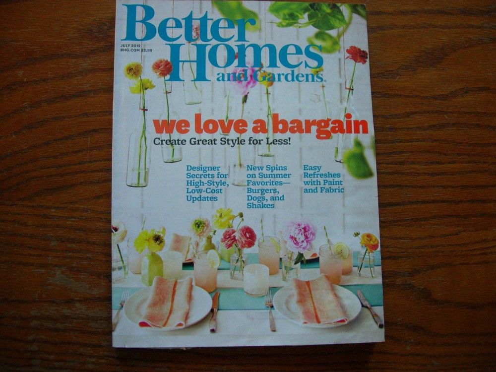You are bidding on a Better Homes & Gardens Magazine. It is the whole magazine you will be getting. It is dated July 2012 and is good condition. It has 186 pages. Buyer pays actual shipping and nothing more. Paypal shipped ASAP. Happy Bidding!
