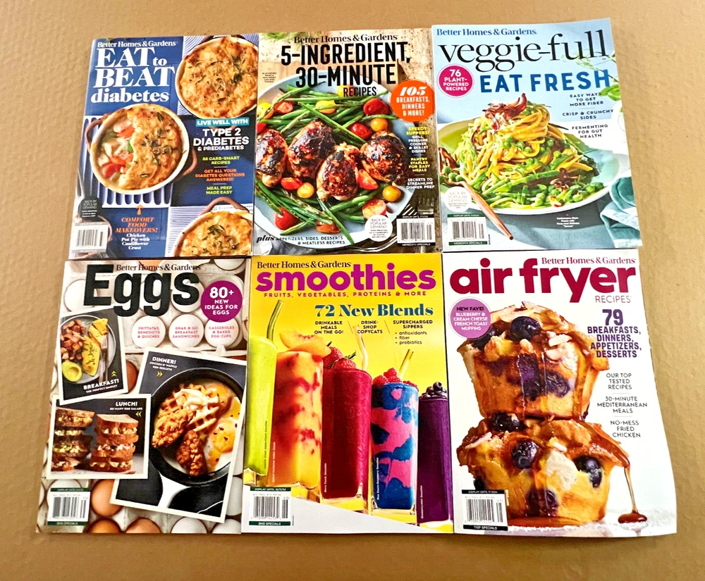 Better Homes & Gardens • Lot of 6 Magazines "EAT TO BEAT DIABETES" • LIVE WELL WITH TYPE 2 DIABETES & MORE! "SMOOTHIES" • 72 NEW BLENDS! • FRUITS, VEGETABLES & PROTEINS & MORE! "5-INGREDIENT, 30 MINUTE RECIPES" • 105 BREAKFASTS DINNERS & MORE! "VEGGIE-FULL" • EAT FRESH 76 PLANT POWERED RECIPES & MORE! "EGGS - BREAKFAST, LUNCH & DINNER" • 80+ NEW IDEAS FOR EGGS & MORE! "AIR FRYER RECIPES" • 79 BREAKFASTS, DINNERS APPETIZERS, DESSERTS & MORE! MAGAZINE NEWSSTAND COPIES With Normal Shelf/Storage Wear The package is shipped from Minnesota so we are usually charged a distance premium to most destinations by the shipping services over which we have no control. We do not make money on shipping. We appreciate a five star feedback for the five star product and service we strive to deliver. THANK YOU! We leave feedback after feedback has been left for us by the purchaser.