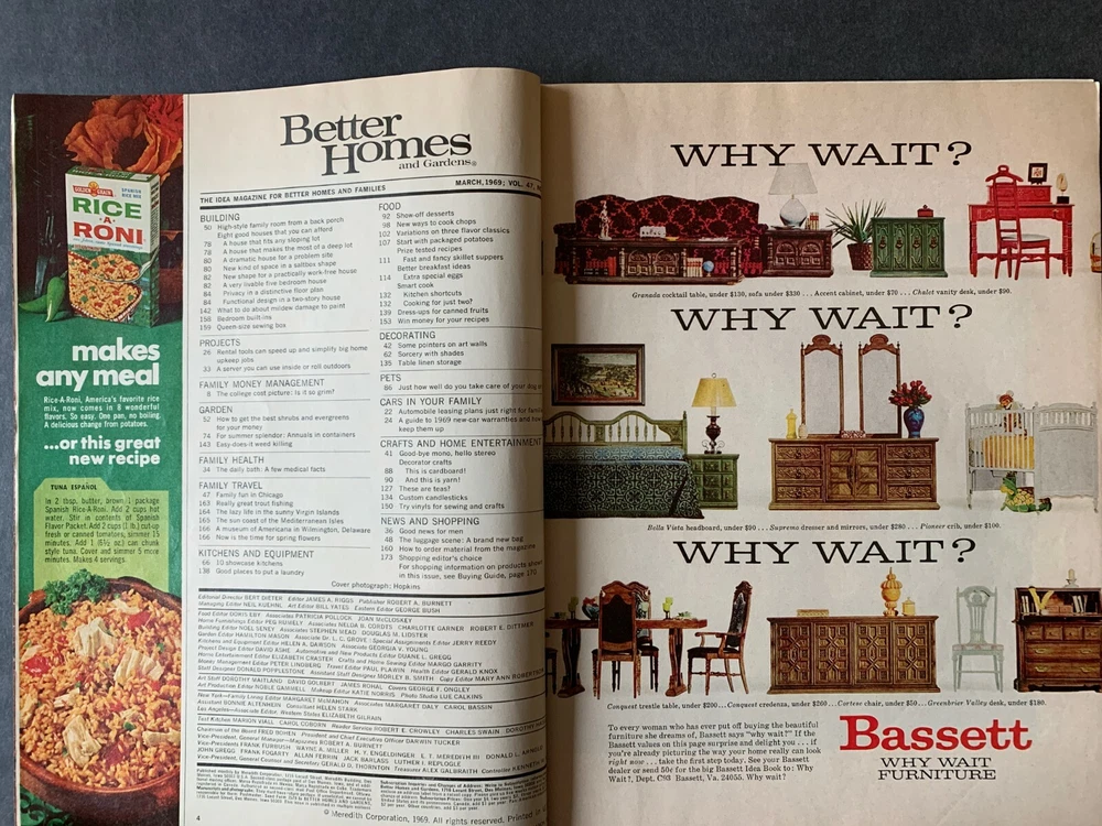 Collect a piece of history! Better Homes and Gardens Magazine March 1969 Features: 10 Showcase Kitchens, A Step By Step Plan To Pay College Costs, Automobile Leasing Plans Just Right For Families, The Daily Bath: Some Medical Facts That Could Astonish You, Show-Off Desserts For Your Family Or A Party, Grow Annuals In Pots Planters & Baskets, Crafty Craft Ideas Recipes: Chutney Grilled Lamb Chops, Pumpkin Squares, Peach Shortcakes, Steak & Zucchini Supper, Pork Chops With Saffron Rice, Mandarin Crown Ads: Armstrong, Maytag, Bassett, Sears, Chevrolet, Drexel, GM, GE, Ethan Allen, Franciscan, Pillsbury, Corning, Kleenex, Avon Good vintage condition. All pages are intact. Scuffs and discolorations. Shipped with USPS. Will combine shipping, please send message with your order. Please visit our store to see more: https://www.ebay.com/str/historyinprogress