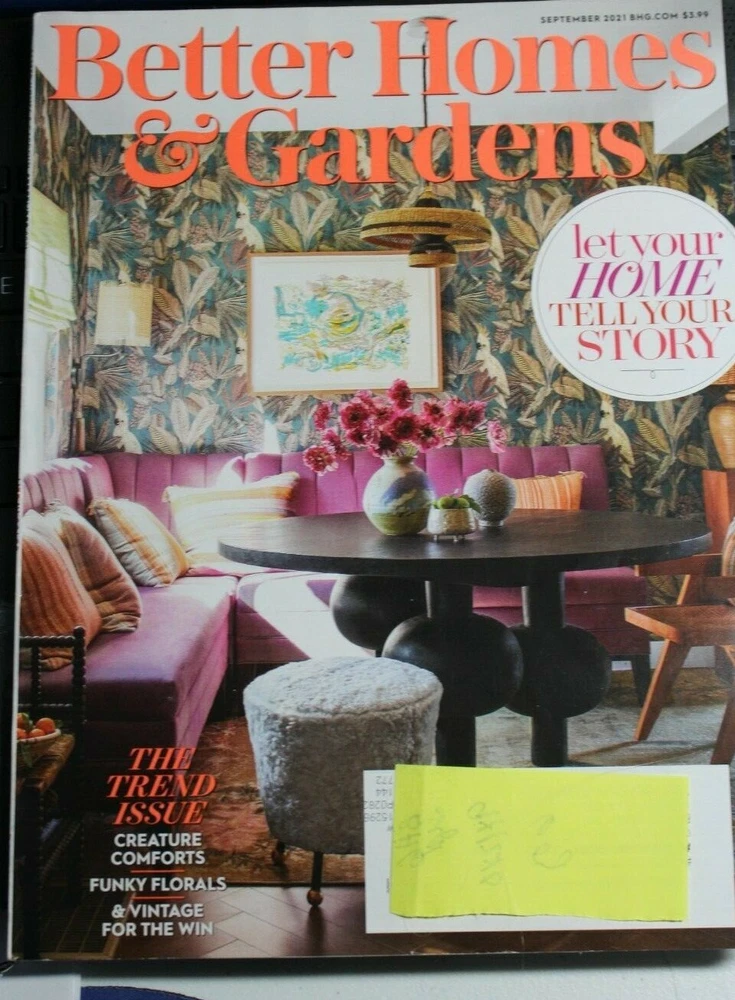 Better Homes and Gardens Magazine September, 2021 This is the Trend Issue Creature Comforts Funky Florals Everything old is new again 108 Pages Thank you for viewing our site ... We appreciate you as a customer.. if you have any questions, please email and we will respond as soon as possible. We are a Pet free and smoke free home We only accept payment through PayPal. We ship the day following your payment clears in PayPal. We appreciate your business.