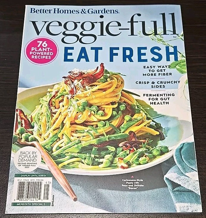 The product is the "Better Homes & Gardens Magazine Veggie-Full 76 Recipes," a publication focused on home and garden content with a specific emphasis on vegetarian recipes. With "Better Homes & Gardens" as the publication name and falling under the genre of Home & Garden, readers can expect a variety of plant-based dishes and cooking inspiration within its pages. The magazine likely offers a collection of 76 vegetarian recipes to cater to individuals looking to incorporate more vegetables into their diets, making it a valuable resource for those seeking to explore meat-free meal options.